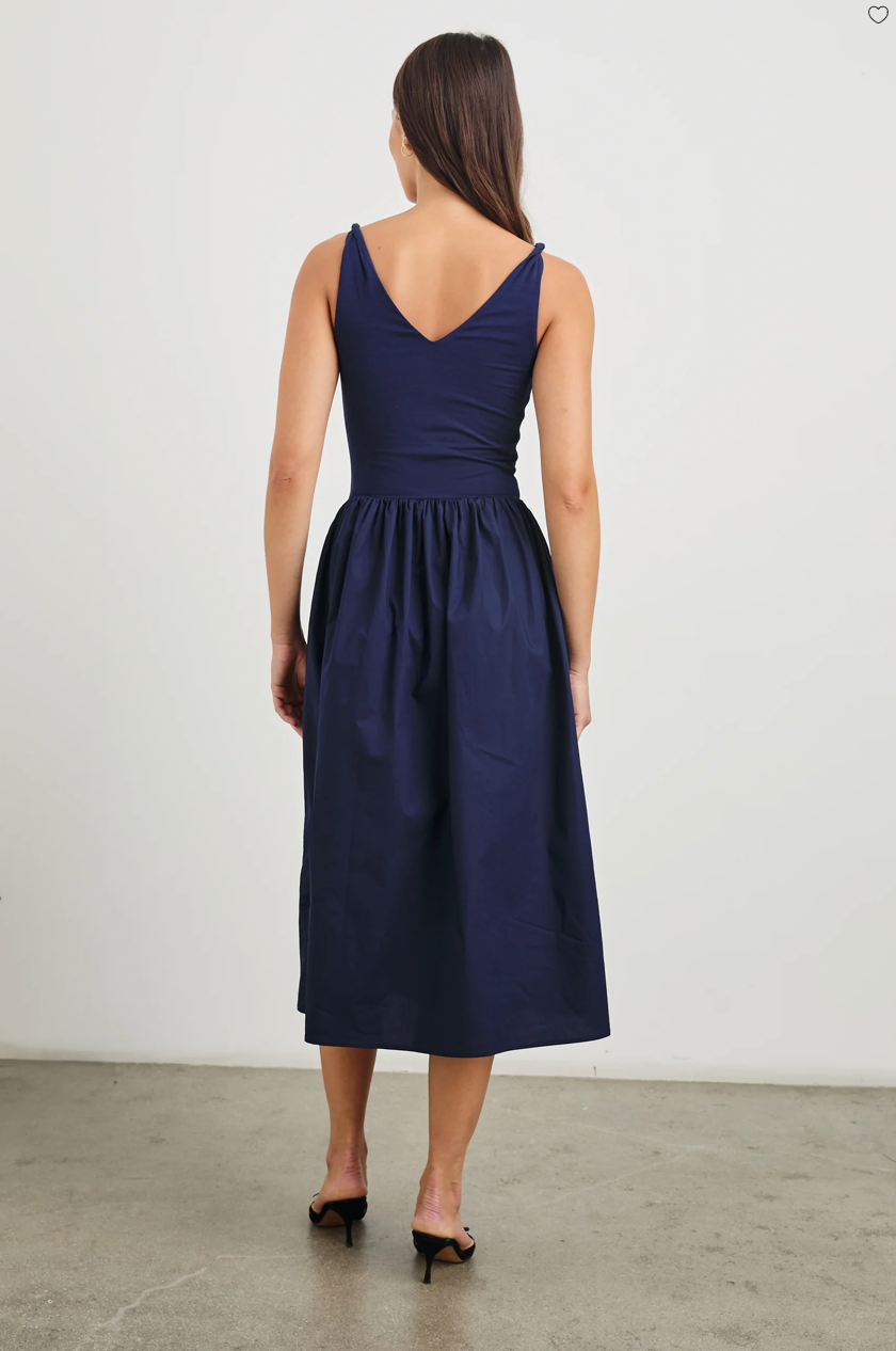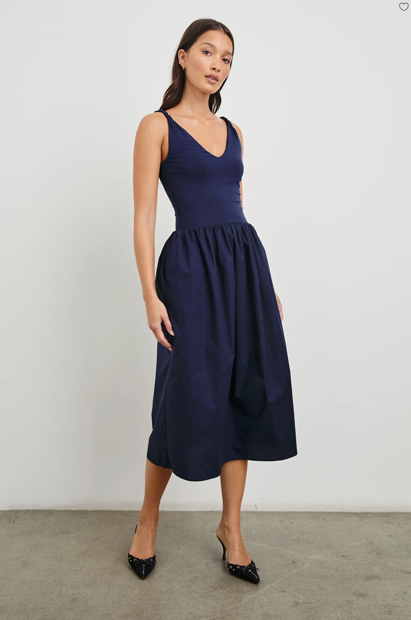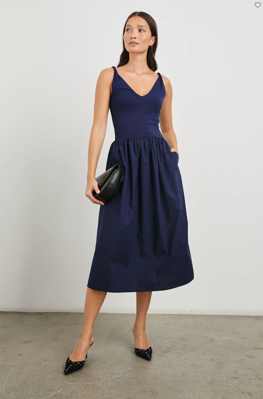 The Franca Dress emphasizes effortless elegance, combining an ultra-soft jersey cotton bodice with a lightweight poplin skirt for all-day comfort. Featuring twisted jersey straps, a flattering dropped waist and on-seam pockets for convenience, this midi, bodycon dress is a must for the modern woman on the go.