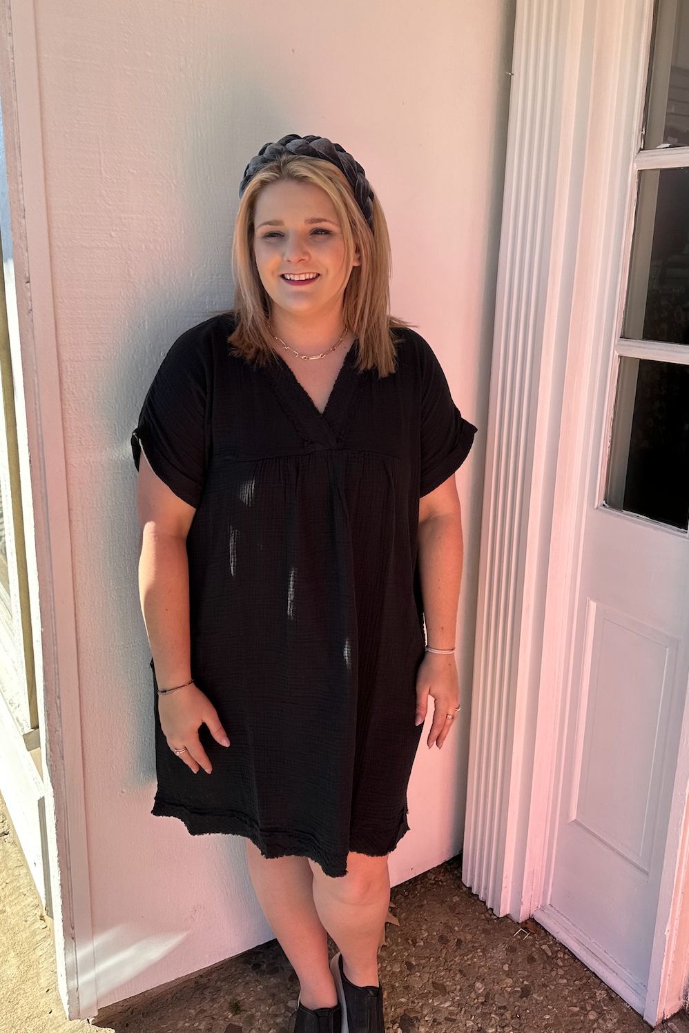 Gauze rolled short sleeve raw edge vneck dress available in traditional & curvy