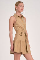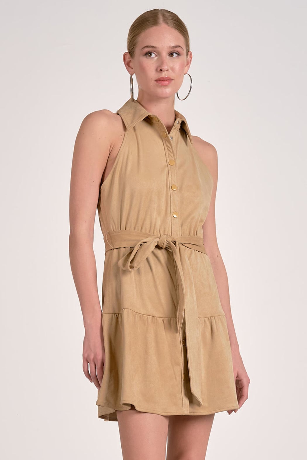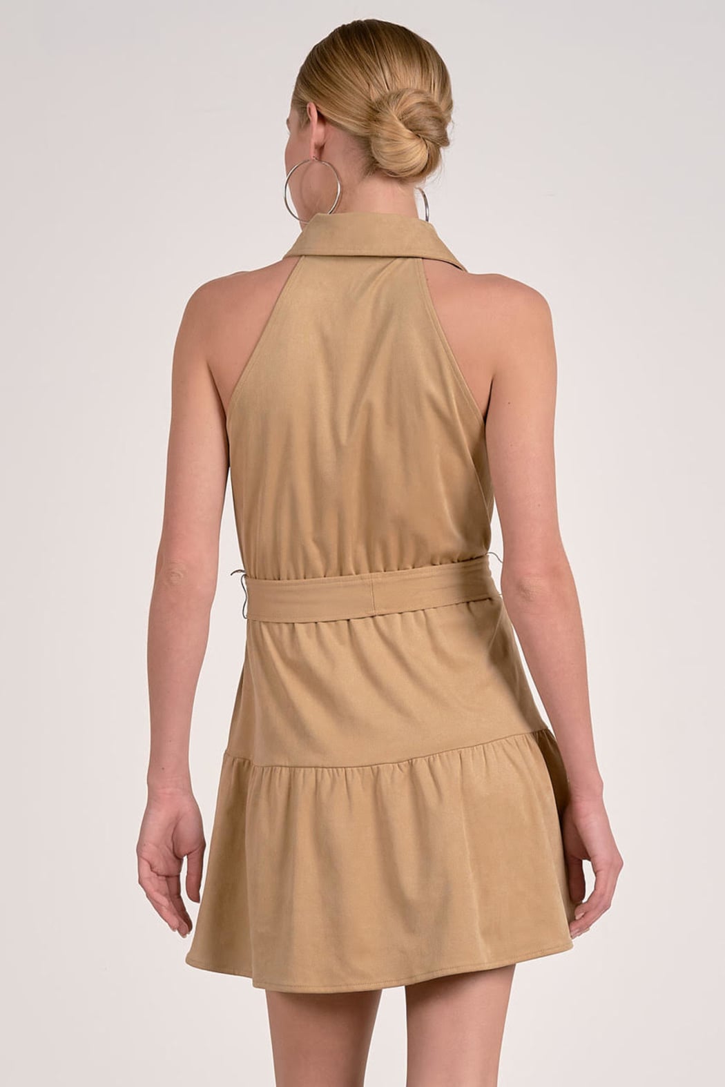 Effortless, sun-kissed elegance starts with the Halter Button-Down Mini Dress in Sand. Crafted from a soft faux-suede–feel fabric, this chic mini blends sophistication with an easygoing vibe you can wear anywhere. The halter neckline offers a flattering, modern twist, while the collared detail and button-down front add a touch of tailored charm.