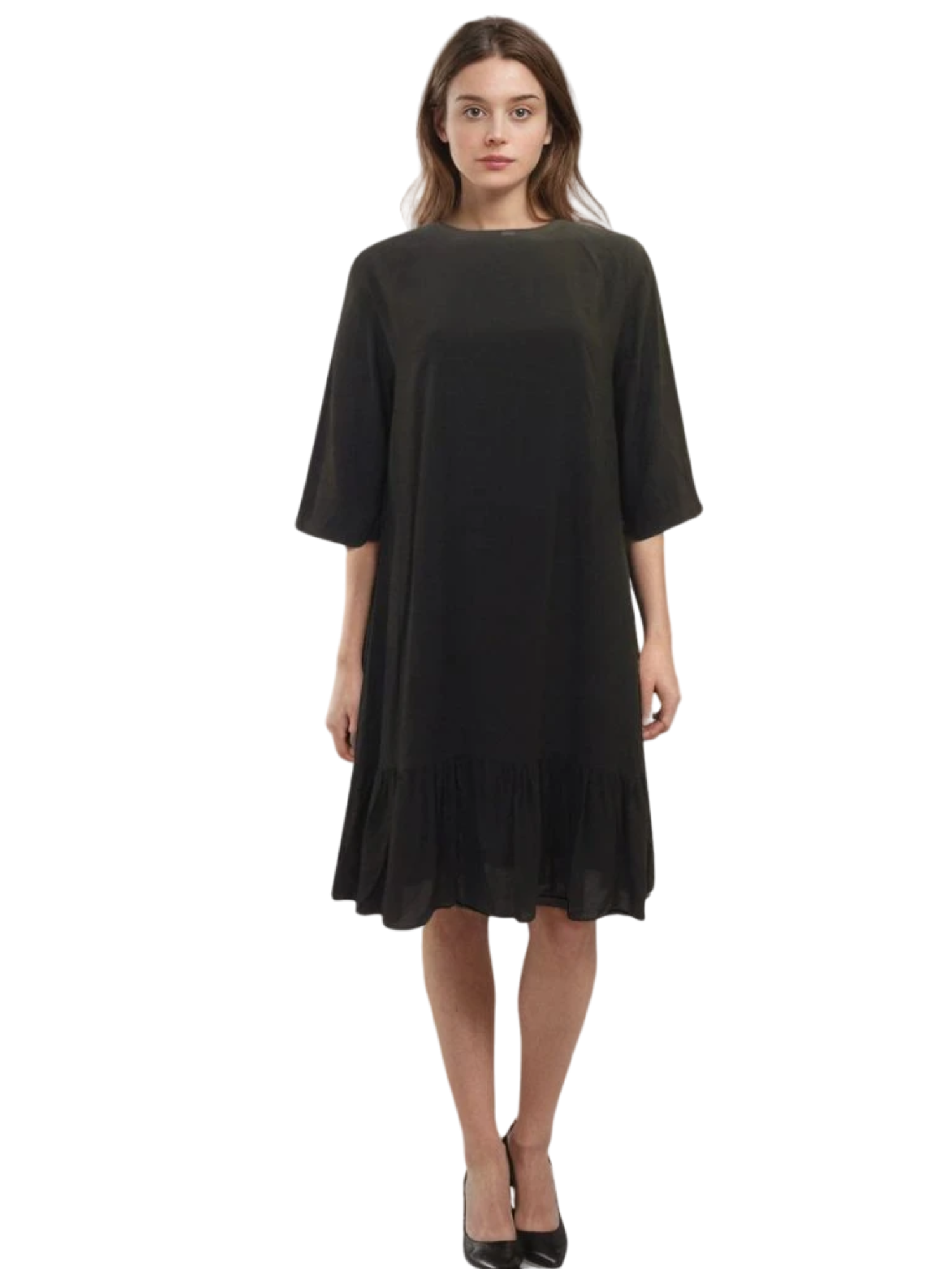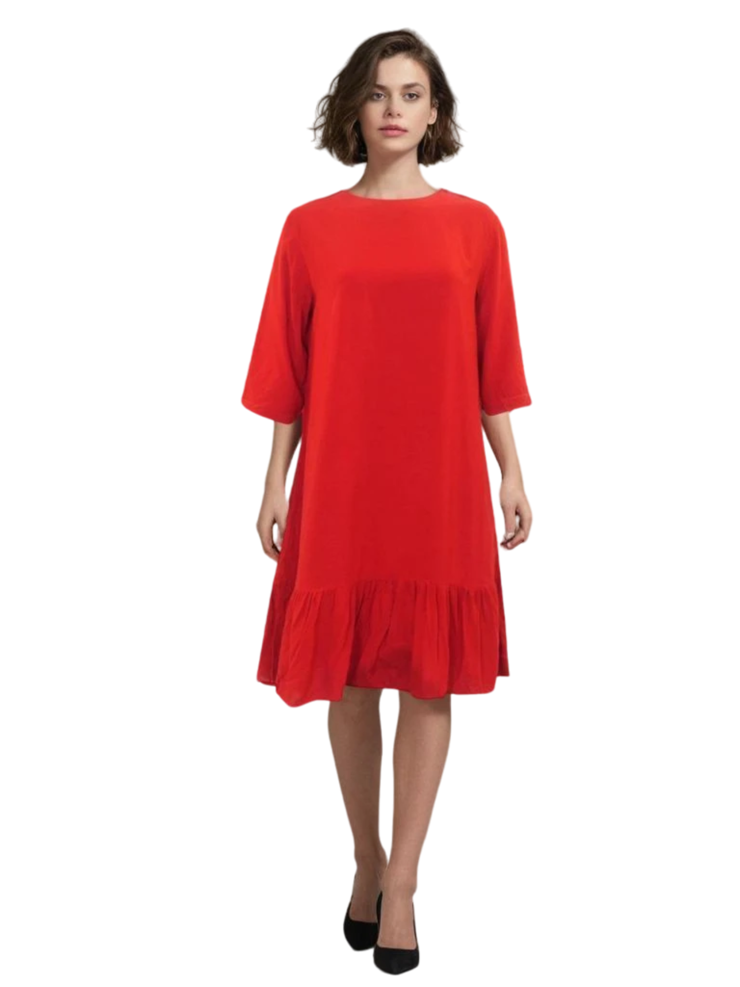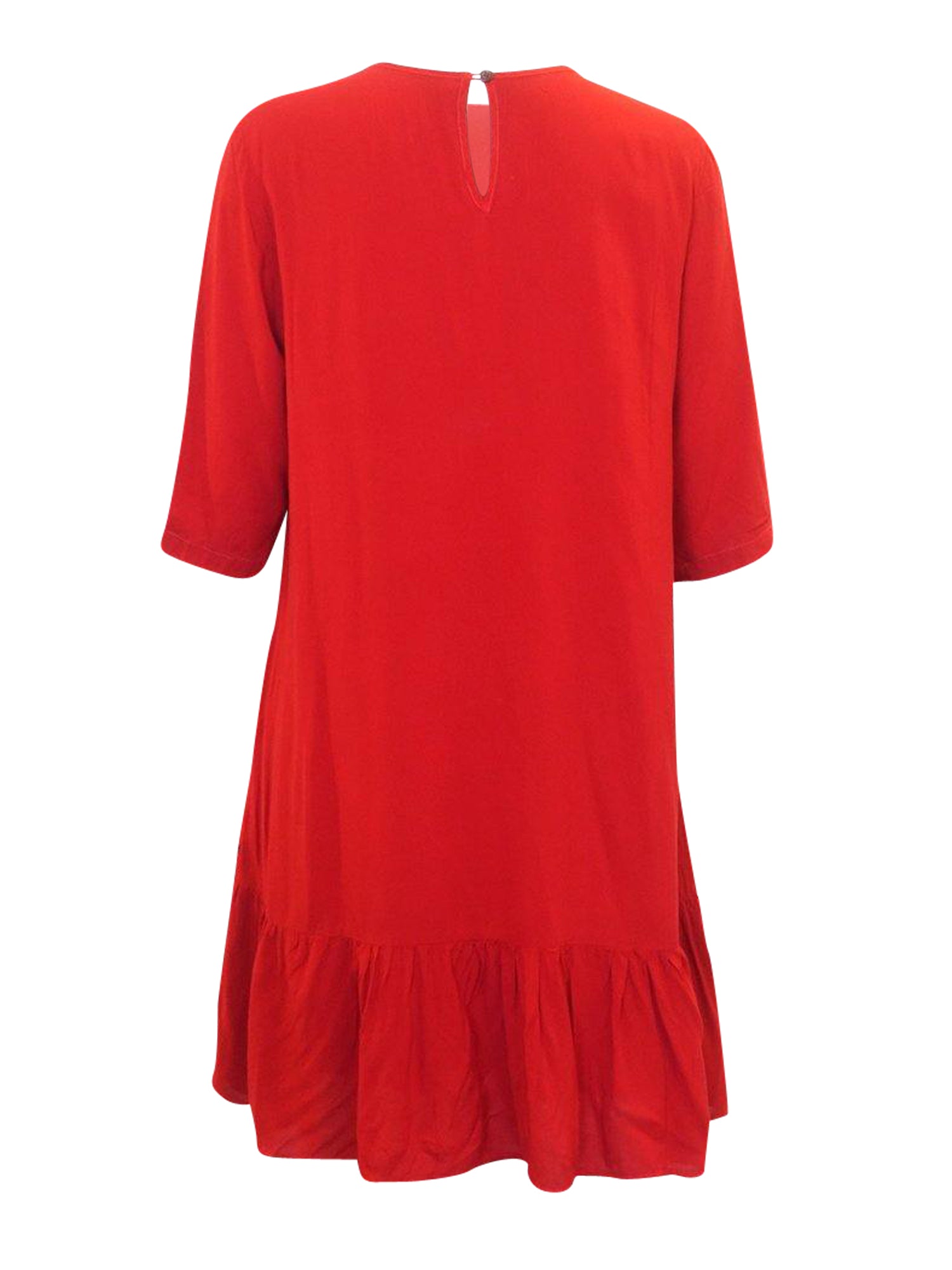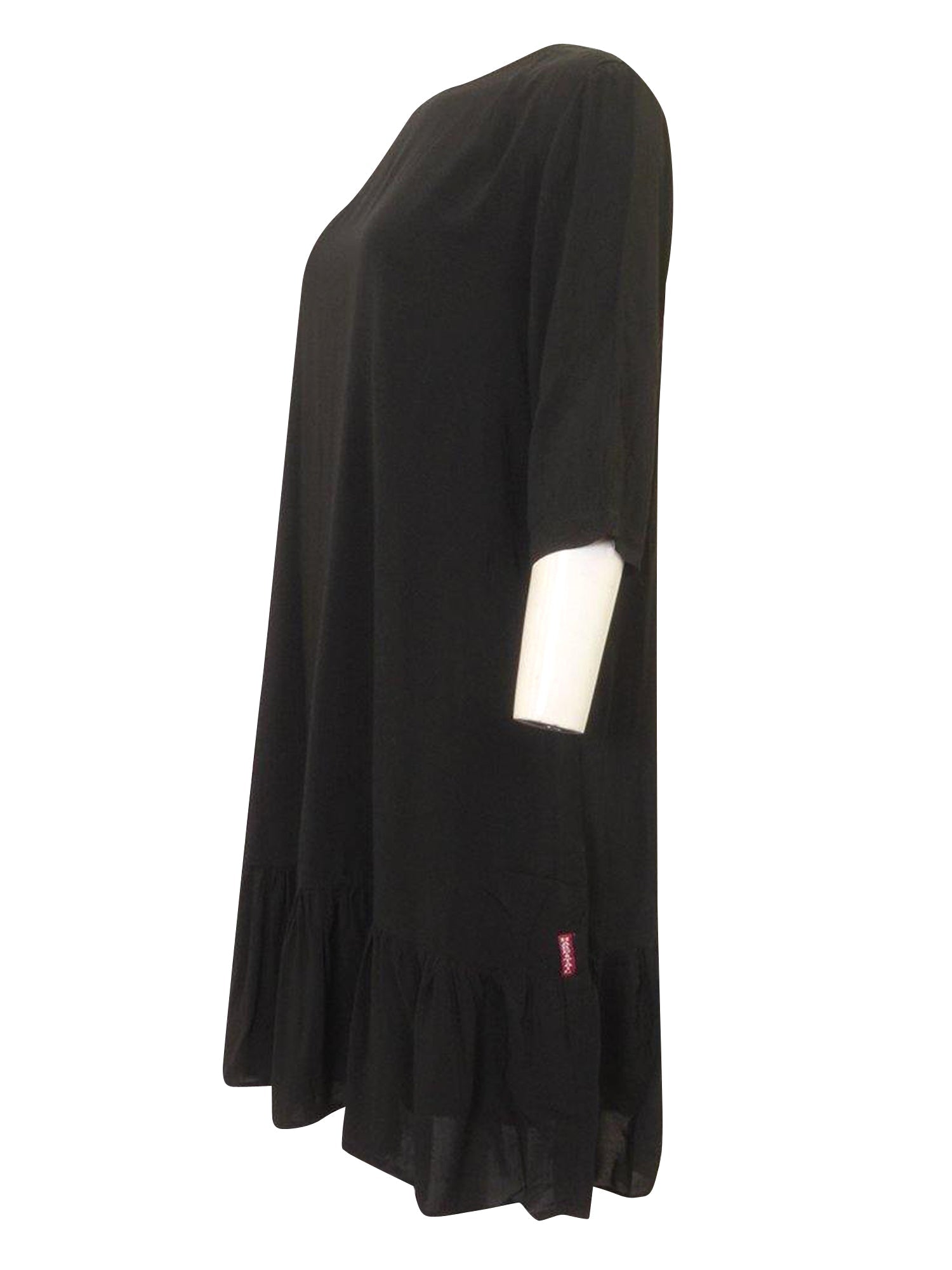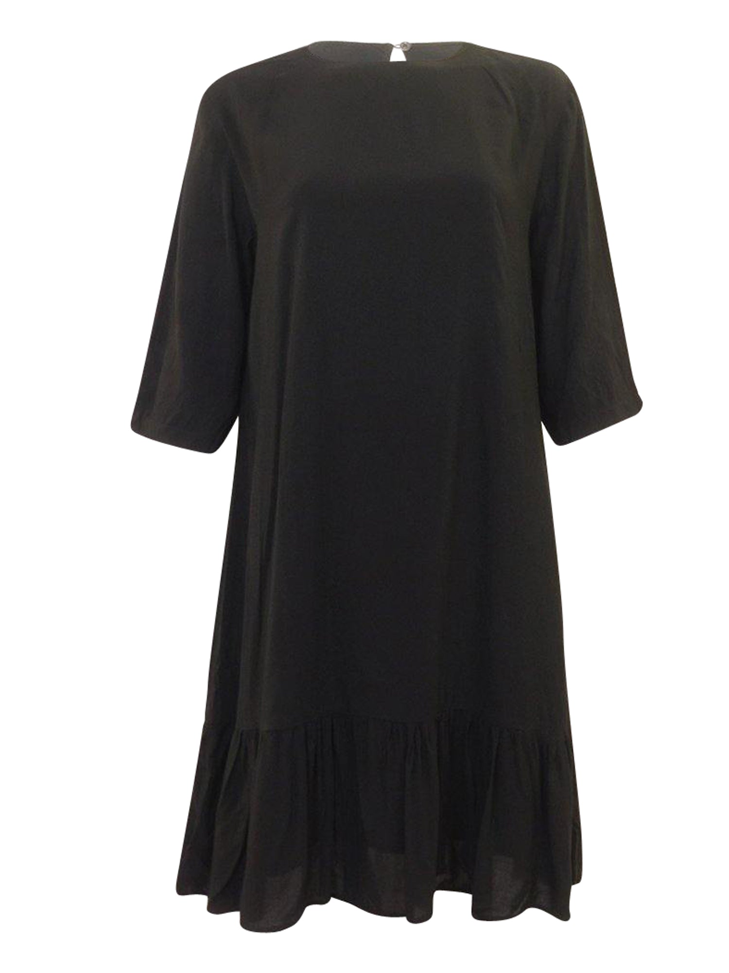 Lightweight flowy dress with a ruffled tier at the bottom. Relaxed fit with wide sleeves.