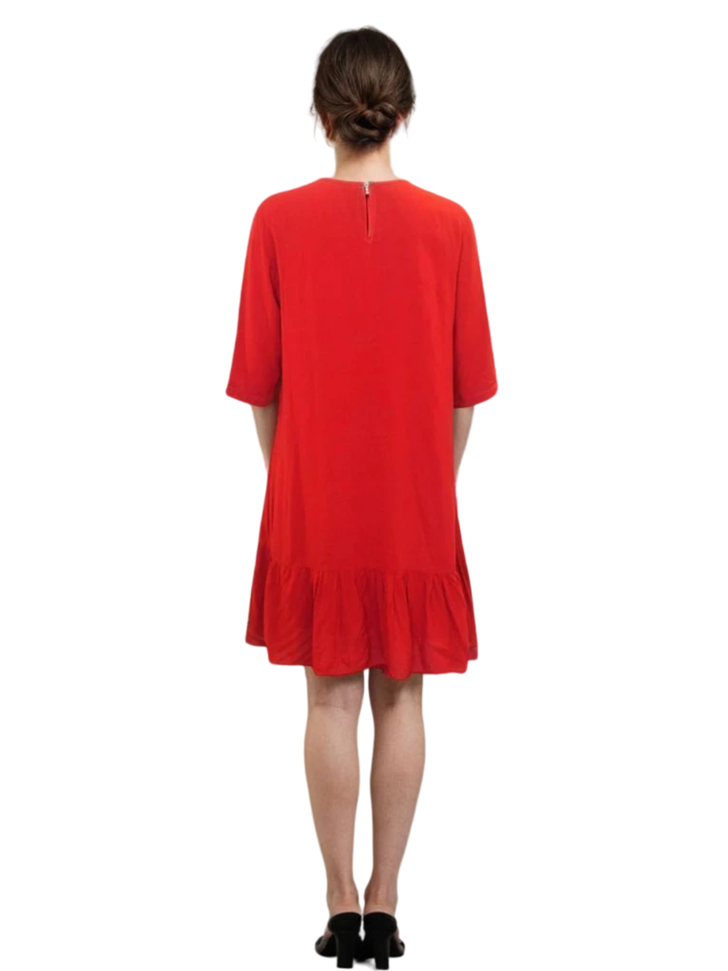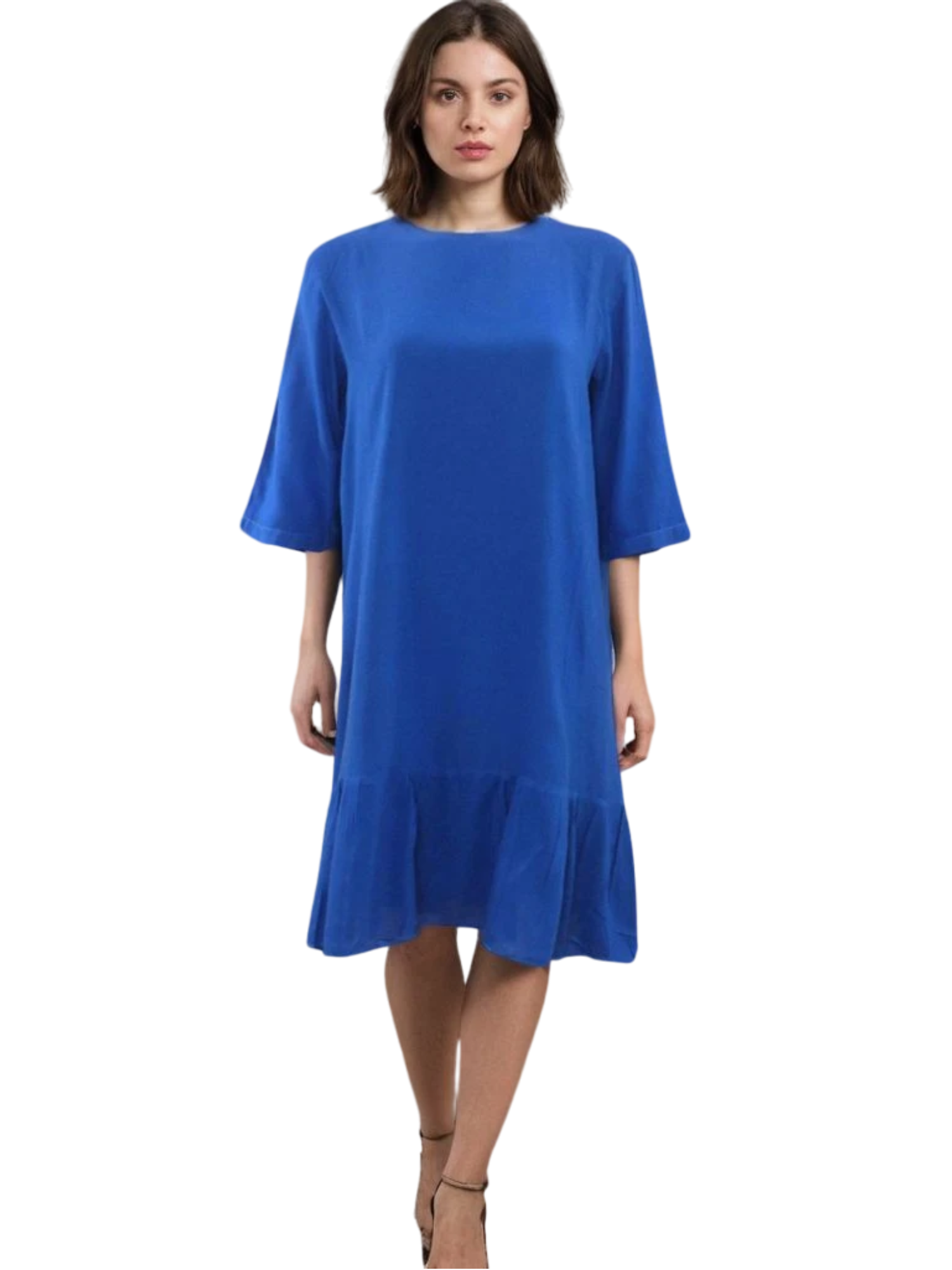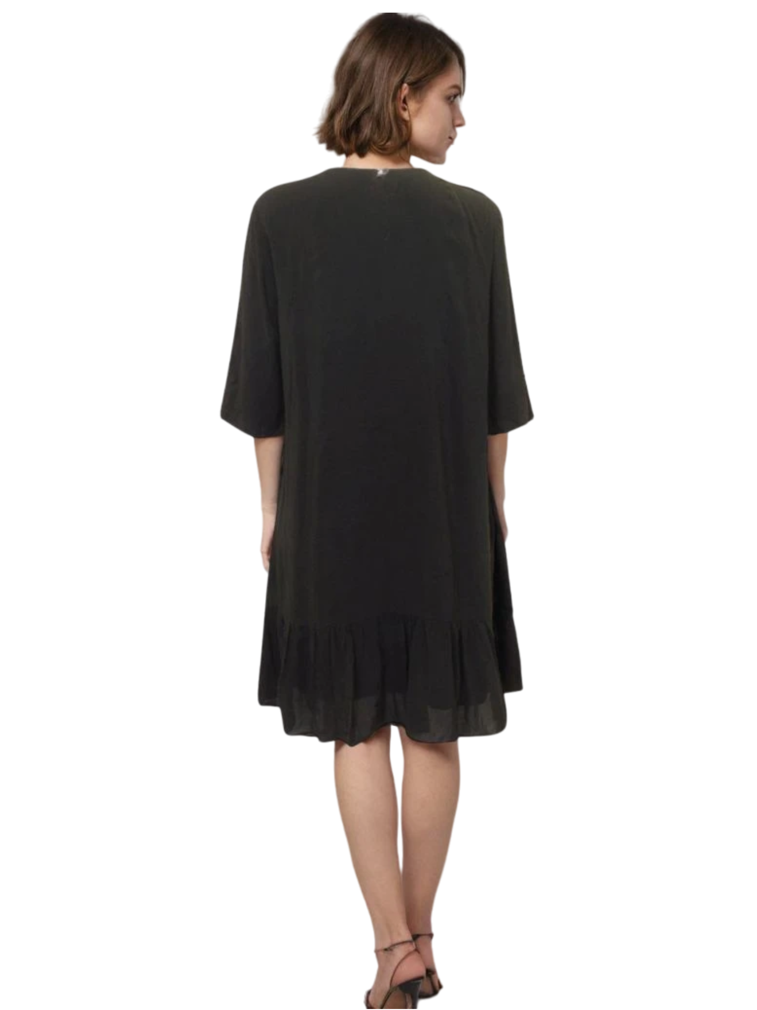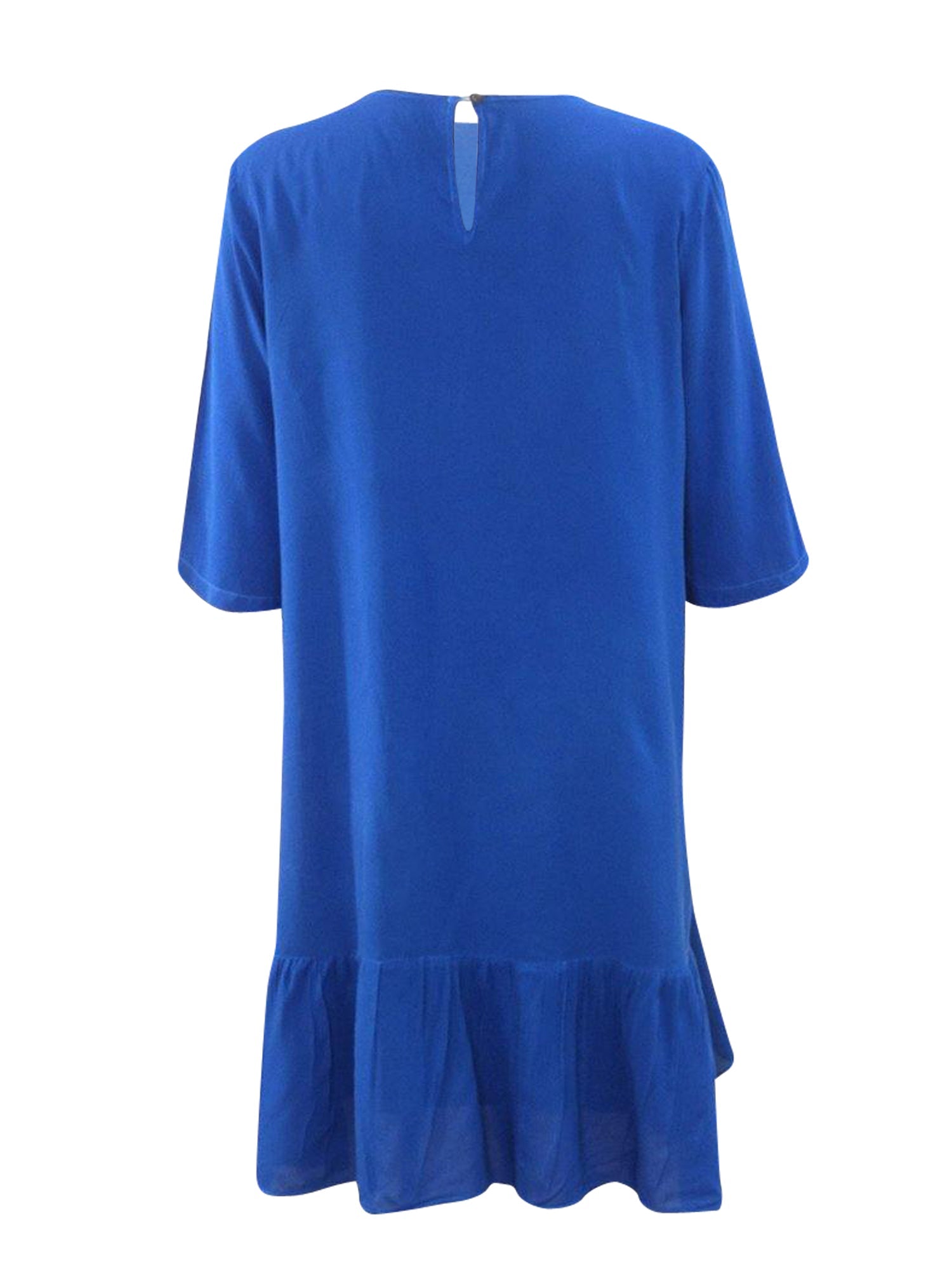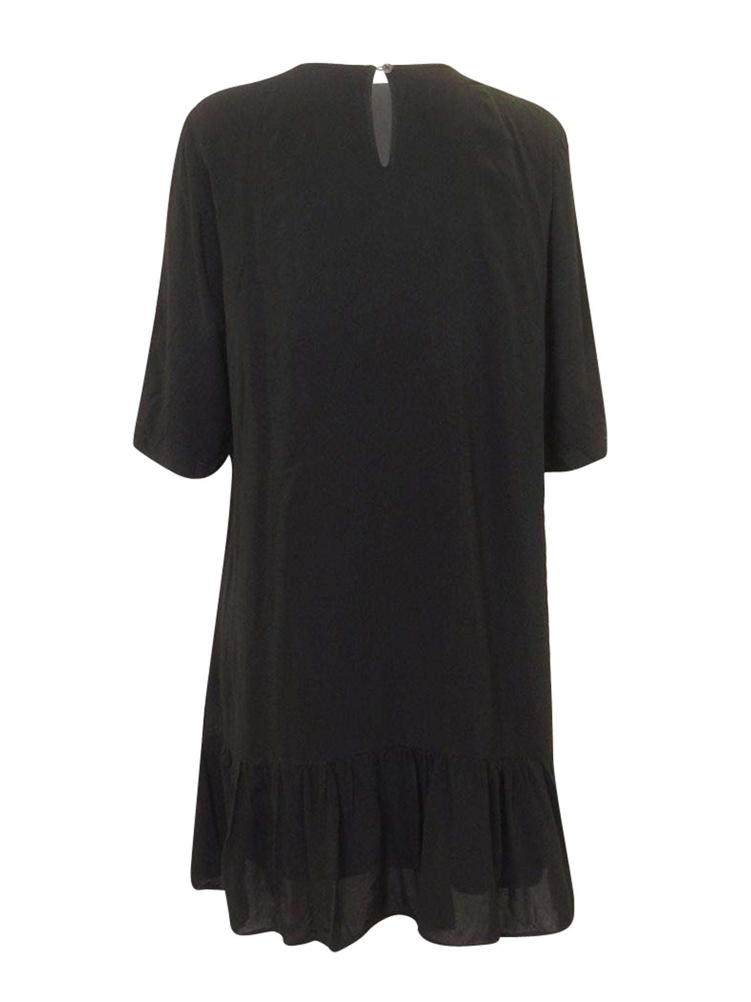 Lightweight flowy dress with a ruffled tier at the bottom. Relaxed fit with wide sleeves.