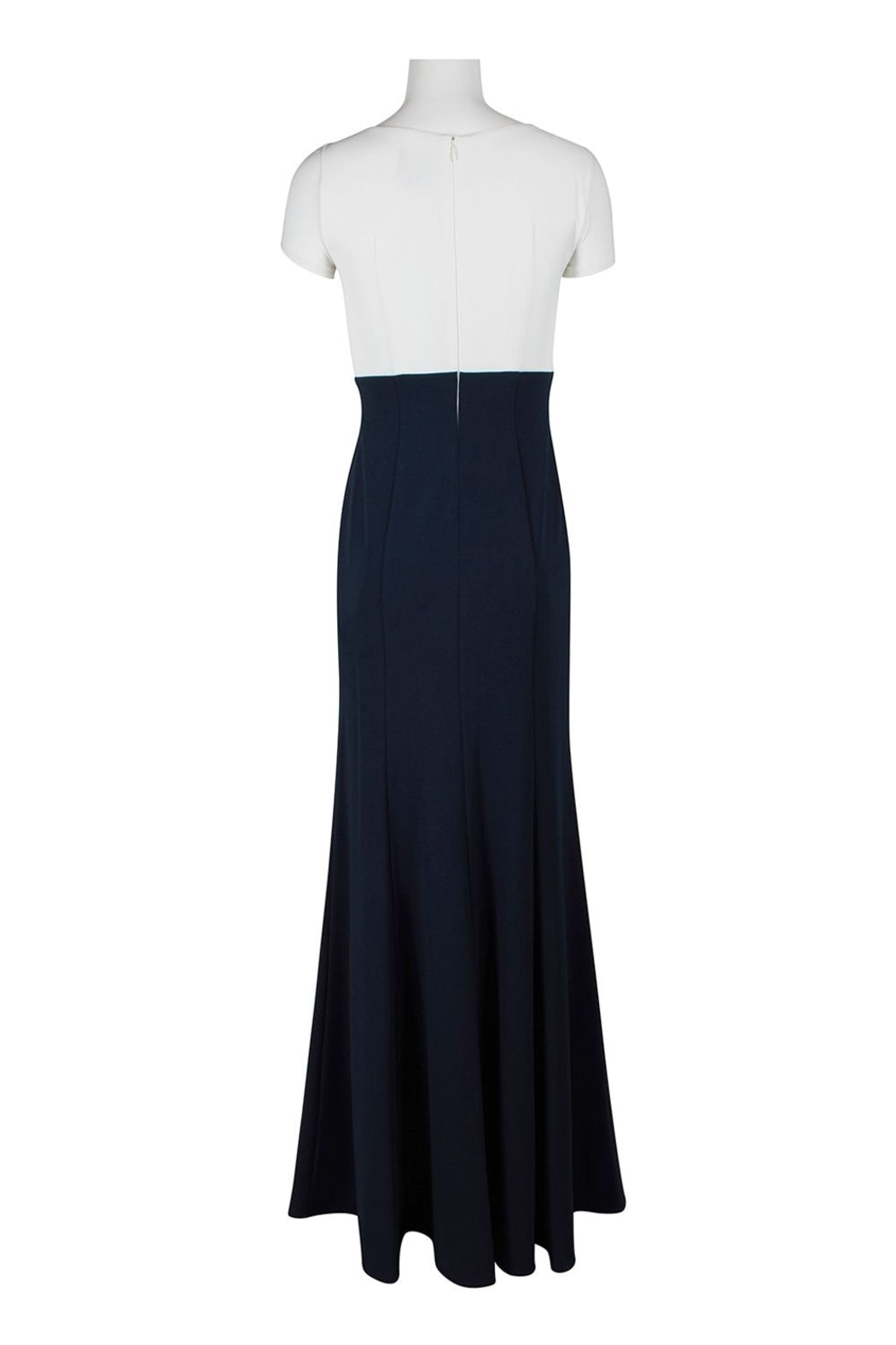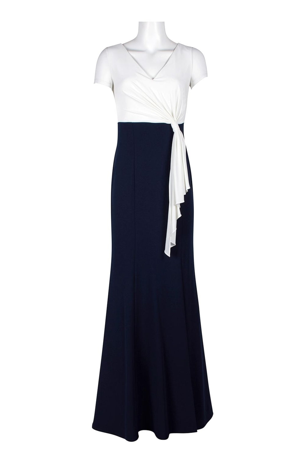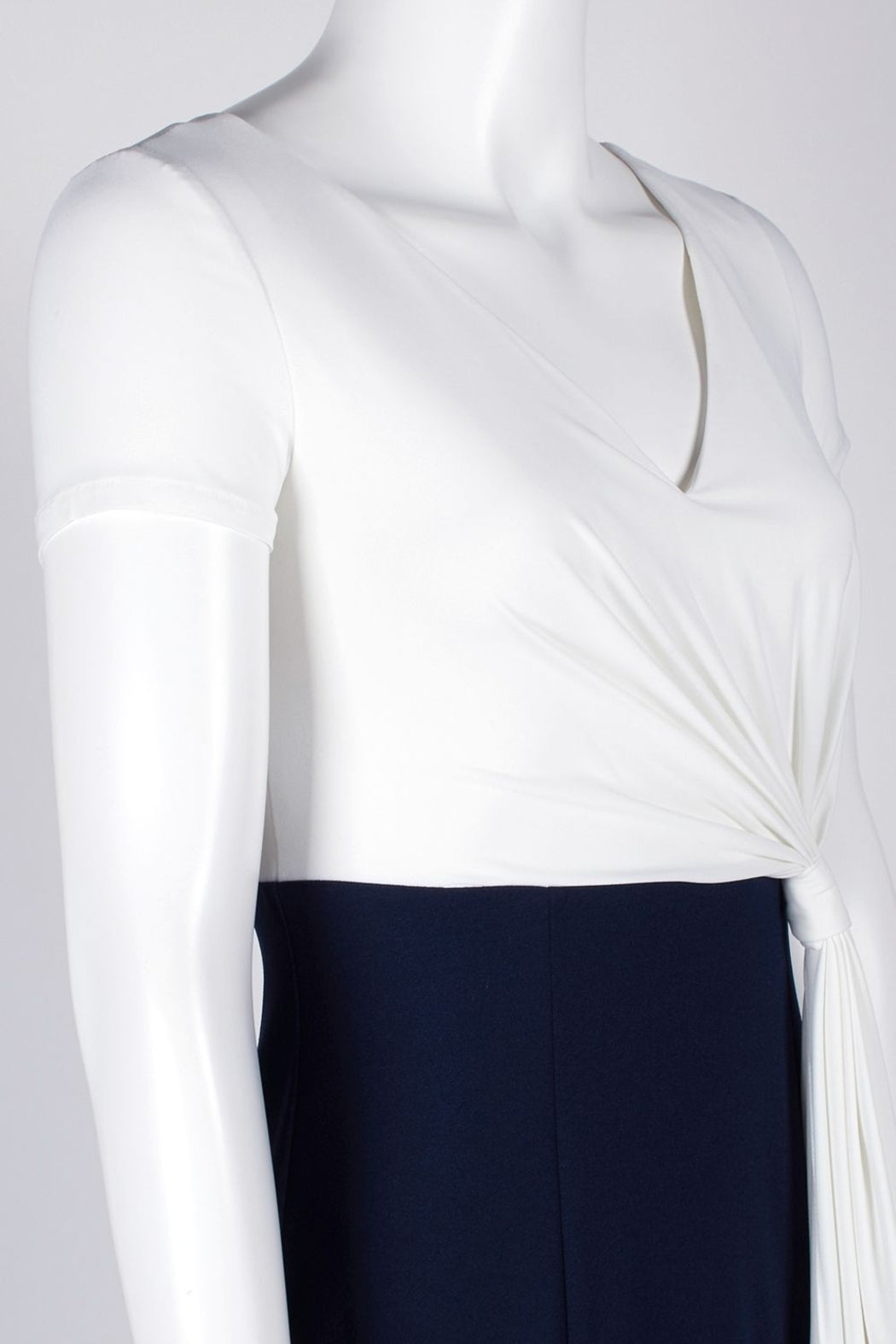 Adrianna Papell V-Neck Short Sleeve Gathered Side ZIpper Back Color Blocked Crepe Dress. This gown has a draped tie off to the left side as well as a moderate slit on the left leg.