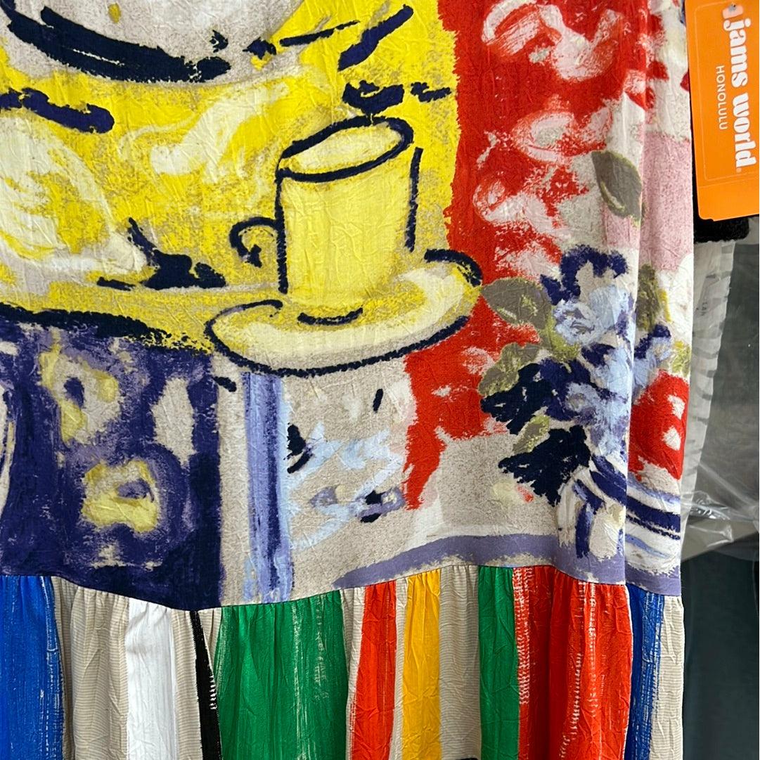 Wonderful Hattie classic Jams World dress in the Bistro print. Triple ruffle. Very fun and easy to wear. Loose fit for many shapes. The prints are never redone making the pieces collectable.