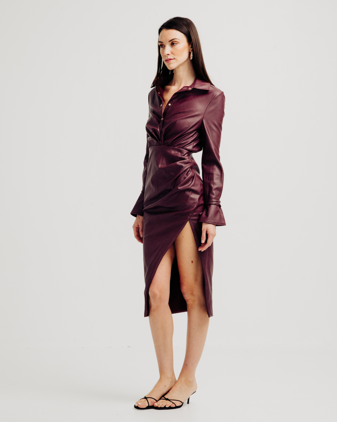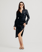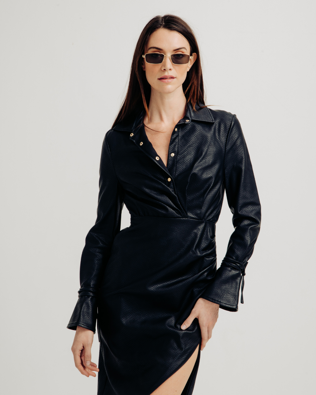 The Jen Dress, a timeless and sophisticated Button Up Collared creation with a contemporary twist—a chic slit for a touch of allure. This dress is a celebration of classic elegance, where the button-up design and collared neckline add a refined charm, while the slit introduces a modern edge. Perfect for those who seek a versatile blend of sophistication and understated allure, the Jen Dress embodies the distinctive Torn by Ronny Kobo aesthetic.