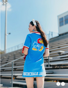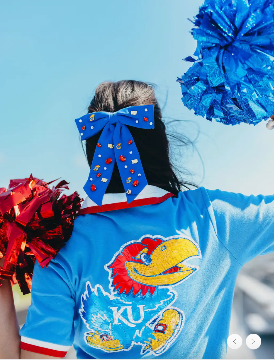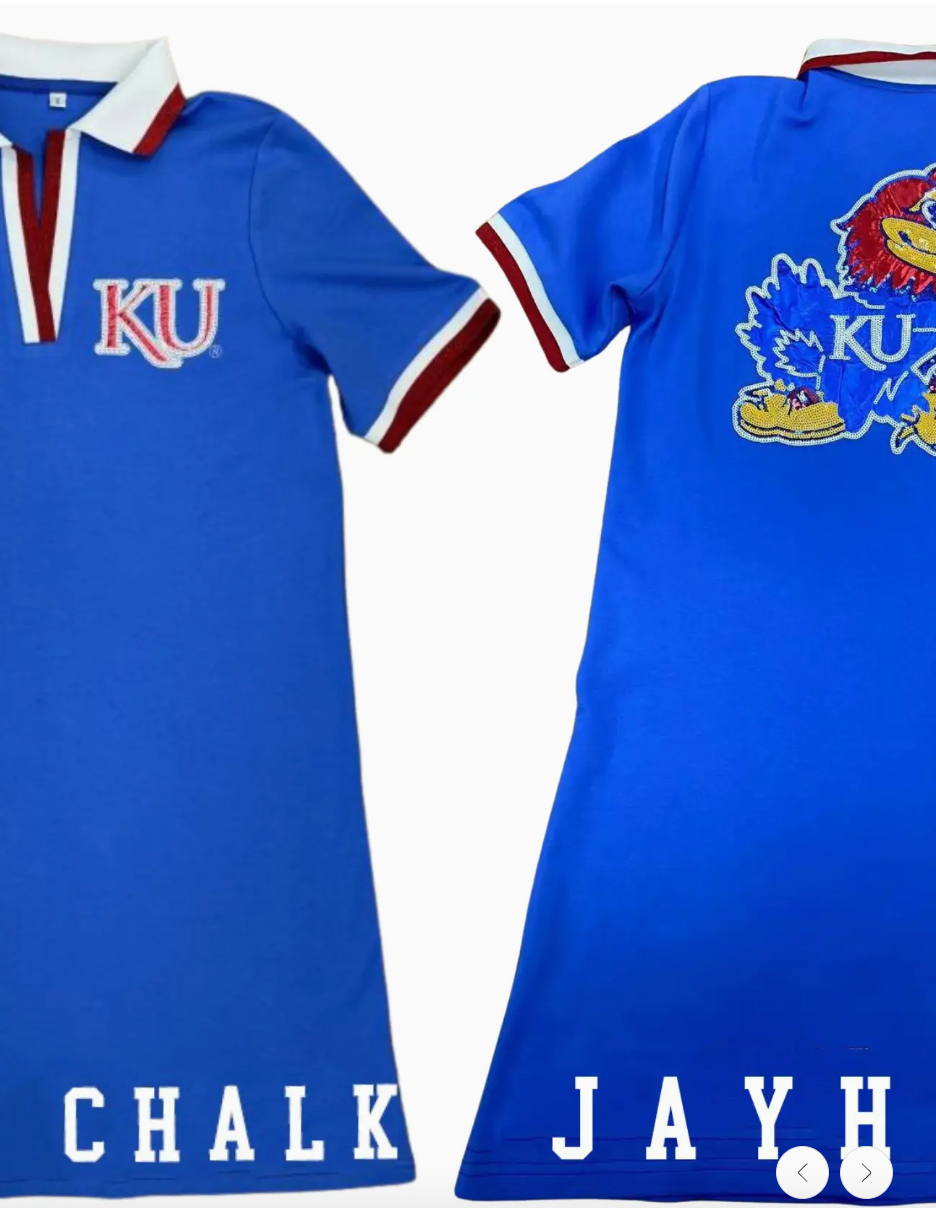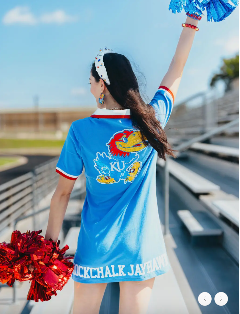 * This is an Officially Licensed Collegiate Product * Blue Kansas Club Dress with embellished Jayhawk logo & ROCK CHALK JAYHAWK on hem * Features Sequins, embroidery, and appliqué fabric embellishments * Accent collar and cuffs on sleeves feature red sparkle trim * 100% Cotton (body)
