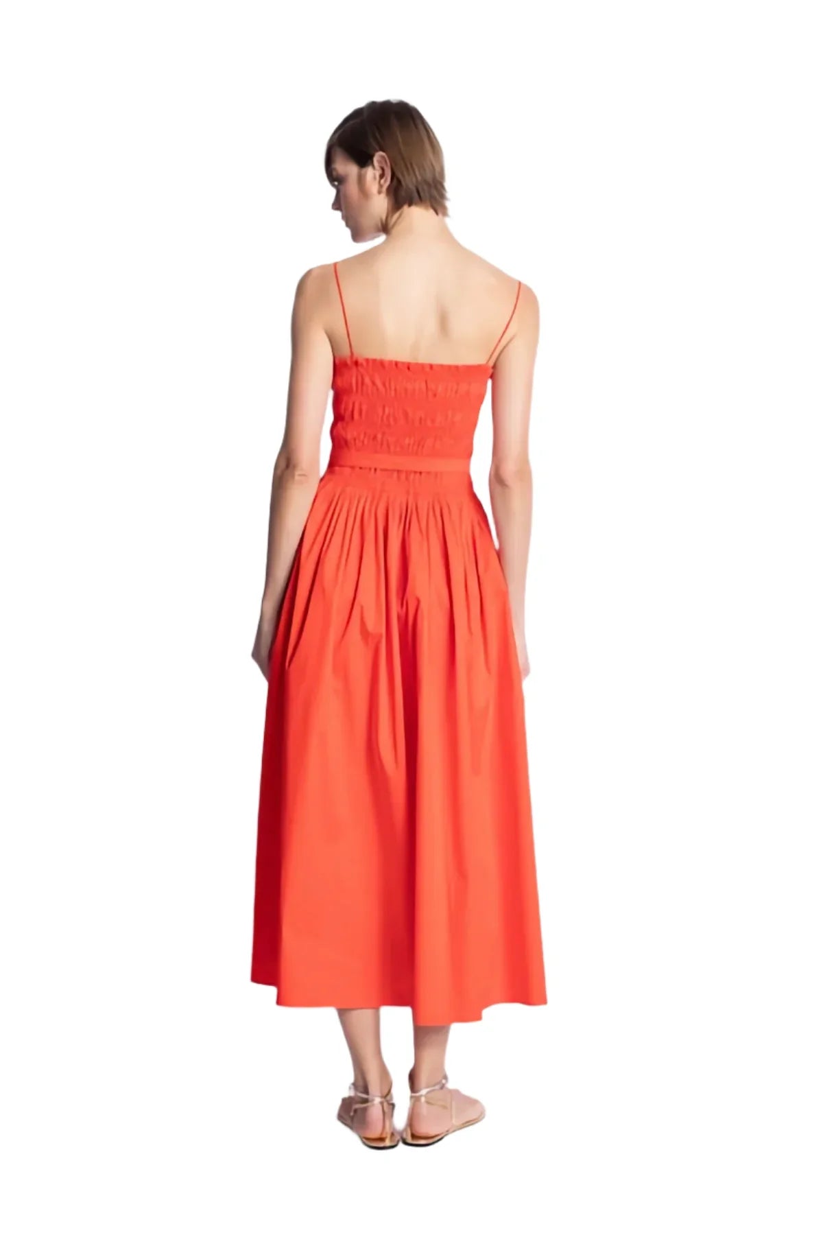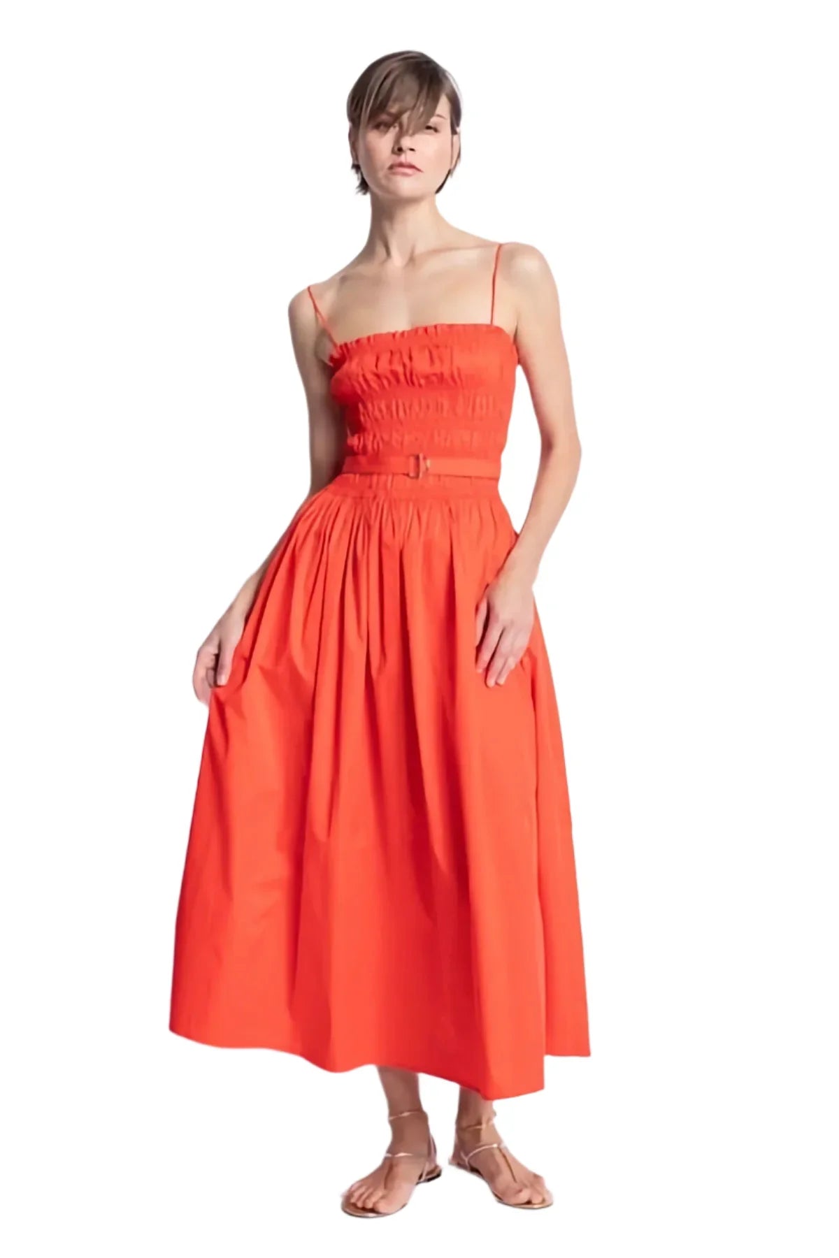 The Panama dress features a pleated a-line skirt, smocked bodice, d-ring belt.