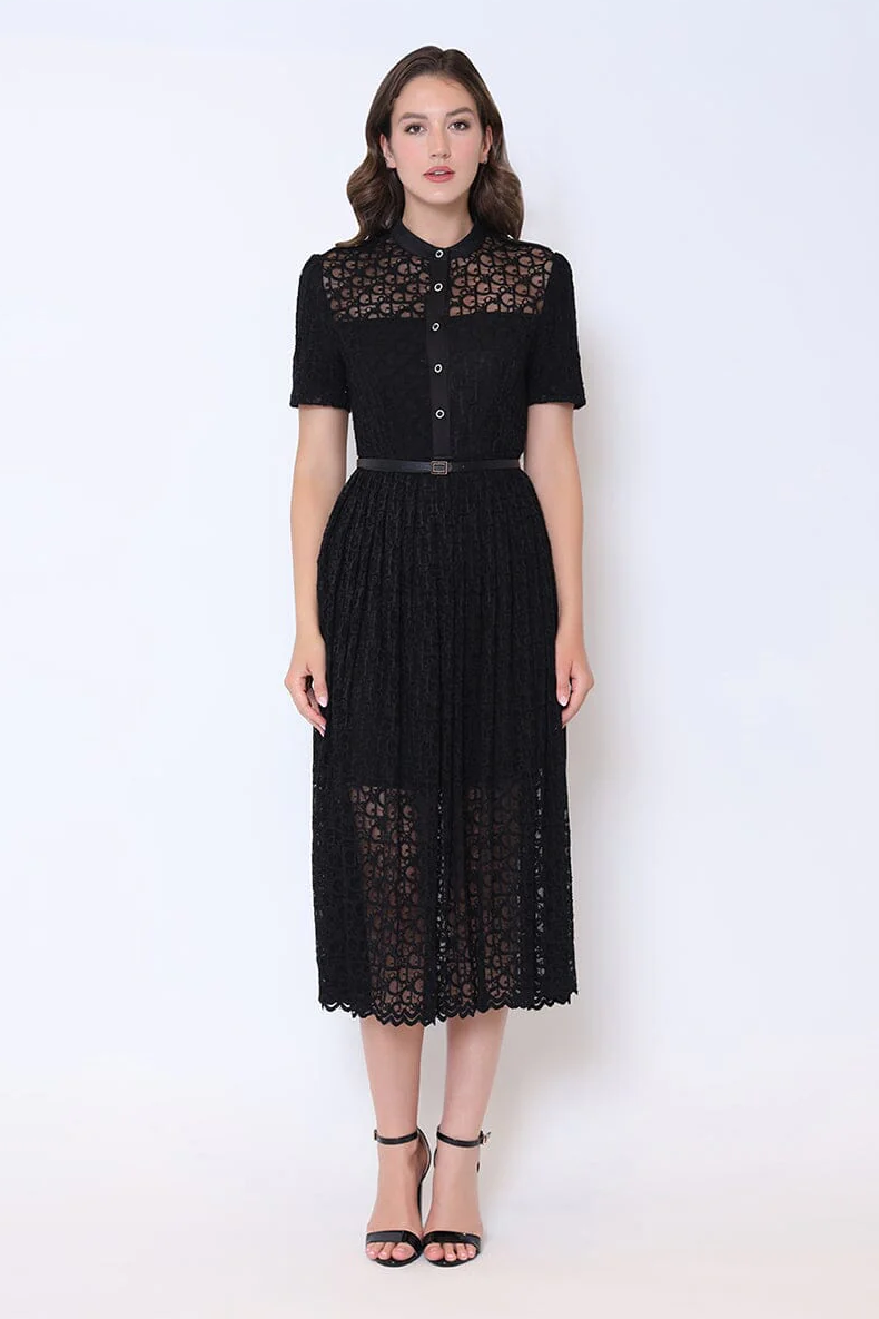 Lace Floral Button Front Mock Neck Belted Dress