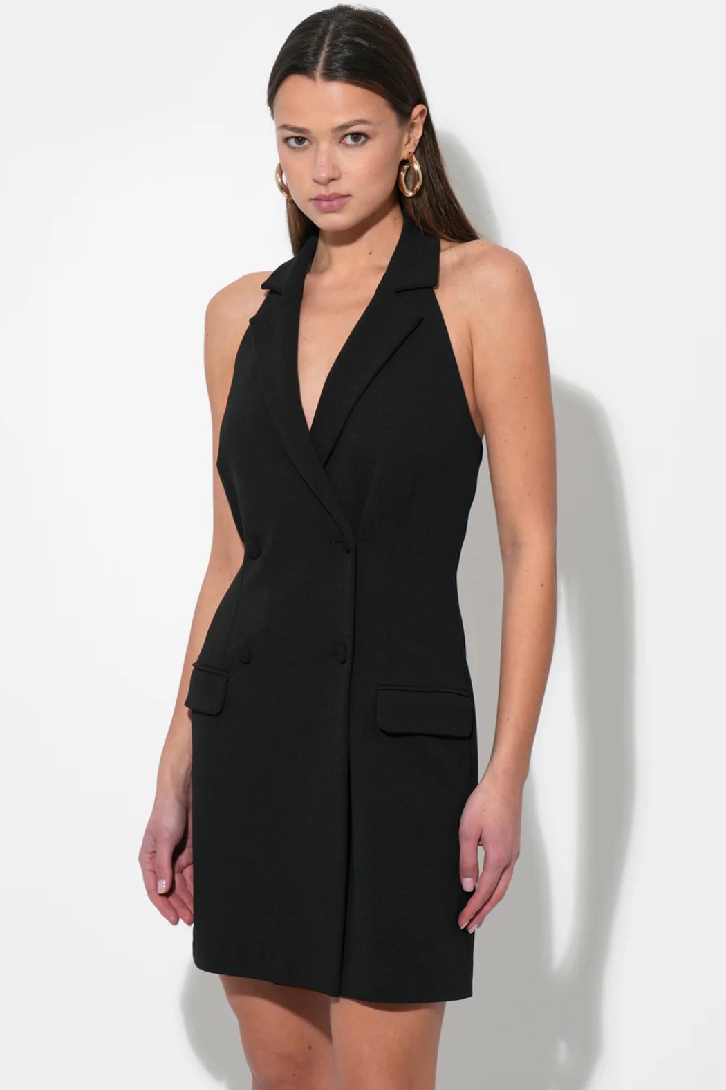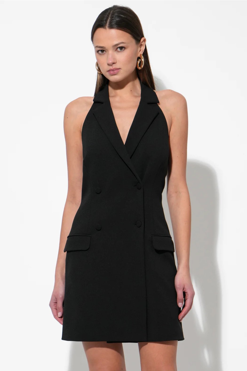 This sophisticated mini dress reinterprets classic suiting with a vest-inspired silhouette, featuring a deep V-neckline and a button-front closure. The tailored fit cinches at the waist to create a sharp and flattering shape, while the mini length adds a contemporary and chic touch.