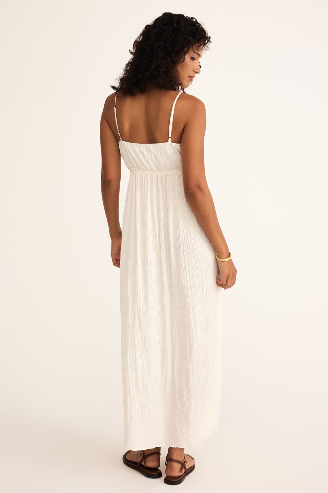 Manon Satin Maxi Dress V-neck Sleeveless Adjustable spaghetti straps Fully lined Lightweight Heavy soft wash Fit and flare Poly Satin: 100% Polyester Length from shoulder is 54"