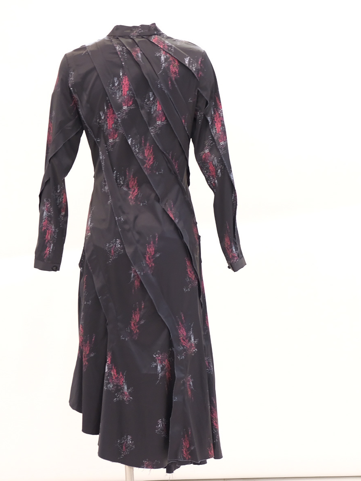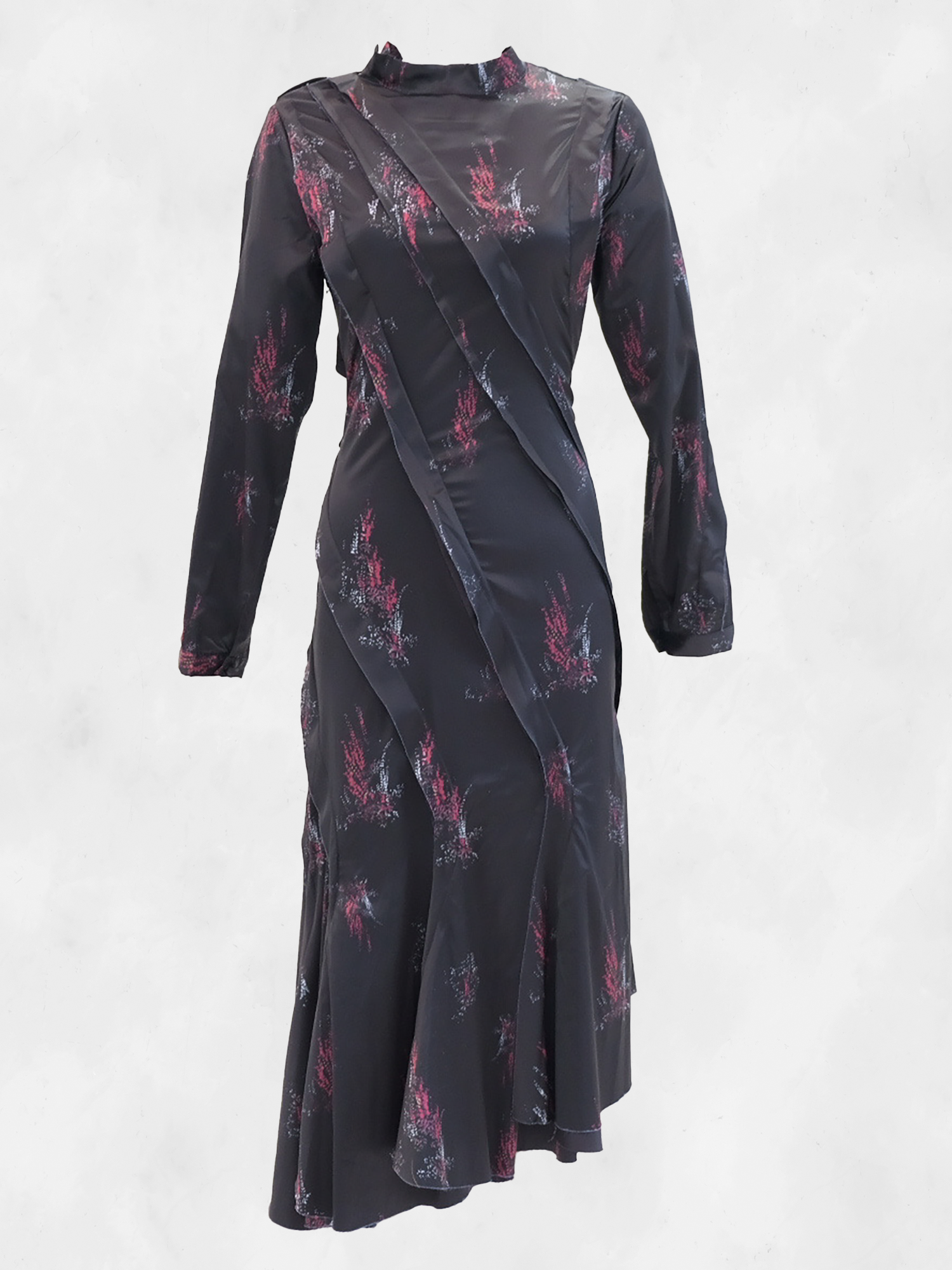 •LOOK: The details are subtle, moving in a diagonal direction to create a flattering silhouette. Zipper at the shoulder closes to a high neck. The side zipper creates shaping at the waist which flares out to a midi length skirt giving a lot of movement. The satin feel fabric has a feminine print sporadically placed throughout the front and back. Perfect for holiday dressing or any party occasion.