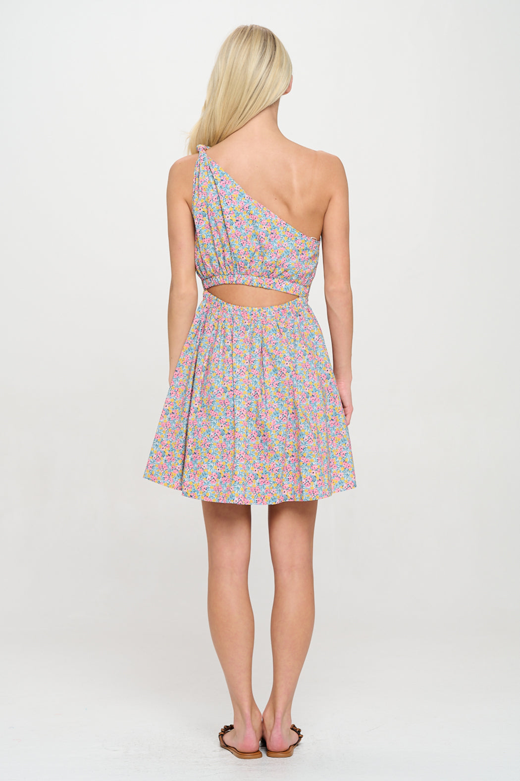 Make a playful entrance in this vibrant one-shoulder dress, blooming with a lively allover floral print. Featuring a gathered waist for a flattering silhouette and a twirl-worthy A-line skirt, this woven mini dress is the perfect pick for warm-weather outings, daytime events, or vacations. The asymmetrical neckline adds a modern twist to a timeless floral look.