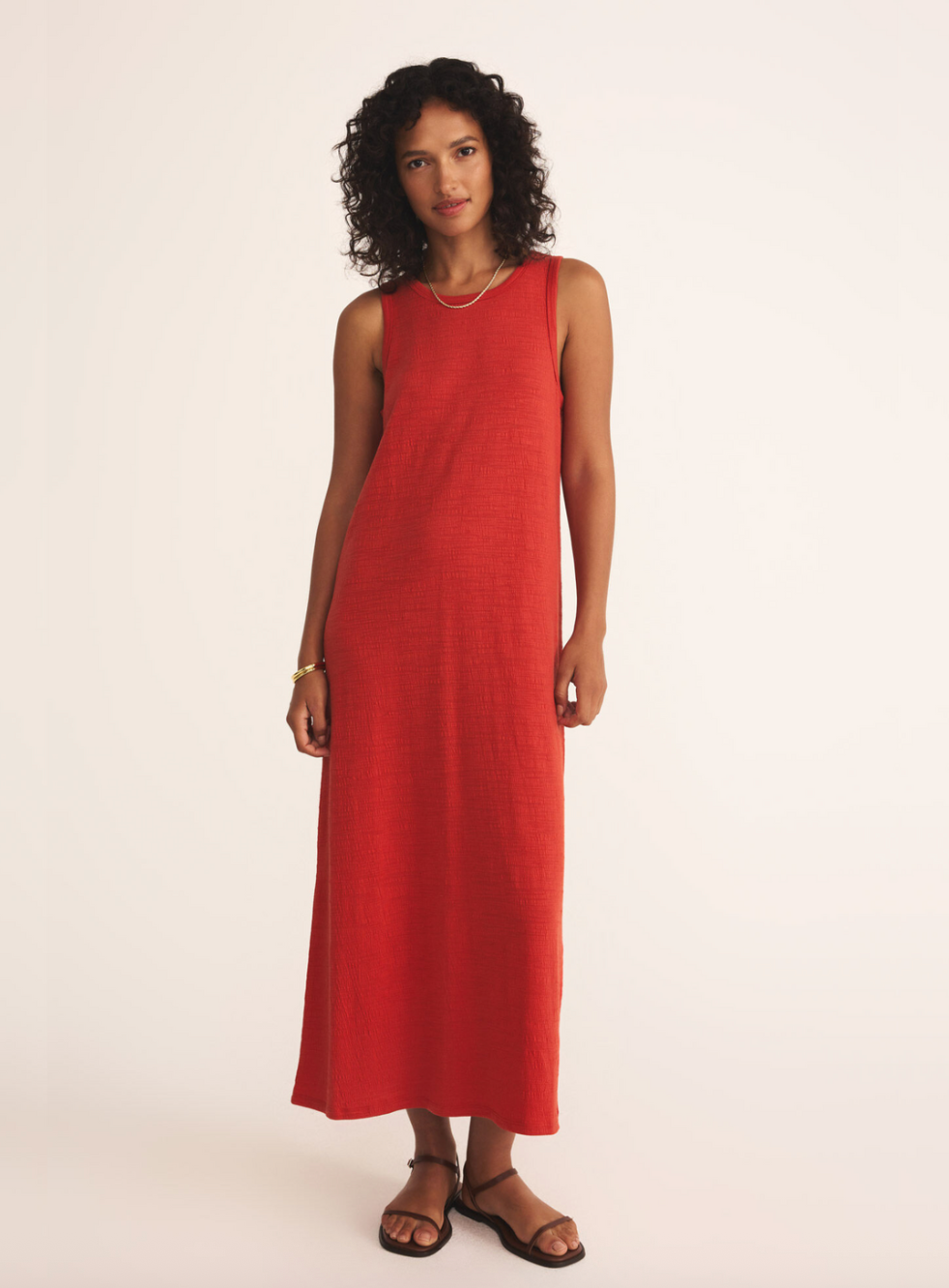 The Mystic Midi Dress features a textured fabric in a vibrant cabana red, offering an effortlessly chic look. Its versatile design makes it ideal for busy days, whether running errands or enjoying a casual walk. This dress combines comfort and style, providing a polished, one-and-done outfit solution.