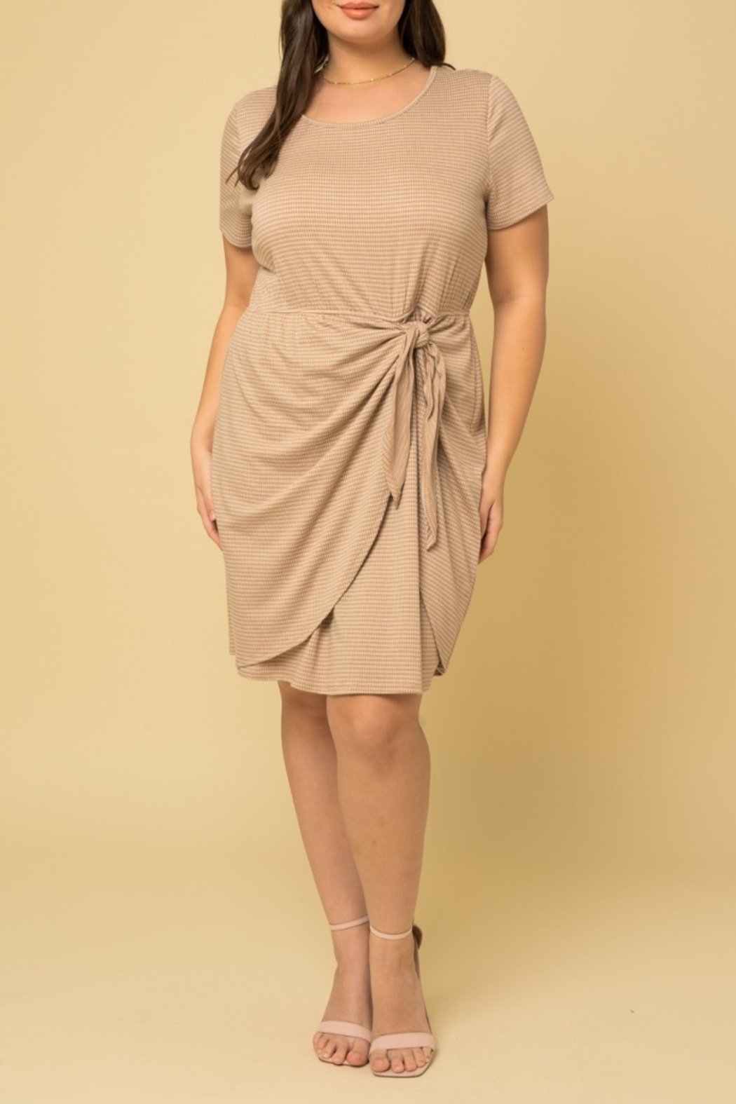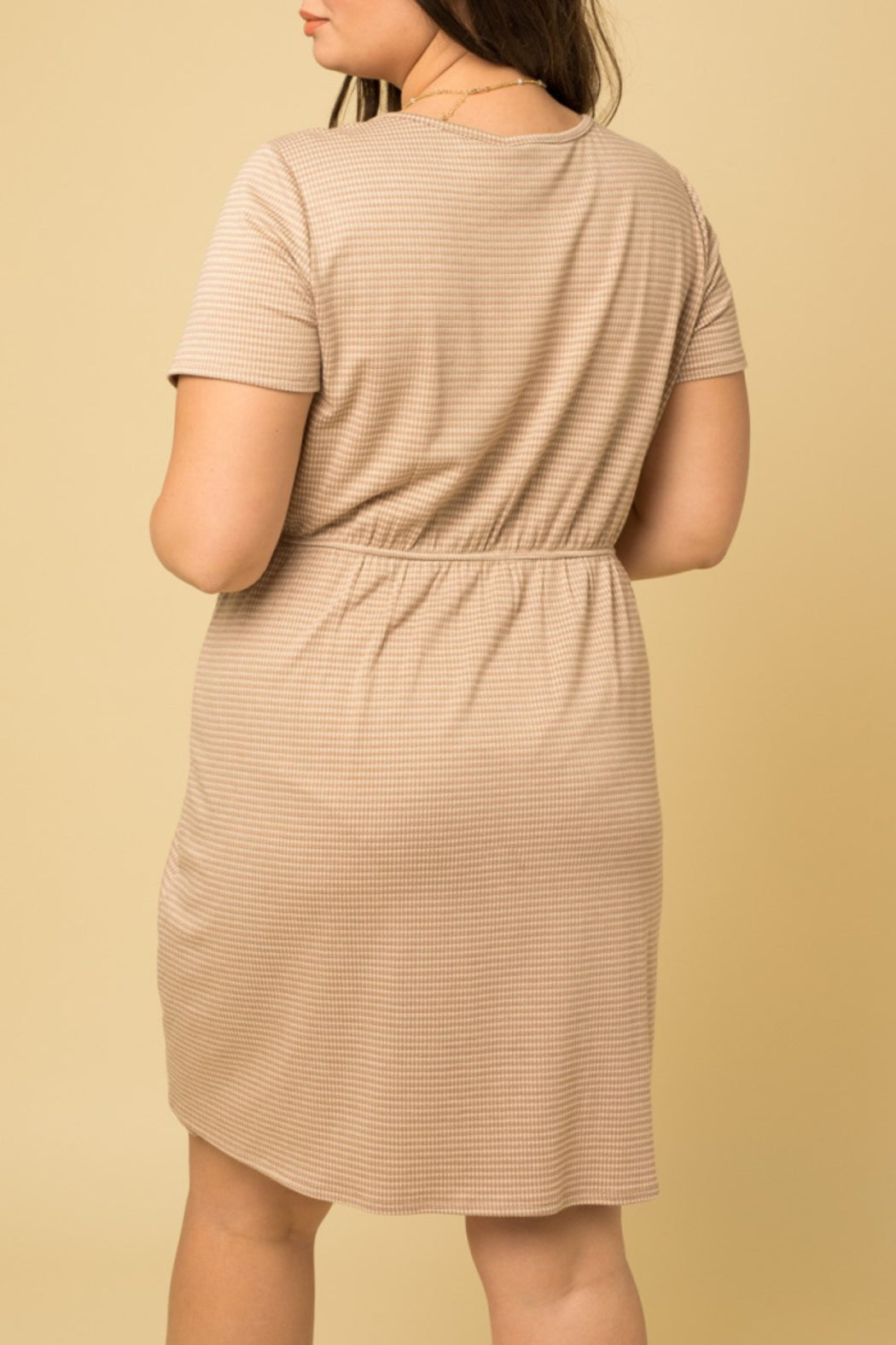 Classic, faux wrap, gingham dress with round neckline, elastic waist and tie wrap. Model is wearing a size 1X. Refer to measurements for your perfect fit. Across chest measurements; 1X 21", 2X 22", 3X 23". Shoulder to hem; 1X 38", 2X 38.5", 3X 39".