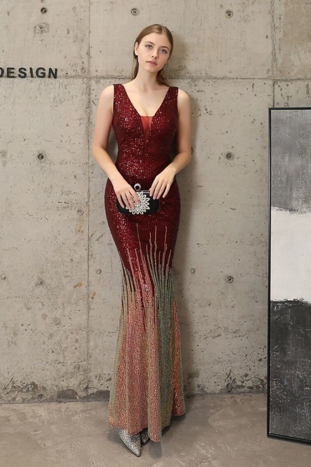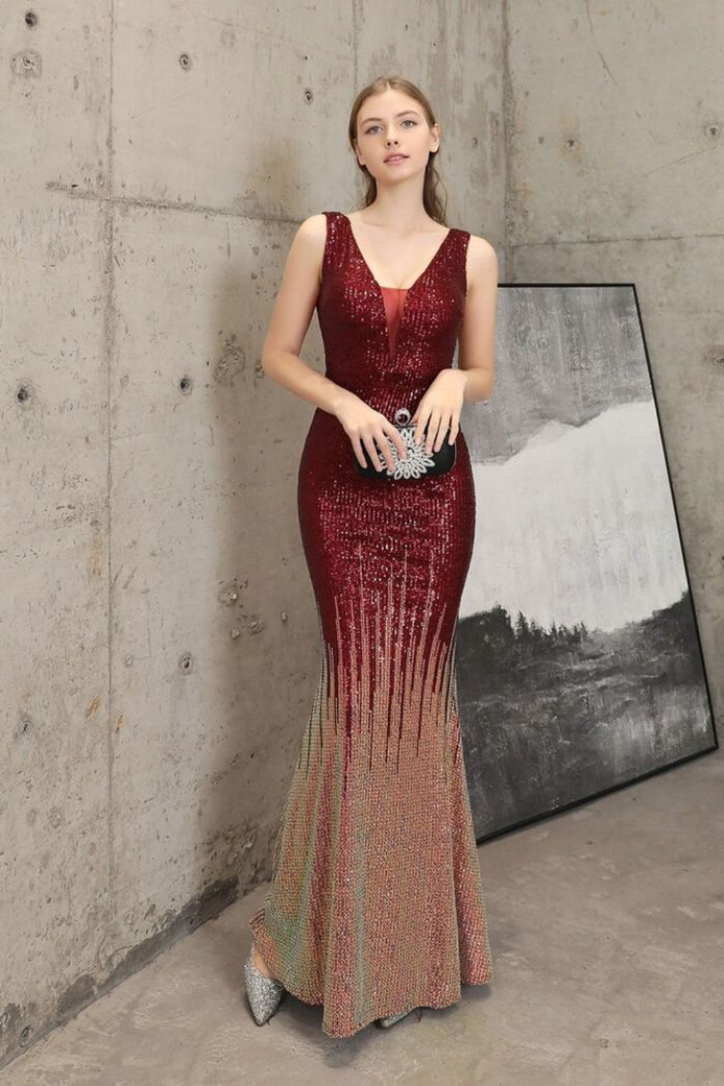 New Year Gala Glittering Evening Gown Formal Dresses Deep Red Gold Sequin Dress Evening Dress Floor Length