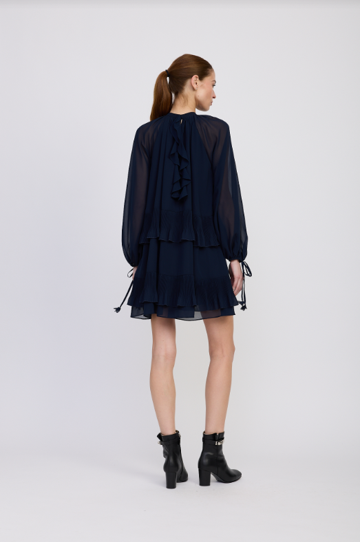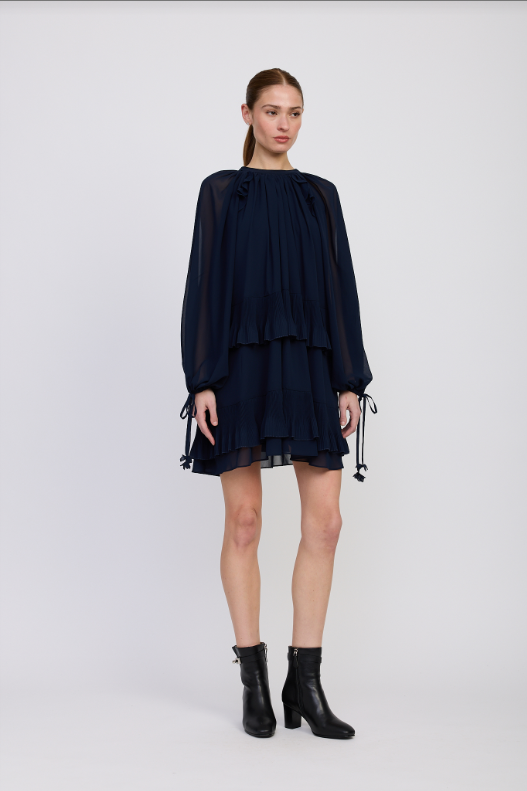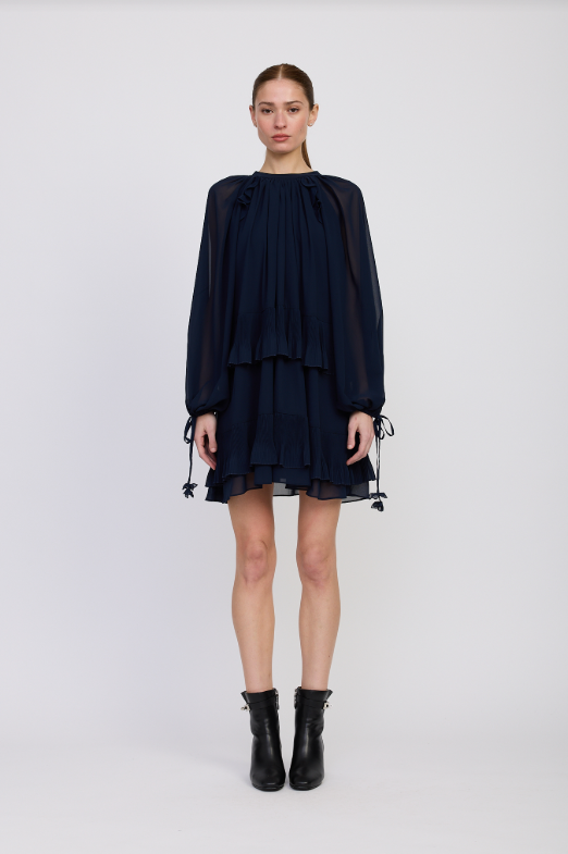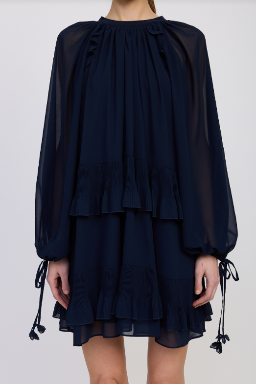 The En Saison Nicolette Mini Dress features a mini silhouette with long puff sleeves and a relaxed fit, crafted from delicate chiffon. Perfect for weddings and special occasions, it offers an elegant and refined look.