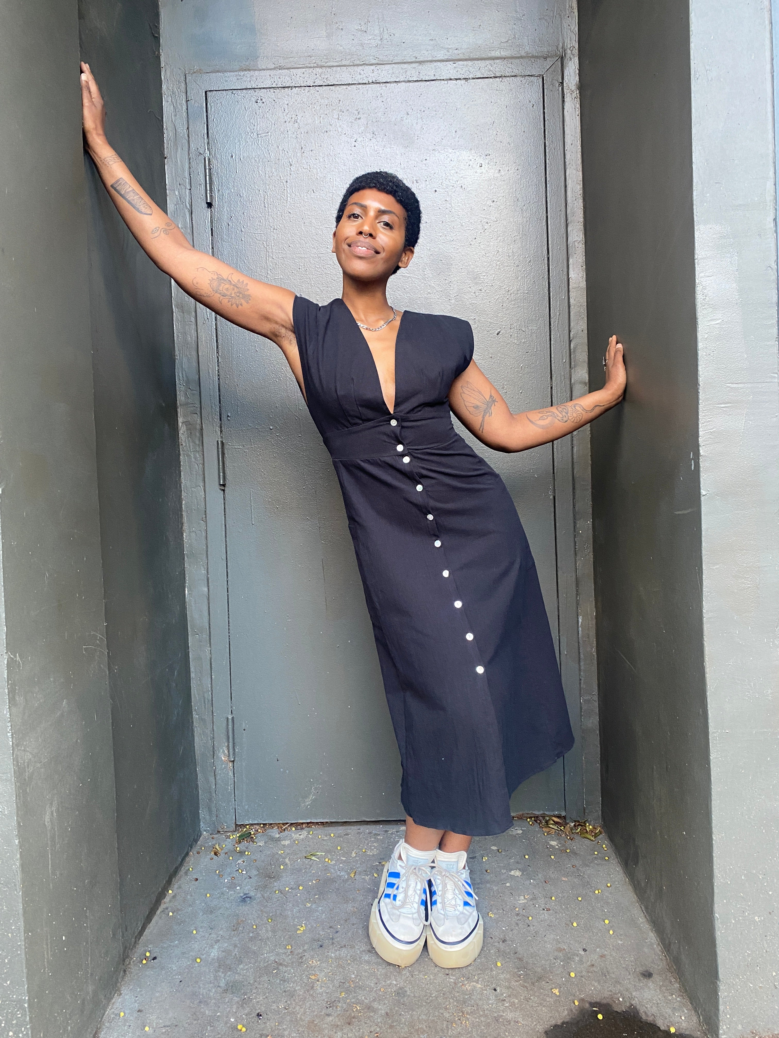 Larkin is 6' with a 41.5" bust and a 31" high waist and is wearing a Large
