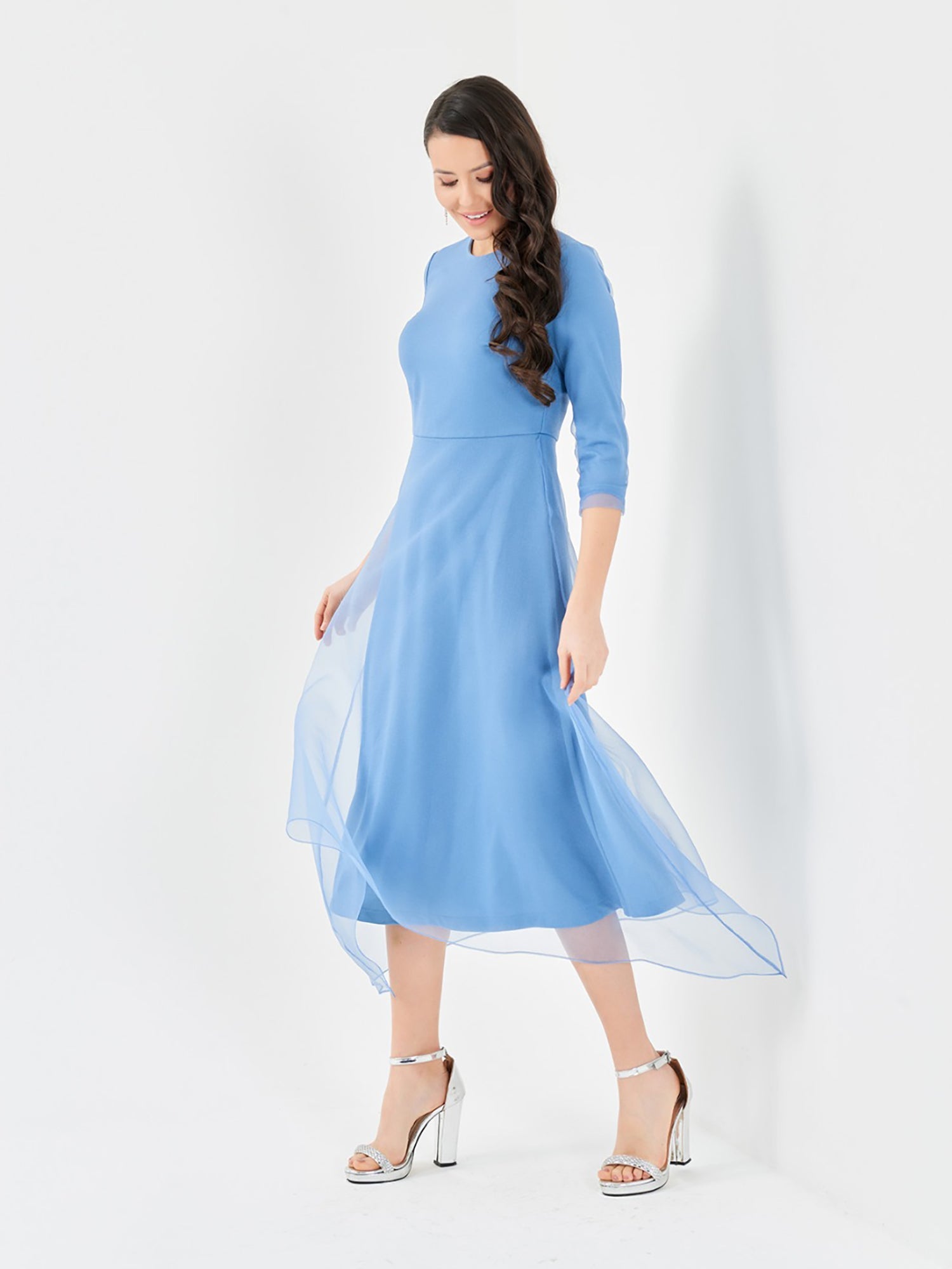 •LOOK: What happens when you combine several basic design techniques in one dress? Simple elegance. There is nothing complicated about this dress but the look is fresh and outstanding. There is a hidden back zipper that closes to a rounded neckline. The solid fabric underneath the sheer netting overlay is double layered with gentle shaping to enhance the fit. A-line shape. Maxi length. Three-quarter sleeves. The sheer overlay has a slightly stiff, textured feel giving the dress sone volume. The body fabric has a luxurious, silky feel. This dress has a lot of movement and is made to dance. Wear this to your next social event and wow the crowd.
