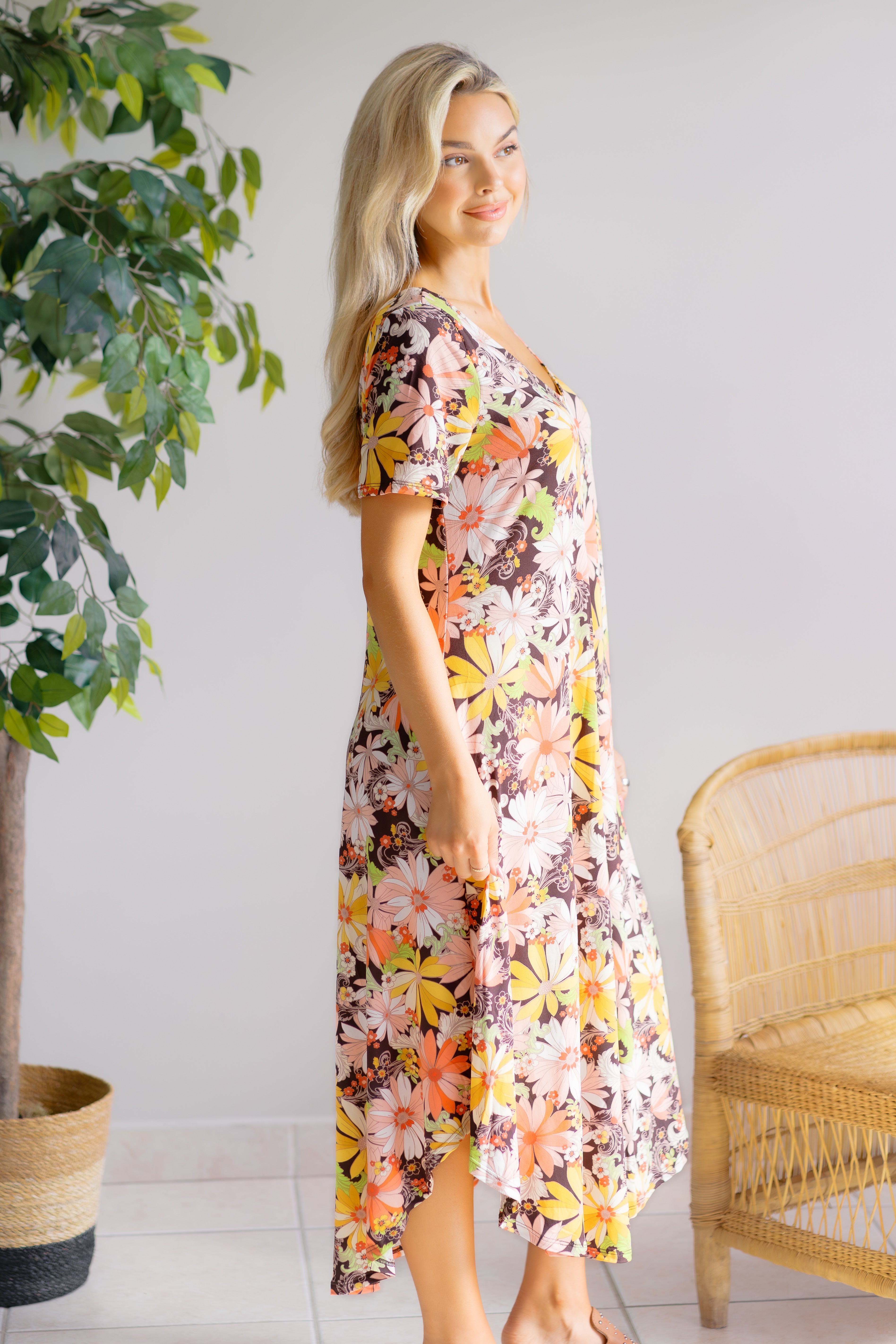 Embrace effortless elegance with the Petals in the Breeze Floral Asymmetrical Hem Midi Dress. Its flowing silhouette and unique asymmetrical hem create a graceful movement that captures attention. The delicate floral pattern adds a touch of romance, making it perfect for both daytime outings and special occasions. Designed to flatter every figure, this dress combines comfort with style, ensuring you feel confident and radiant wherever you go. Elevate your wardrobe with a piece that celebrates femininity and charm.
