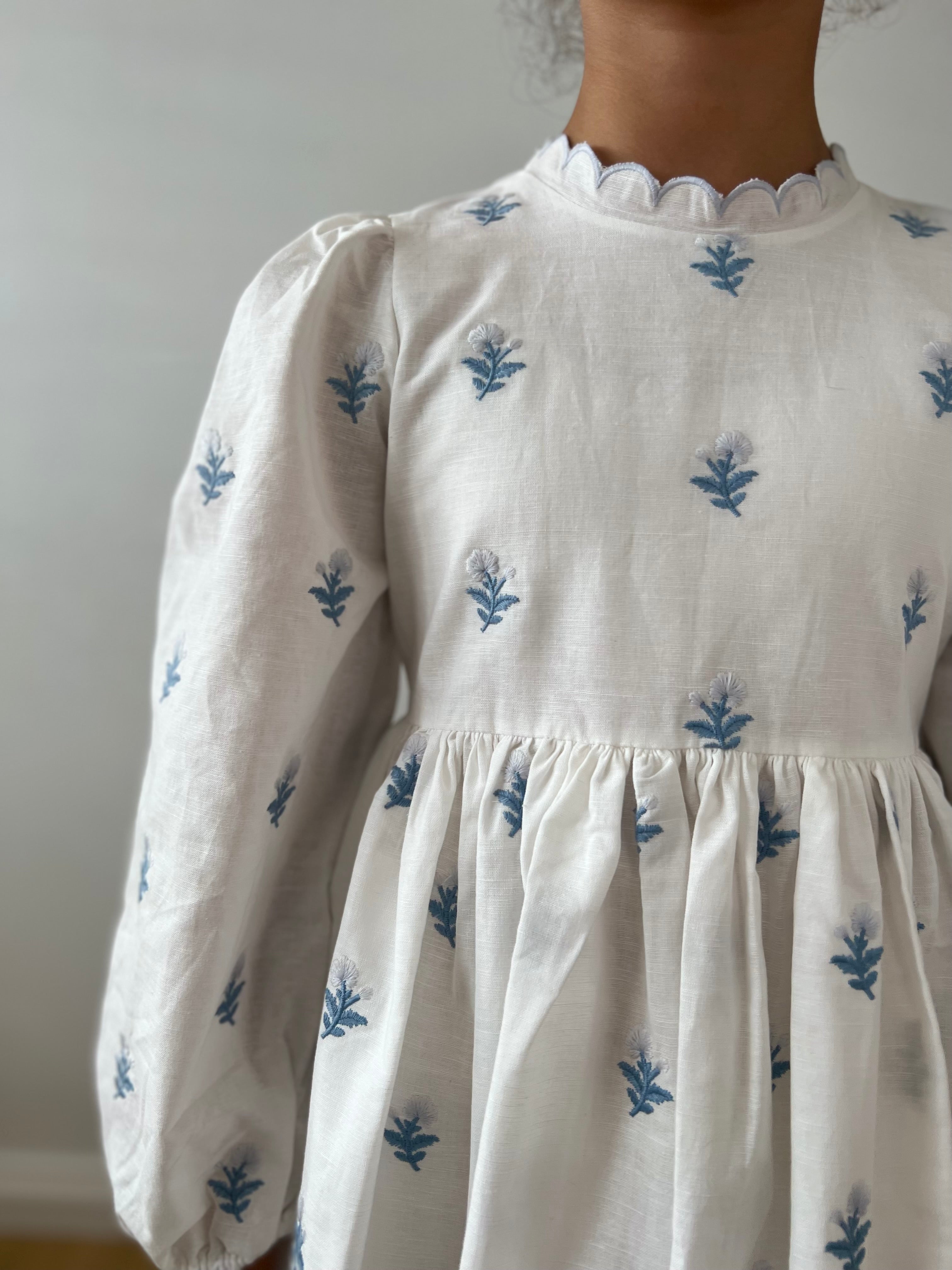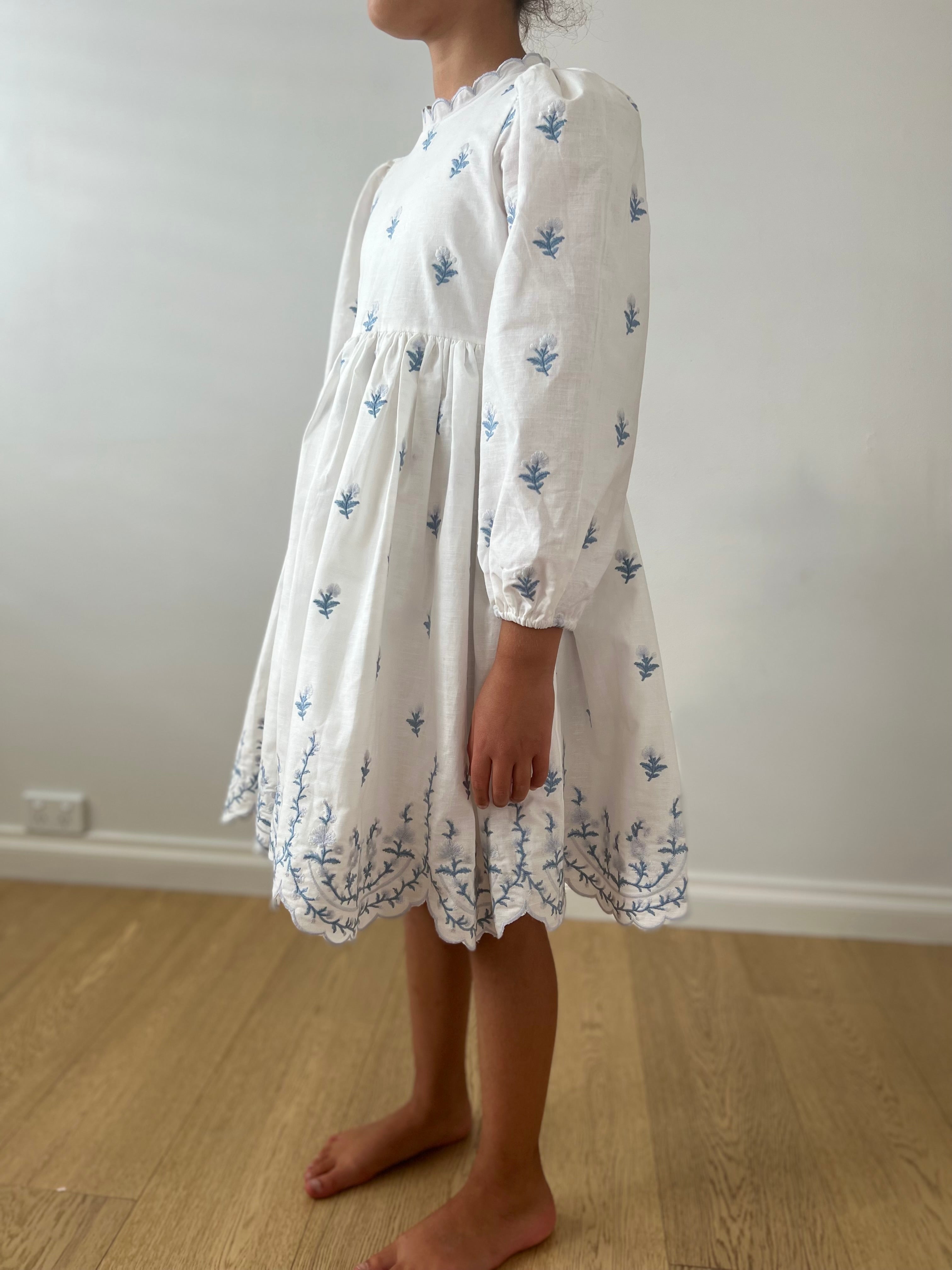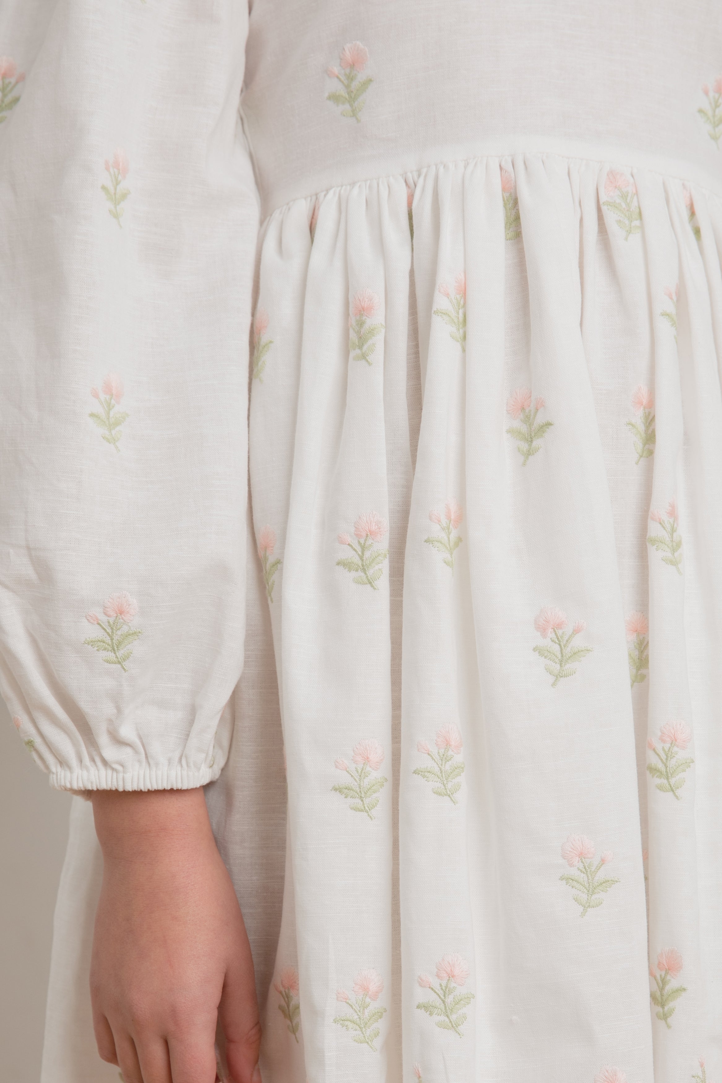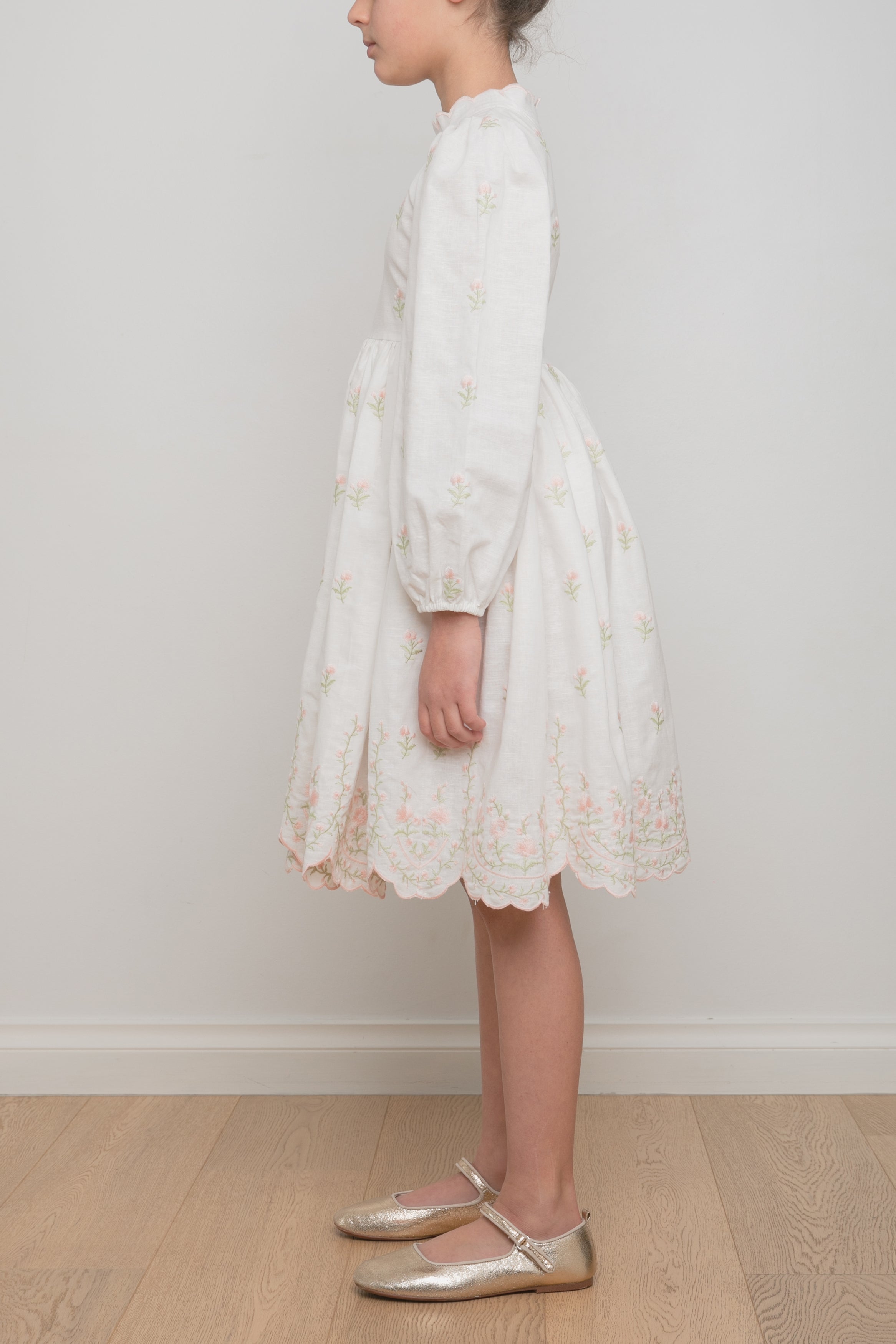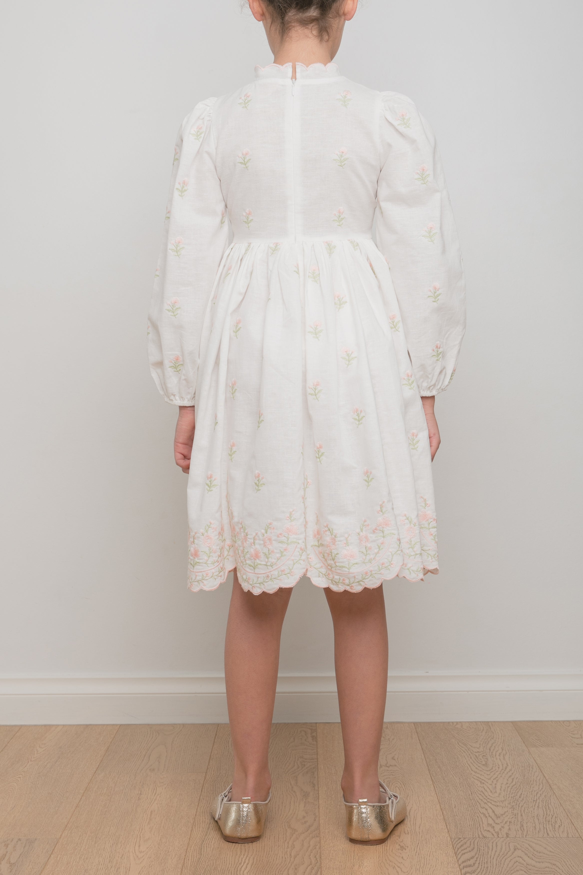 This dress features beautiful and delicate rose embroidery in an all-over scattered design with lavish hem embroidery. The sleeves are bracelet length and finished with an elastic cuff. The neck is high and the bust is fitted. The dress features a centre back zip for easy wear.