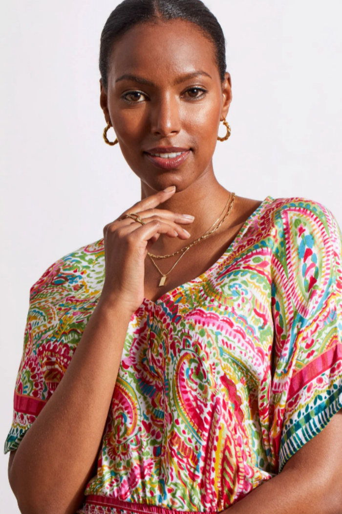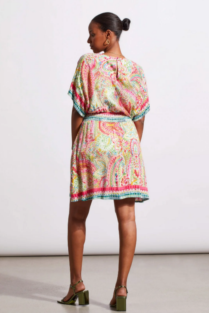 Add a rush of color to your collection with this v-neck dress featuring border prints and flowy dolman sleeves. We're also loving the additional waist accent and the functional back-of-neck opening.