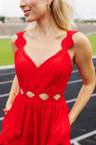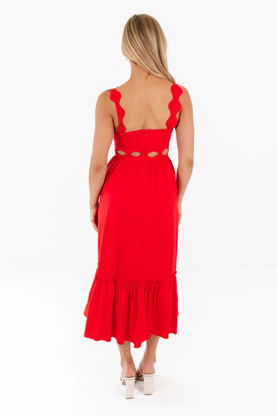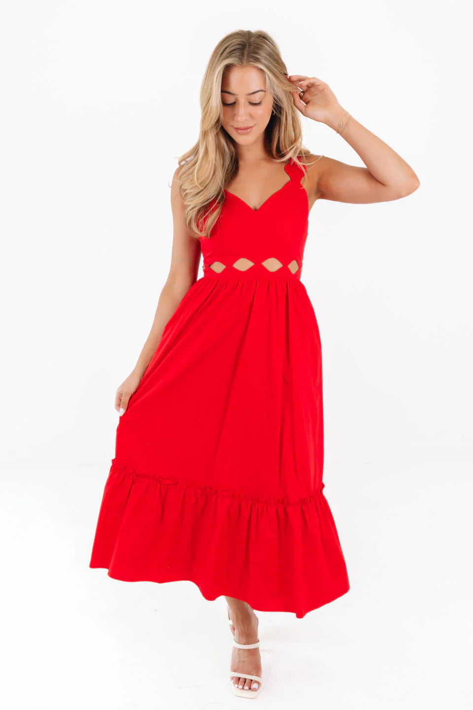 This red midi dress features waistline cutouts adding a fresh, airy feel perfect for fall. The adjustable straps and fitted bust create a flattering, feminine silhouette, making it a versatile choice for both casual and dressier occasions. Effortlessly stylish and charming, this dress is perfect for sunny days and cool evenings!
