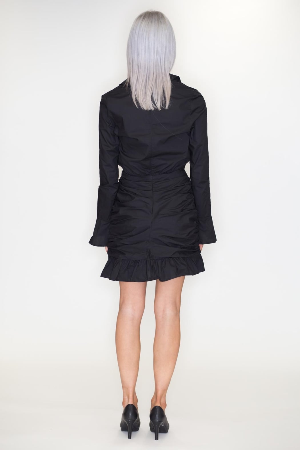 Shirring detail, ruffled bottom, bell sleeve, lapel collar mini dress.