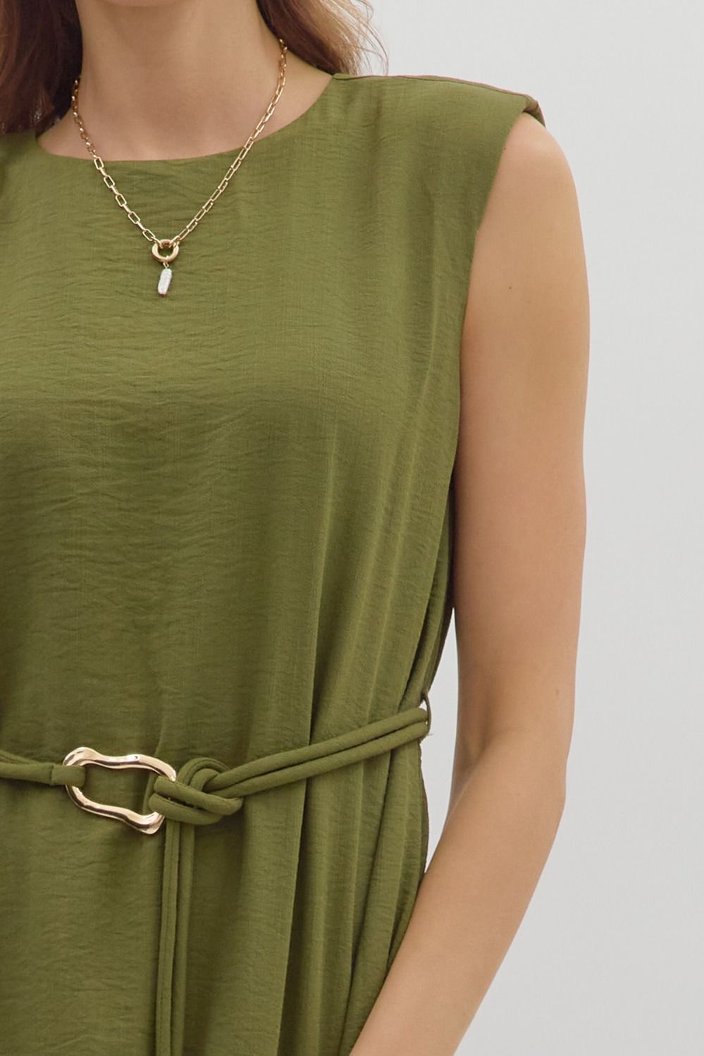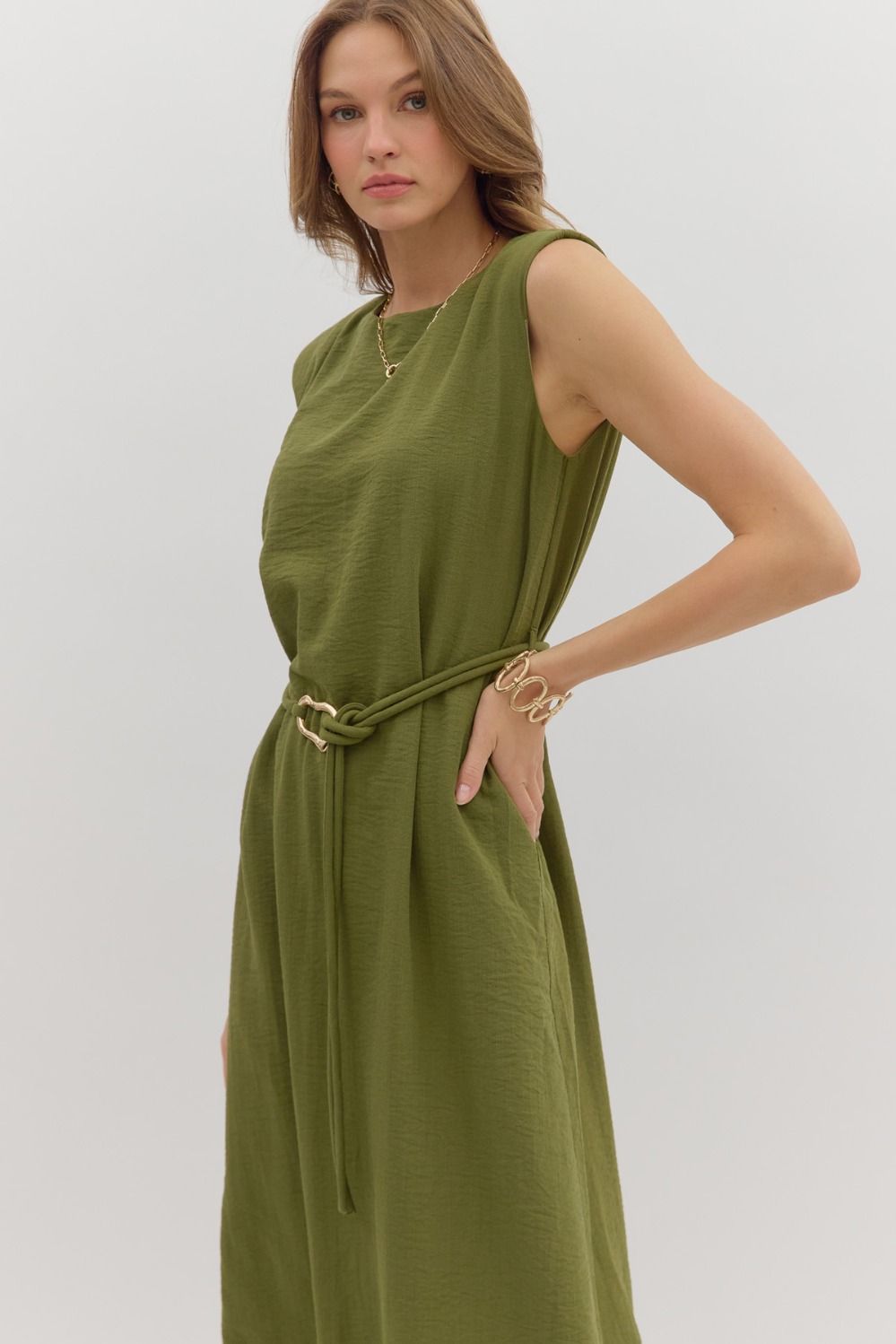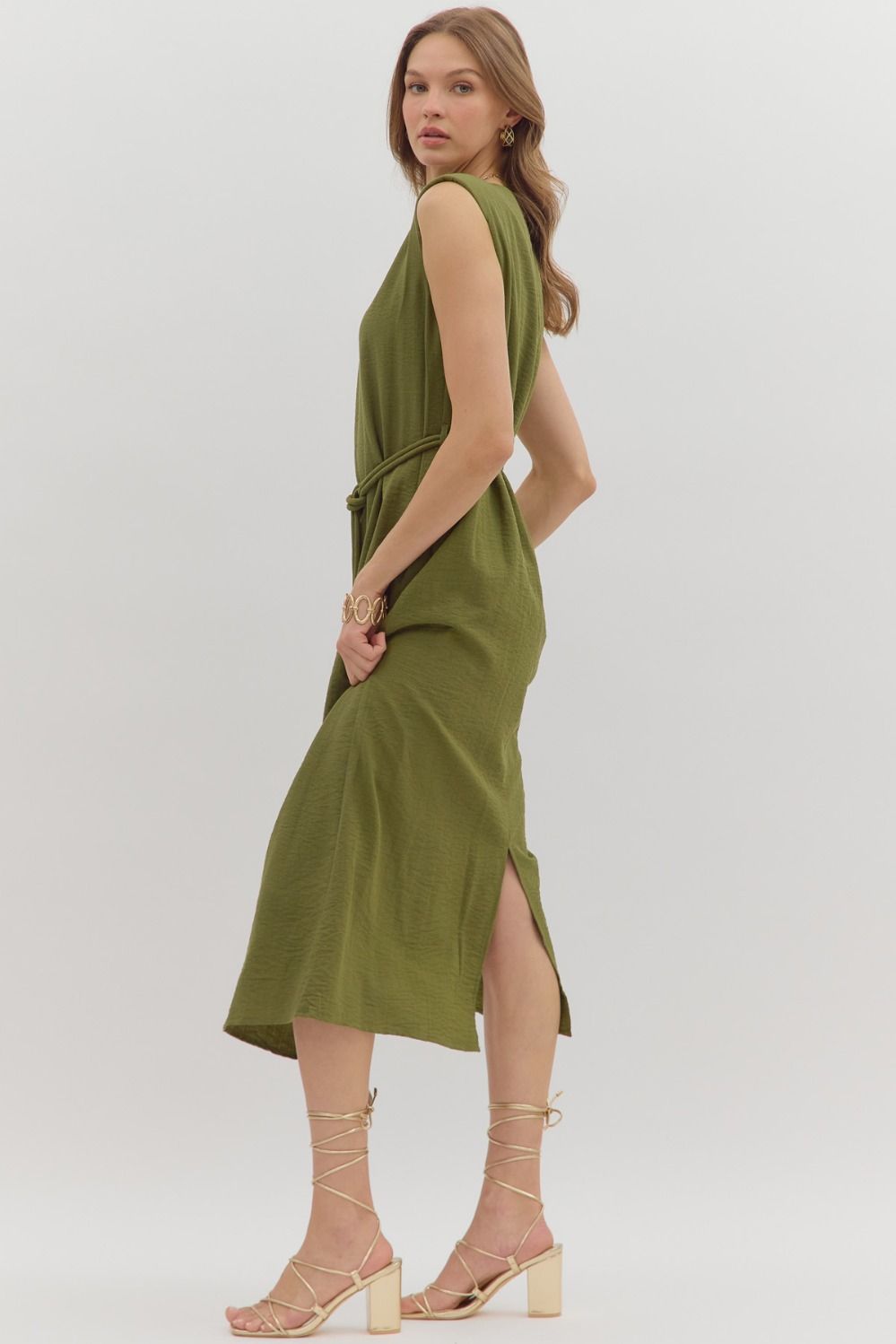 Solid muscle shoulder slit hem midi dress featuring embellished gold accent fastner belt. Single button keyhole closure at back neck. Lined. Woven