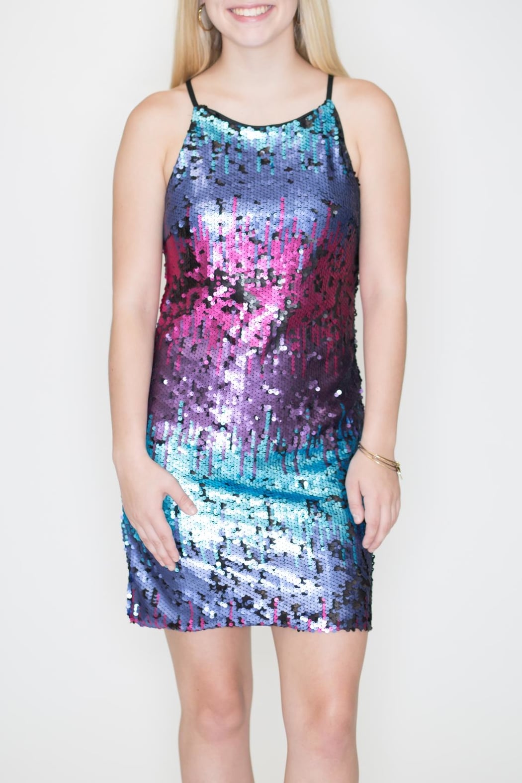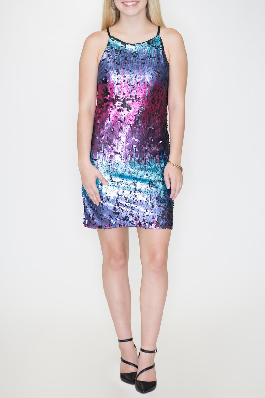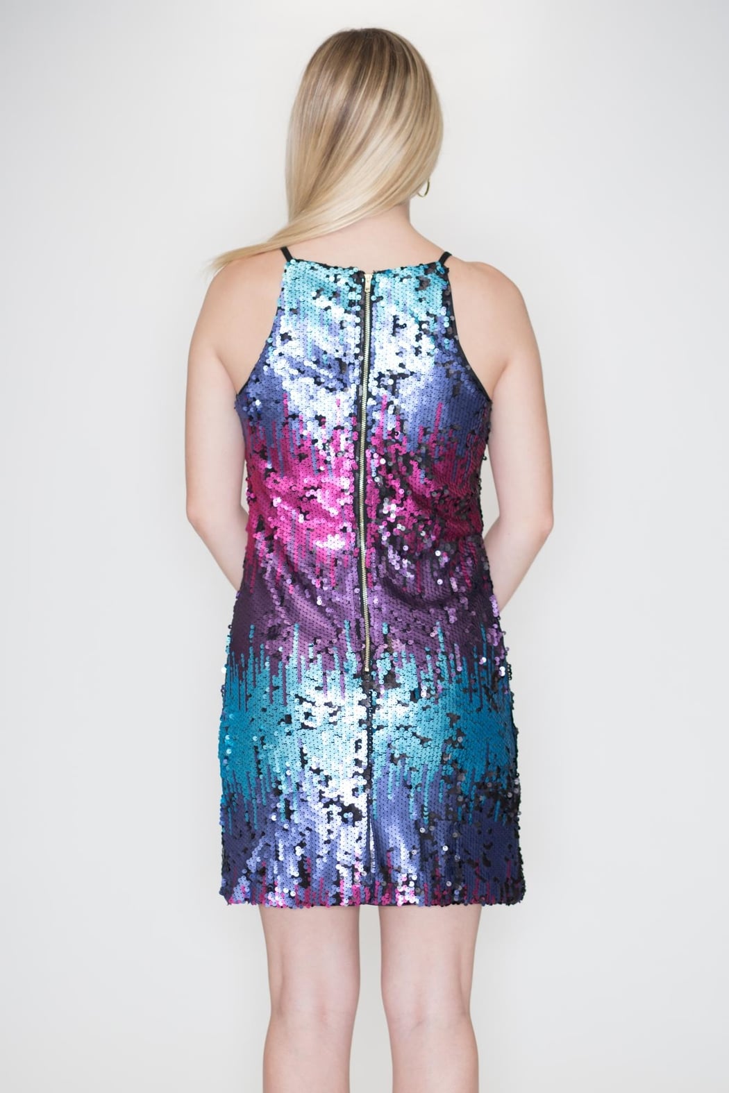 Aqua and purple sequin bodycon cami dress with back zipper closure. Lined.