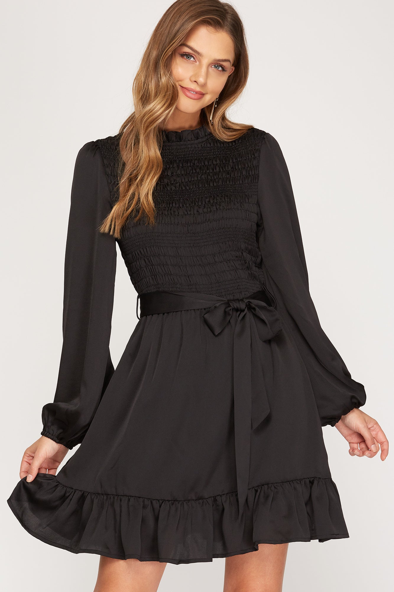 Satin Black Long Balloon Sleeve Smocked Dress with Waist Sash. Great dress for a holiday event or a date night!