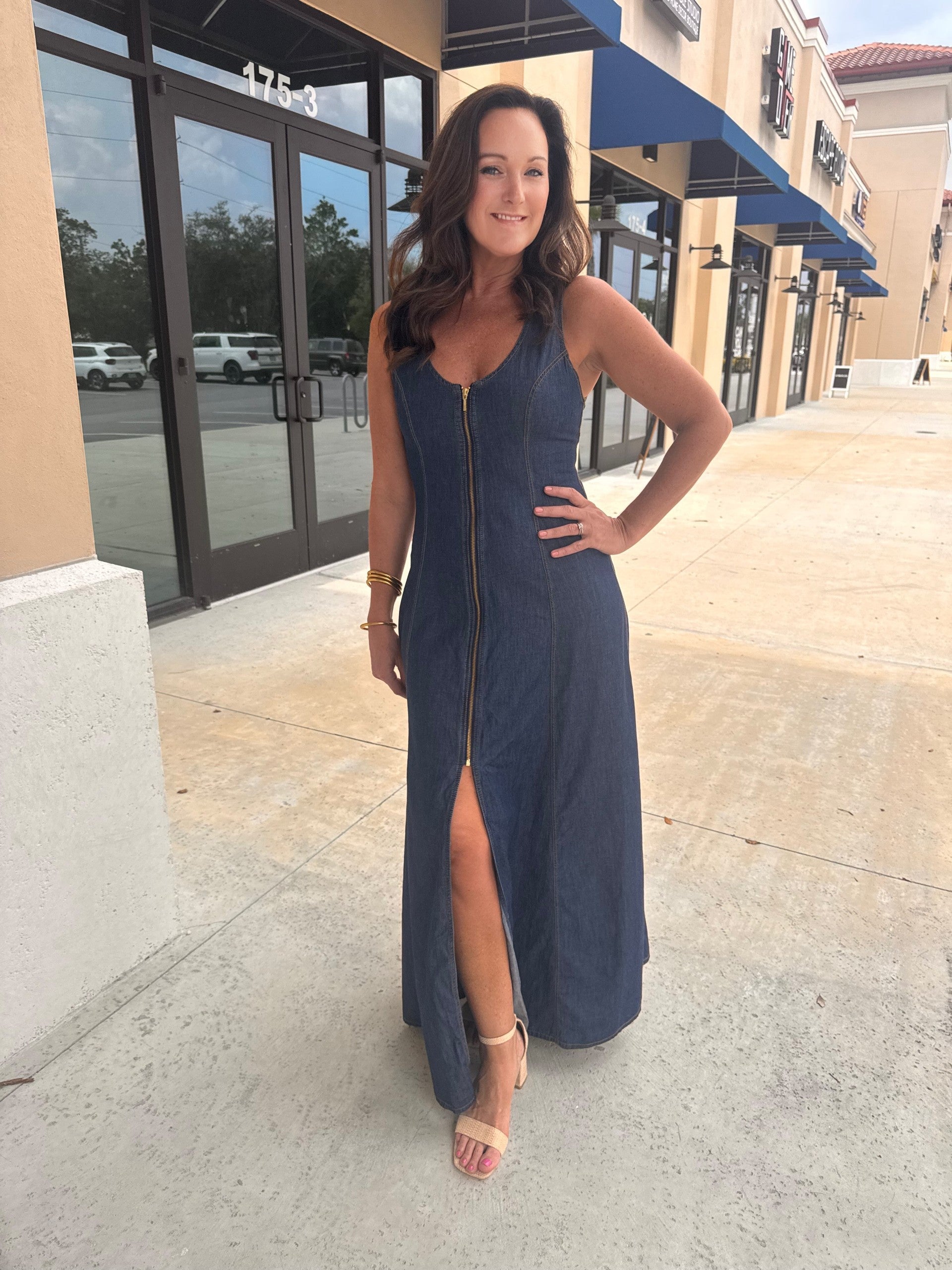 Sleek, Simple, and effortlessly striking maxi dress is your new go to for elevated ease. Crafted in a soft, structured fabric with just the right amount of stretch. Neckline features a functional front zipper with a modern twist. Perfect for day to night!