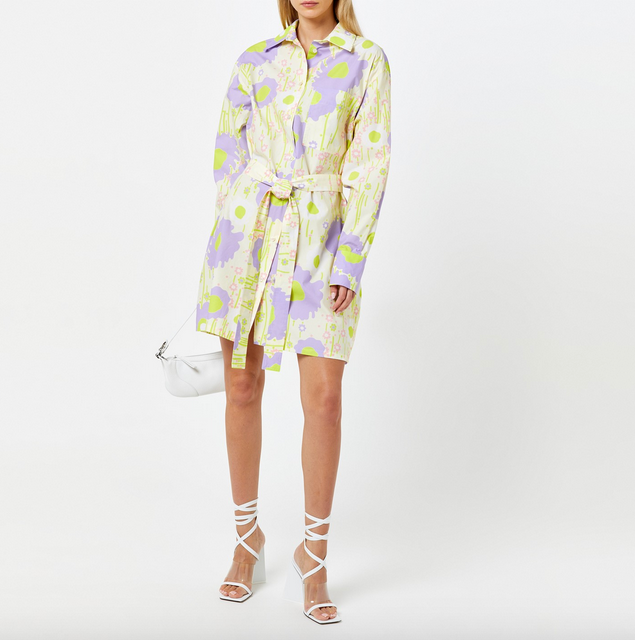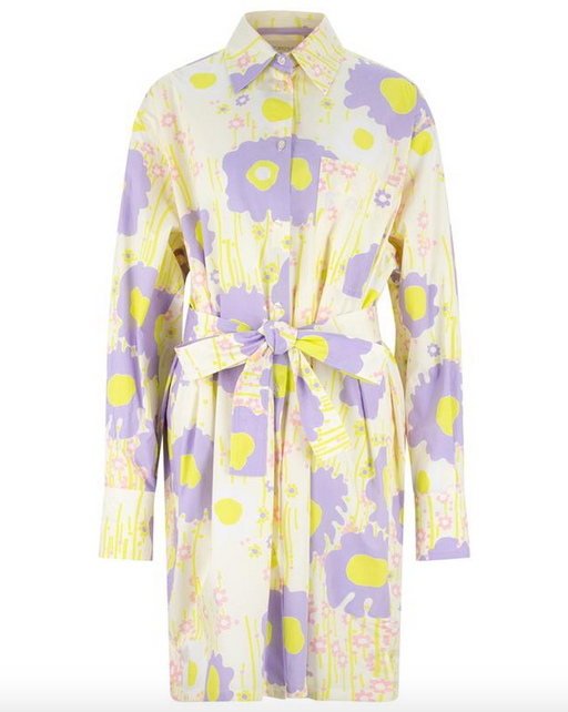 Baldi by Sportmax, an oversized cotton poplin shirt dress. Abstract floral print in pastel shades of yellow, lilac, pink and lemon. Belted, front button closure, shirt collar and cuffs, small side slits. Long sleeves, unlined.