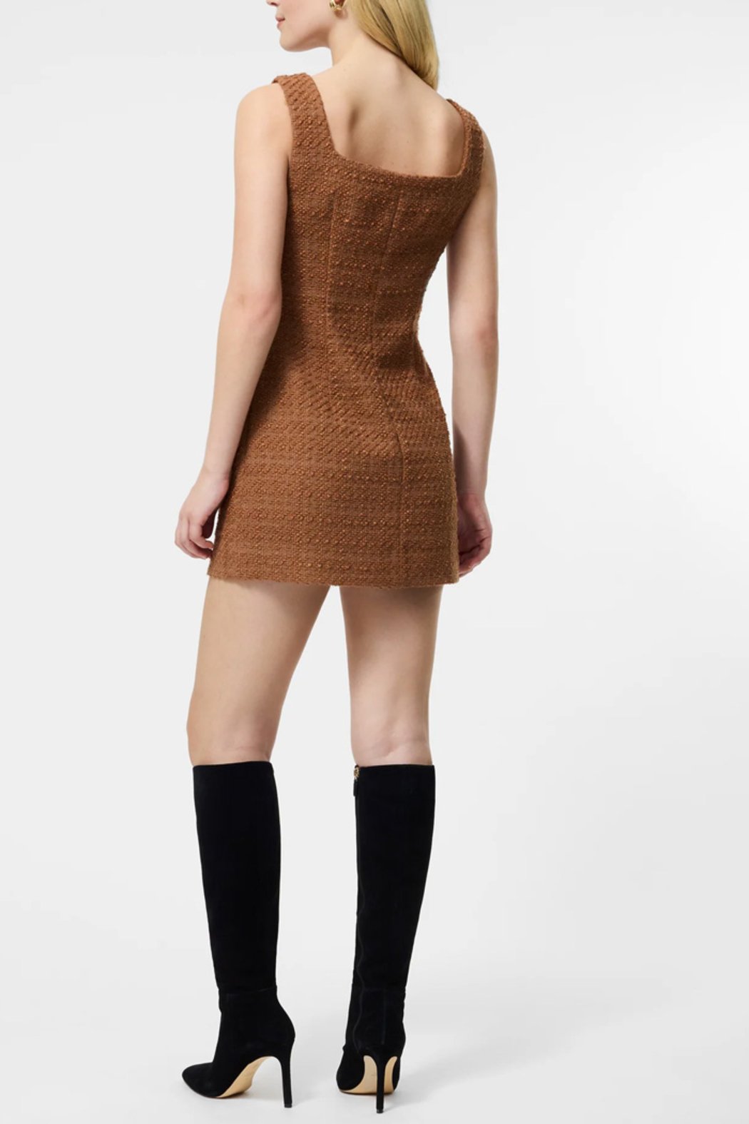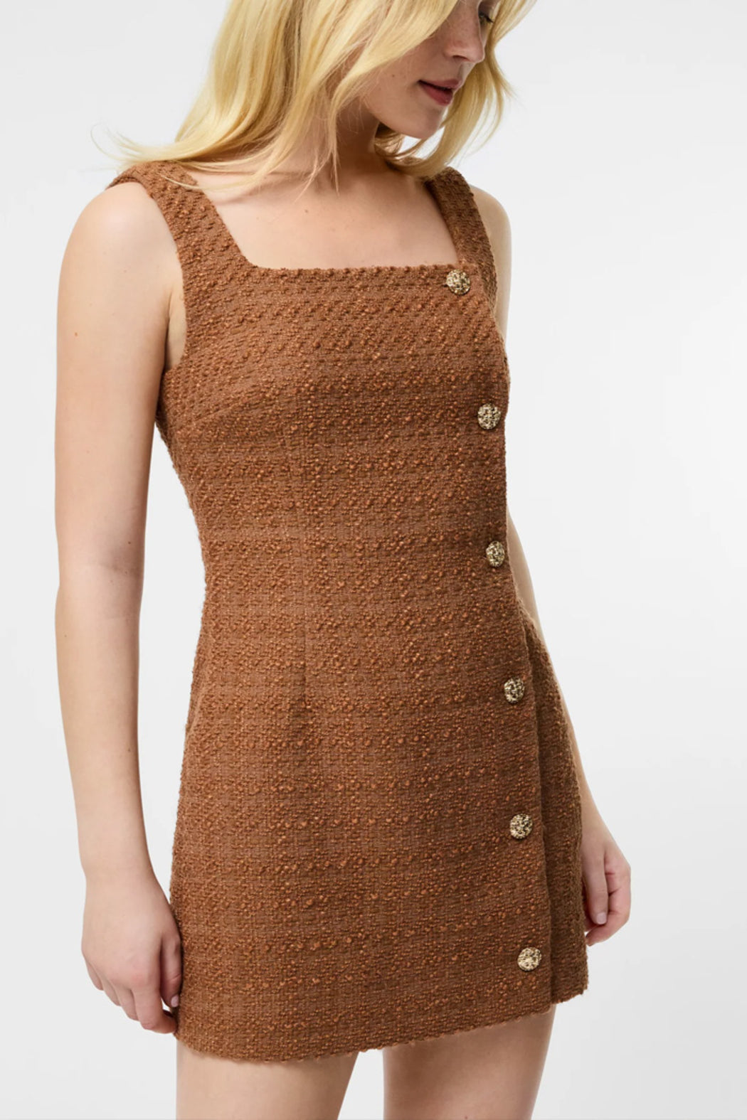 The Structured Tweed Square Neck Mini Dress brings classic texture with a fresh silhouette. Made from rich chocolate brown tweed, it features a square neckline and an off-center button placket finished with gold novelty buttons. Polished, tailored, and ready for wherever the day takes you.