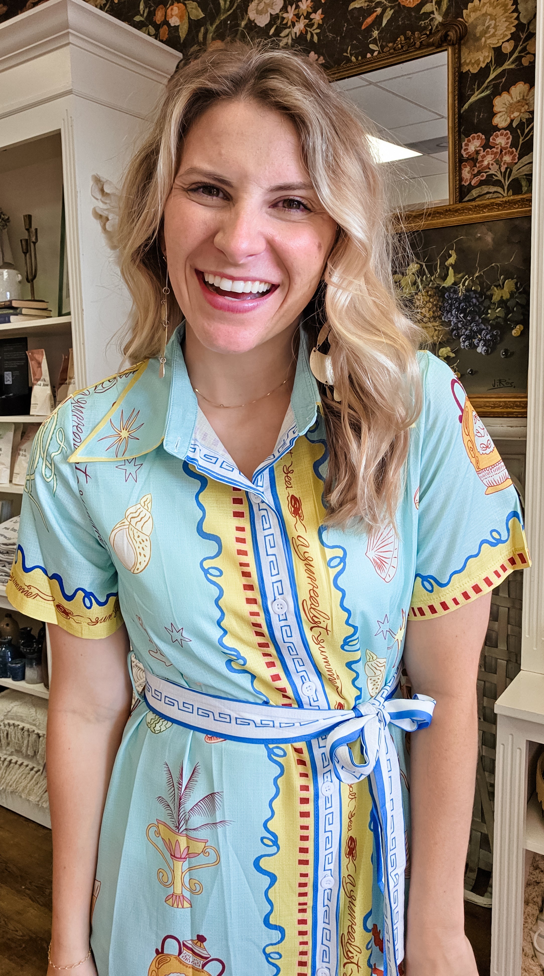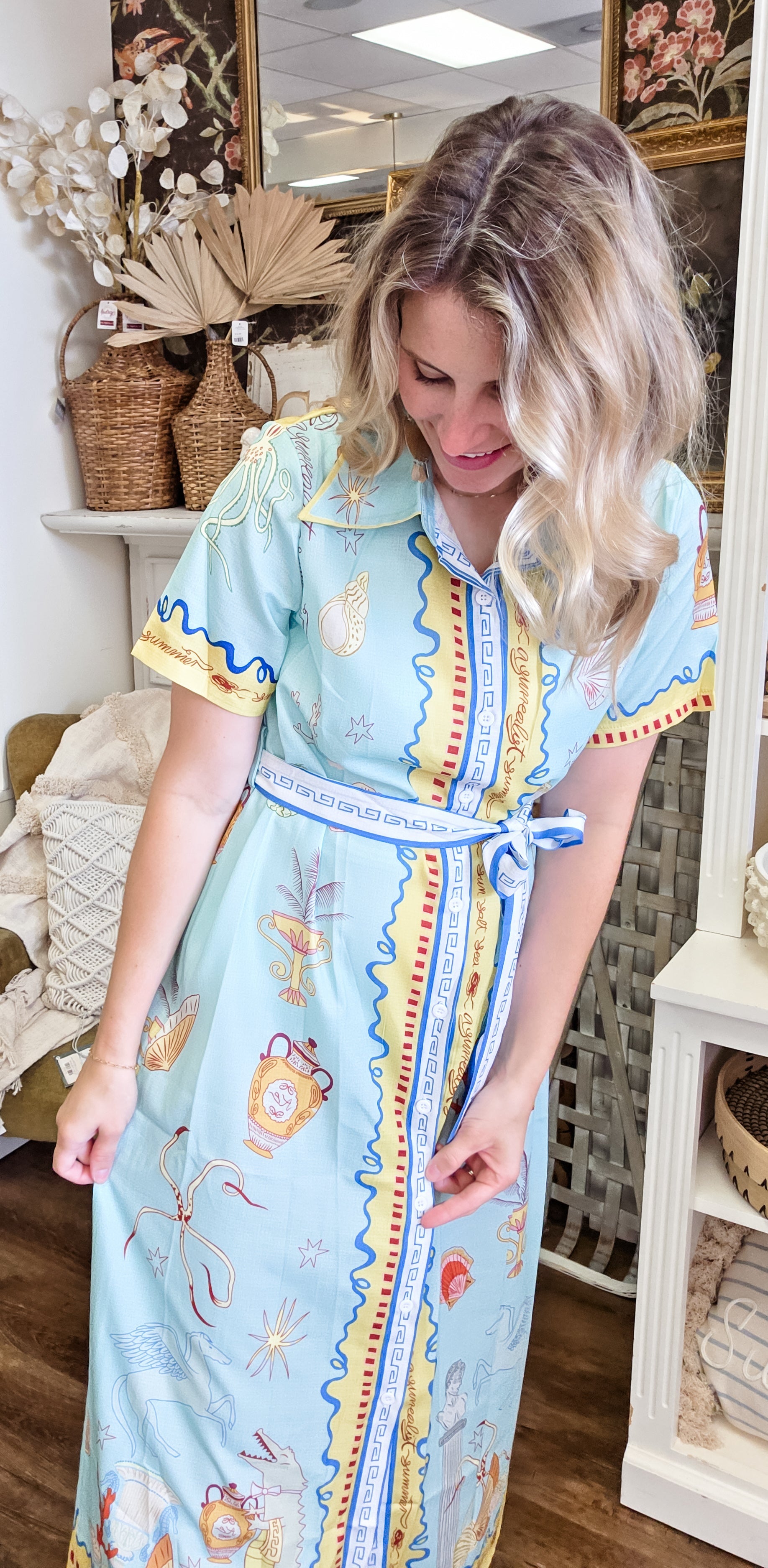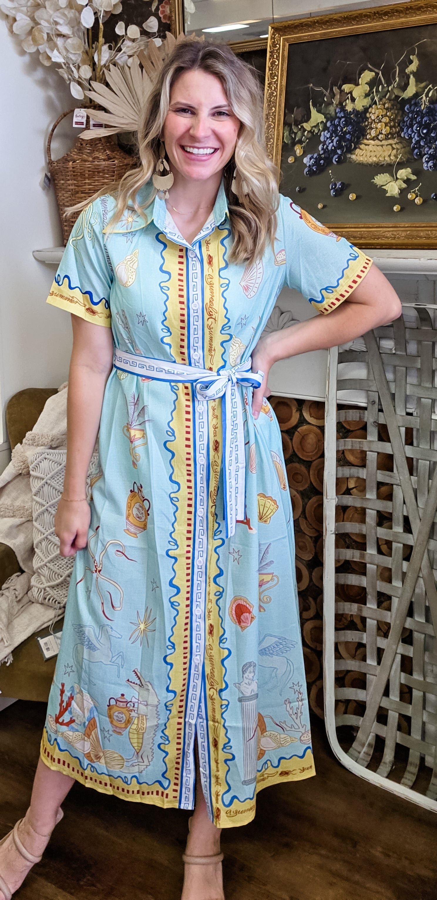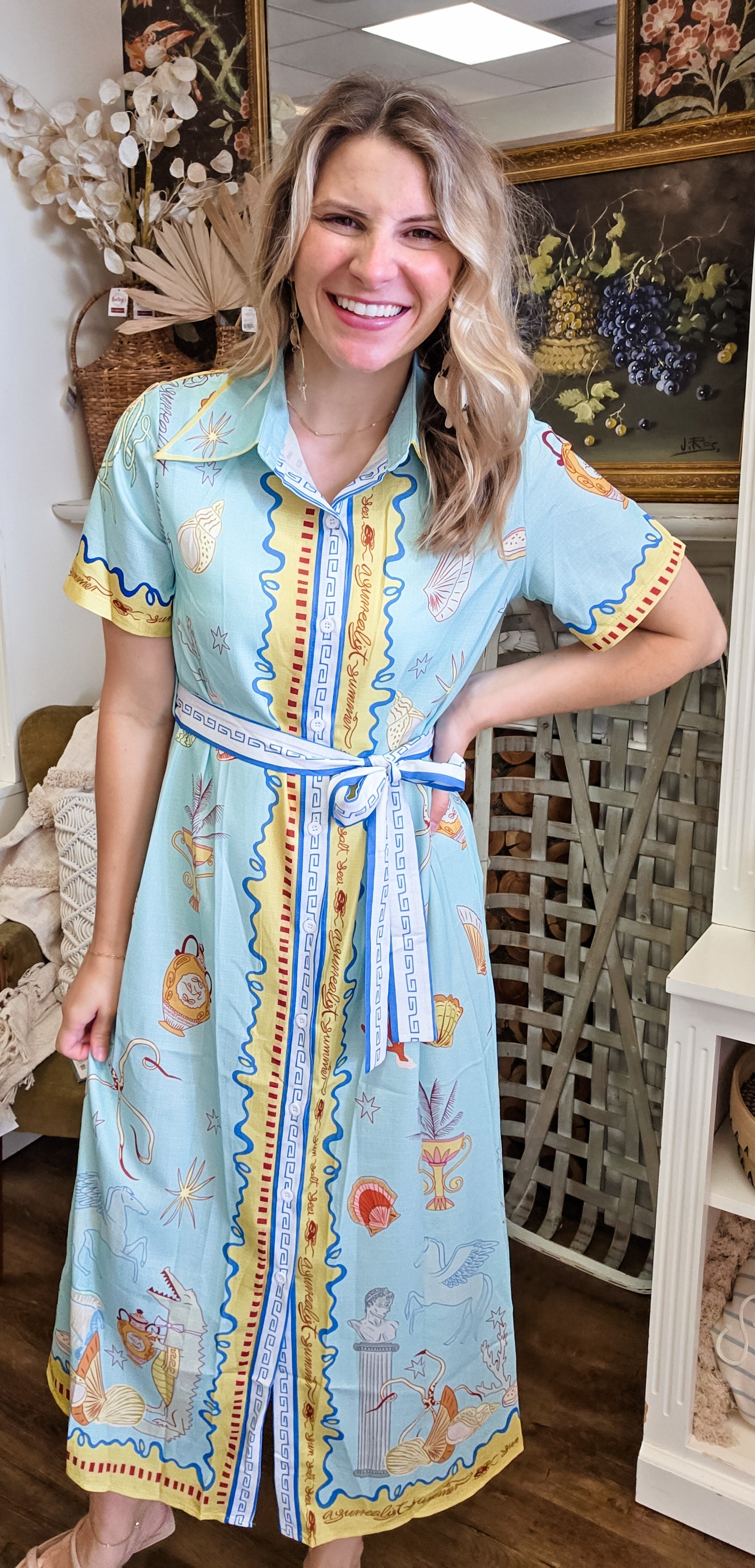 This button-up shirt dress features captivating Greek mythology-inspired patterns and a waist tie that accentuates your silhouette. Its artistic and lively design makes it a standout piece for any occasion.