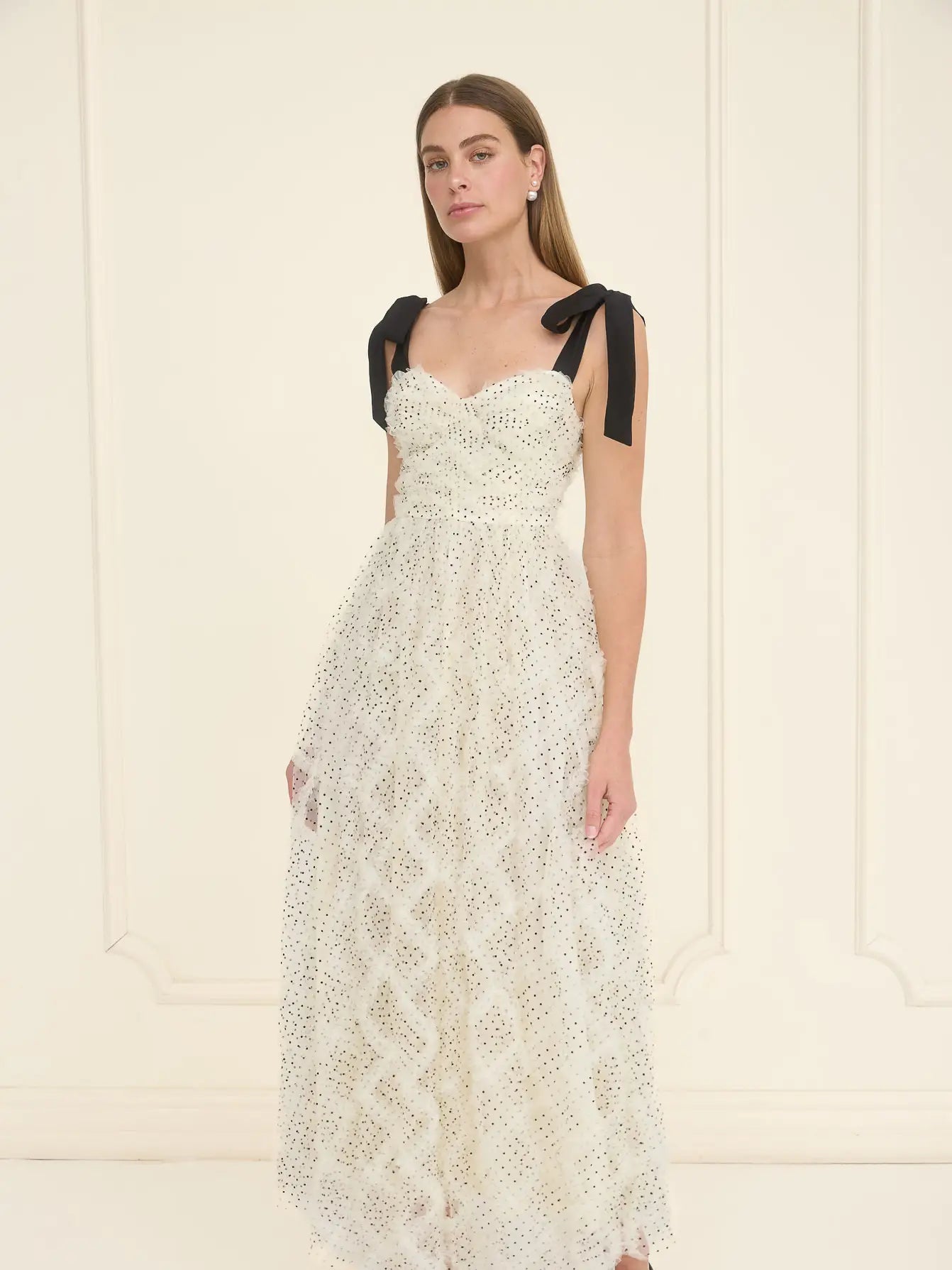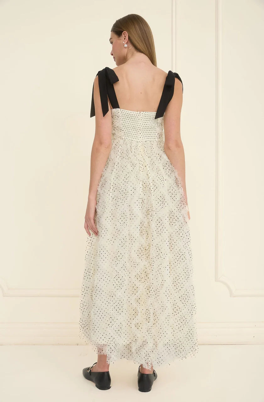 The Thalia Tulle Midi Dress combines timeless elegance with modern texture. Crafted from luxurious tulle adorned with delicate polka dots, this midi silhouette features a structured corset bodice that flatters and defines. Perfect for winter black-tie occasions, galas, and formal celebrations, it delivers refined sophistication with every wear. The textured fabric adds visual interest while maintaining an understated glamour ideal for the season's most prestigious events.