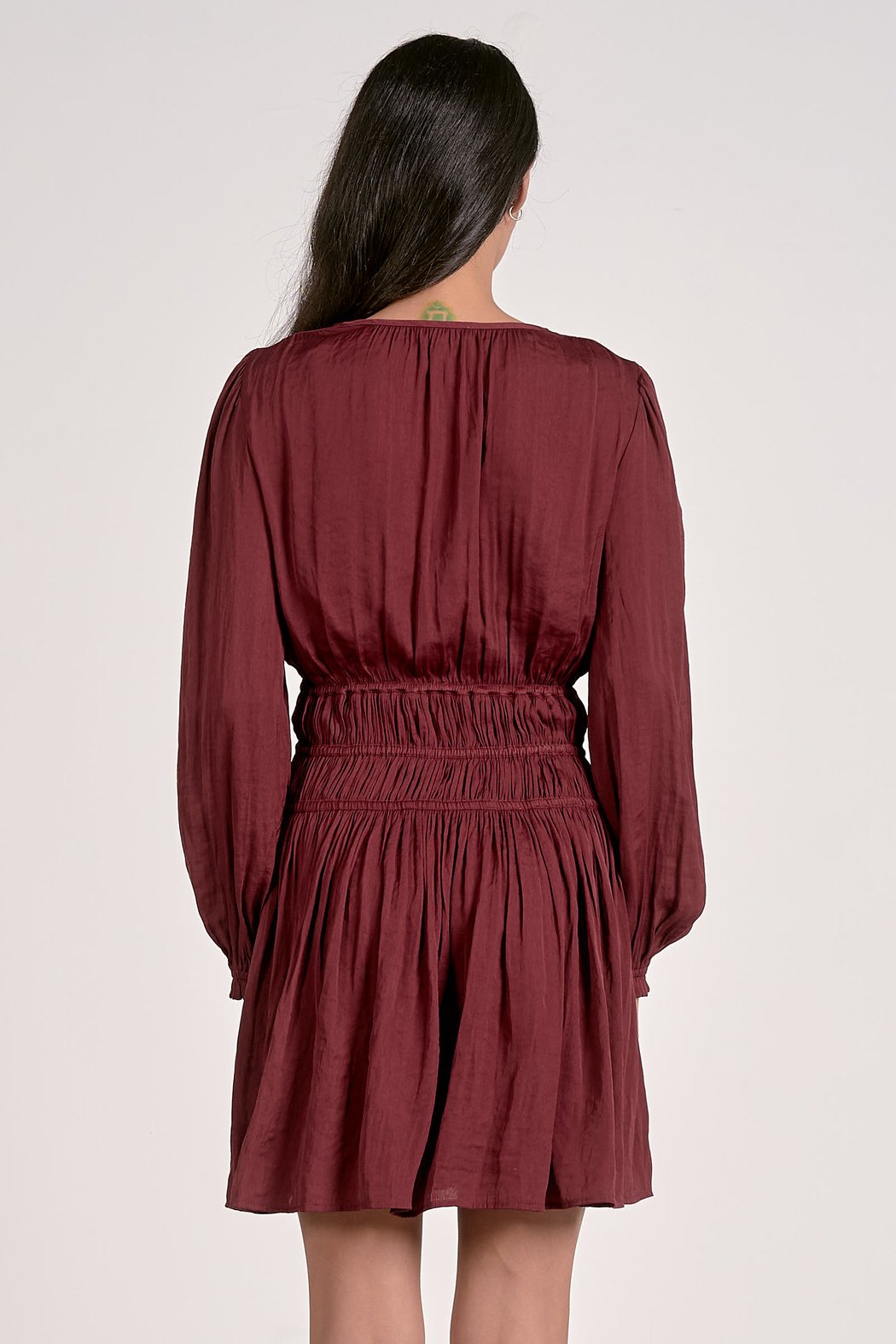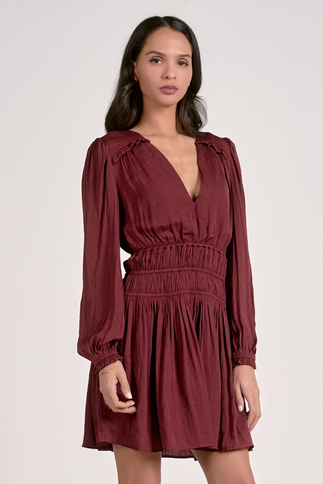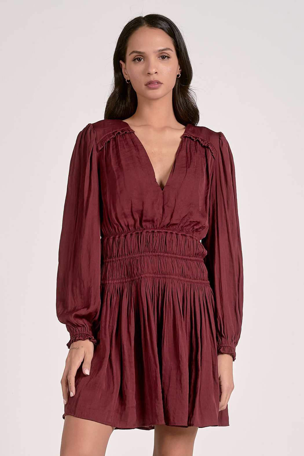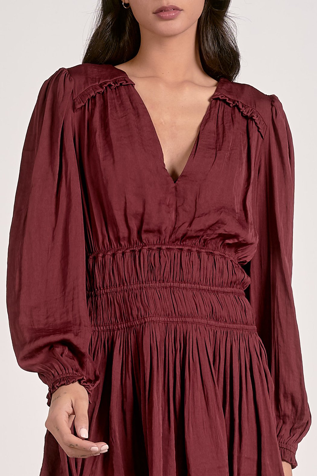 Meet your new go-to for date nights, parties, and everything in between. This mini dress stuns in a deep burgundy shade that feels both romantic and refined. The plunging V-neckline adds just the right touch of allure, while soft puff sleeves with smocked cuffs bring a graceful, airy finish. A wide smocked waistband cinches at the waist to beautifully highlight your natural shape, creating a flattering and effortless silhouette.