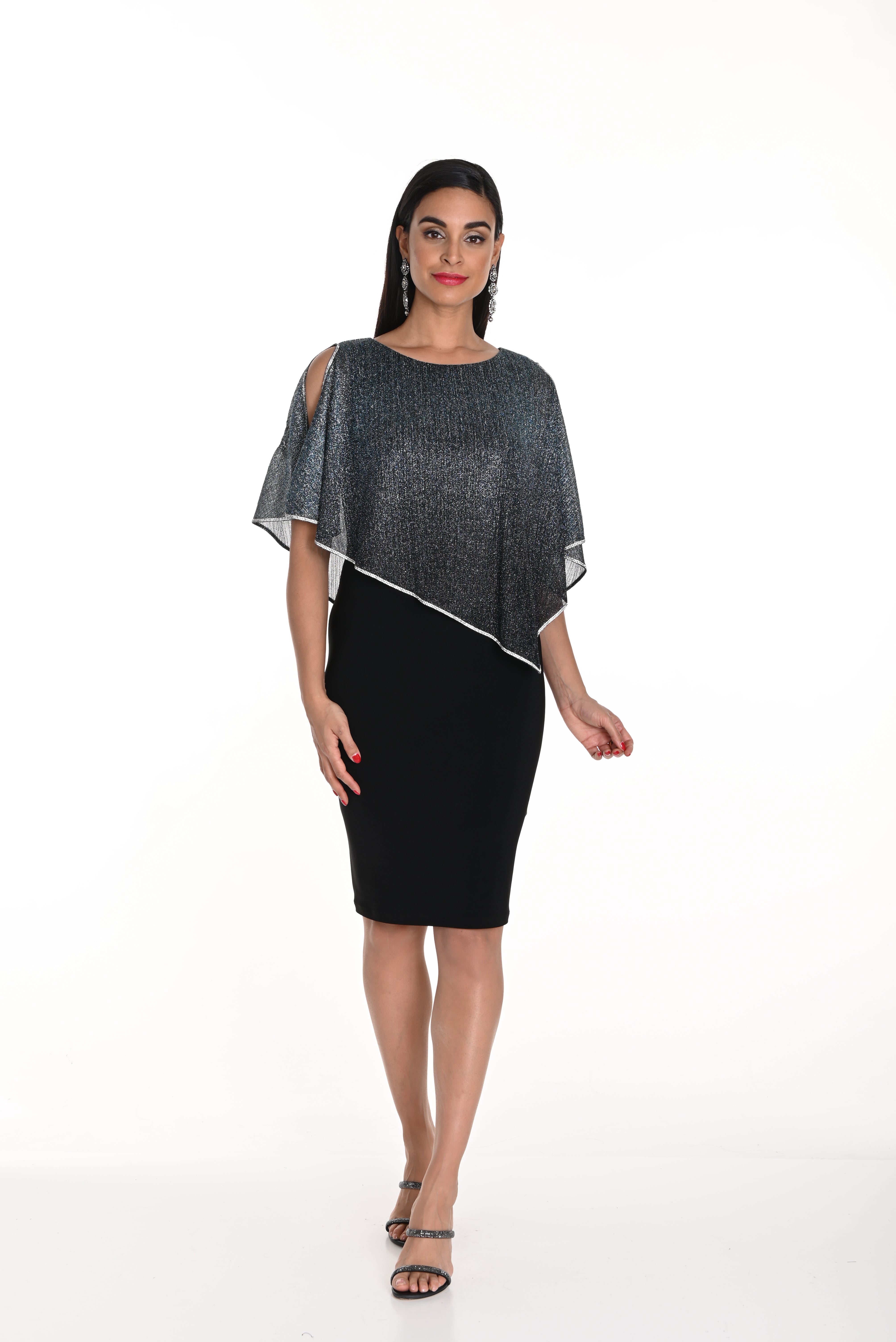 This is a gorgeous knee length sheath dress. It has a gorgeous metallic bateau neckline that adds just a touch of sparkle to the perfect little black dress. It doesn't have a zipper or any pockets so it maintains it's perfect seamless appearance. This dress is a timeless piece to have in your closet.