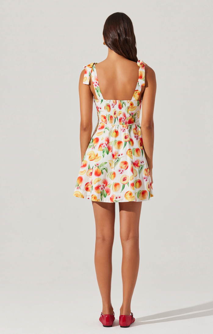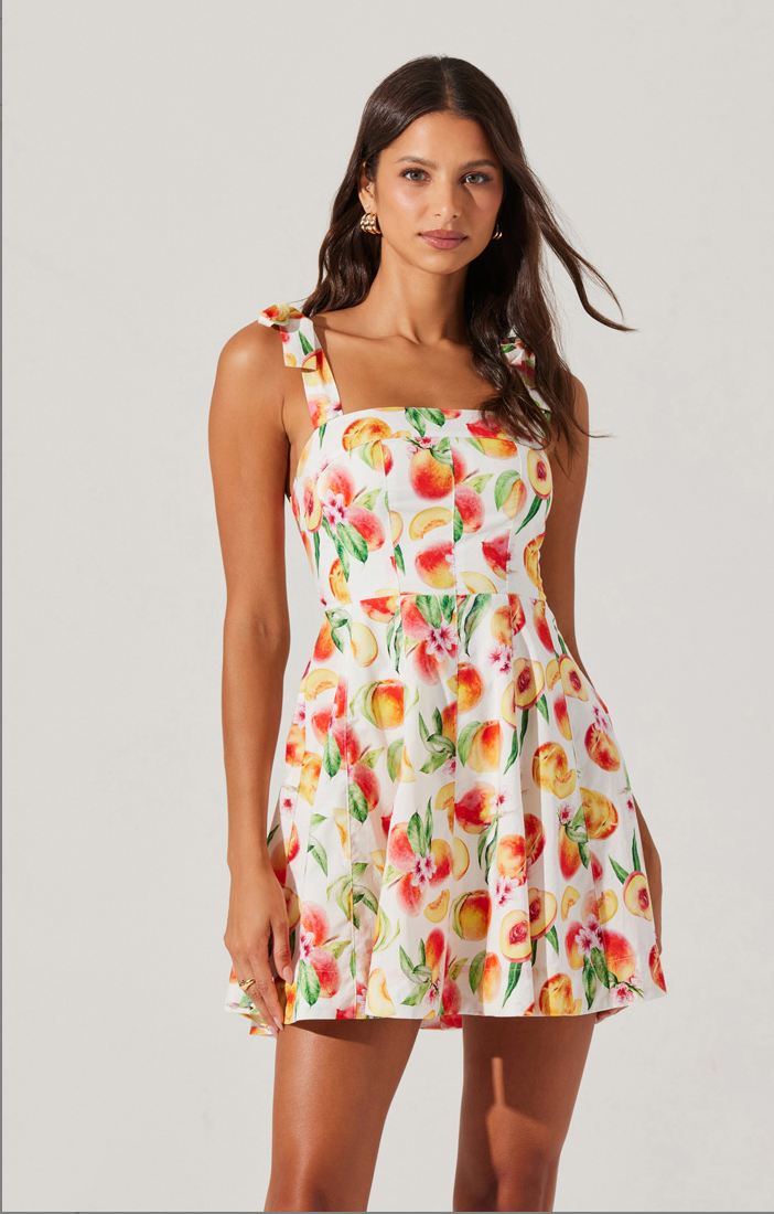 This delightful mini dress features a vibrant fruit-inspired print, showcasing peaches and florals that exude a cheerful summer vibe. The square neckline and playful ruffled straps add a charming touch, while the flared skirt creates a fun, flirty silhouette. Perfect for picnics, brunches, or casual outings, this dress pairs beautifully with sandals or wedges for a fresh and stylish look. Embrace the season with this eye-catching piece!