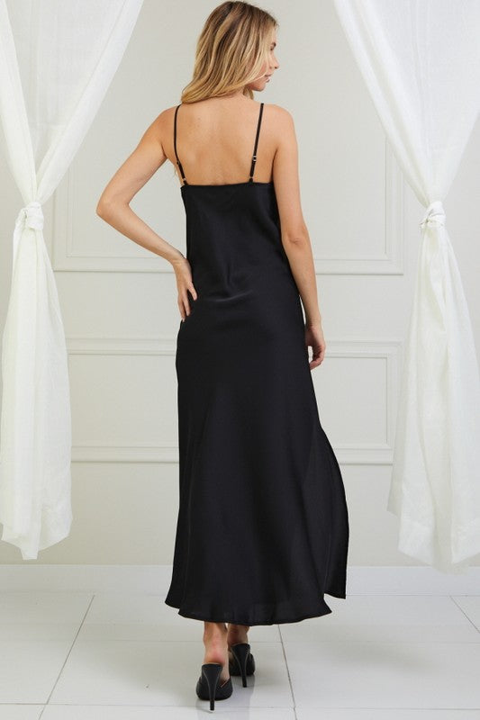 •LOOK: Opaque black satin slip dress. This dress has adjustable spaghetti straps, and a soft cowl neck. It has a slight a-line so that it can be worn with the slits open or closed.