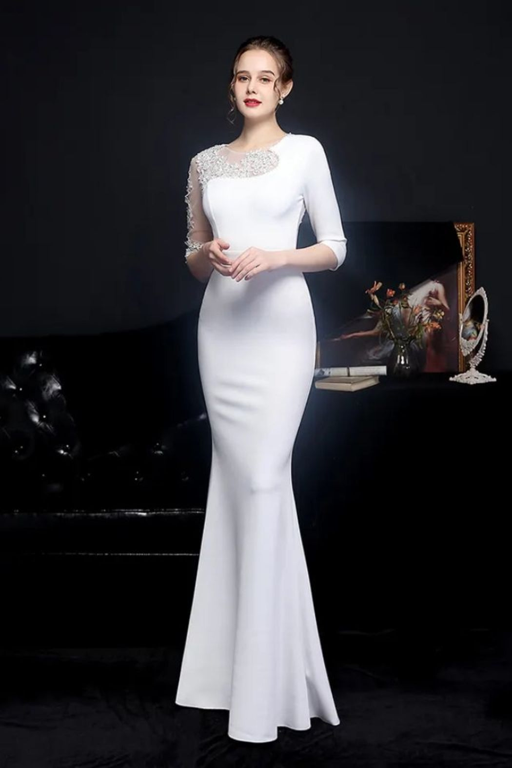 Elegant White Evening Gown Lace & Crystal Detail - Half Trumpet - Formal Evening Gowns Product Details: ★ Pure elegance. Stand out yet be understated. Elegant and graceful. Very high end classy look. ★ Versatile. You can wear it to formal events, corporate events, cocktail parties, the opera, weddings, holiday balls, graduation parties - you name it. Length: Maxi - Long floor length Detail: Lace, Crystal, Beading Anti-Static, Anti-wrinkle, Breathable Dry Clean only Built in lightly padded bra Sleeve length: Three Quarter Neckline: O-Neck Decoration: Appliques Zipper closure Color: White. In the picture, probably because of flash photography, the dress looks bluish white. In normal light, it looks regular white or a tad towards beige. Sizes: M, XL Elegant White Evening Gown Lace & Crystal Detail - Half Trumpet - Formal Evening Gowns