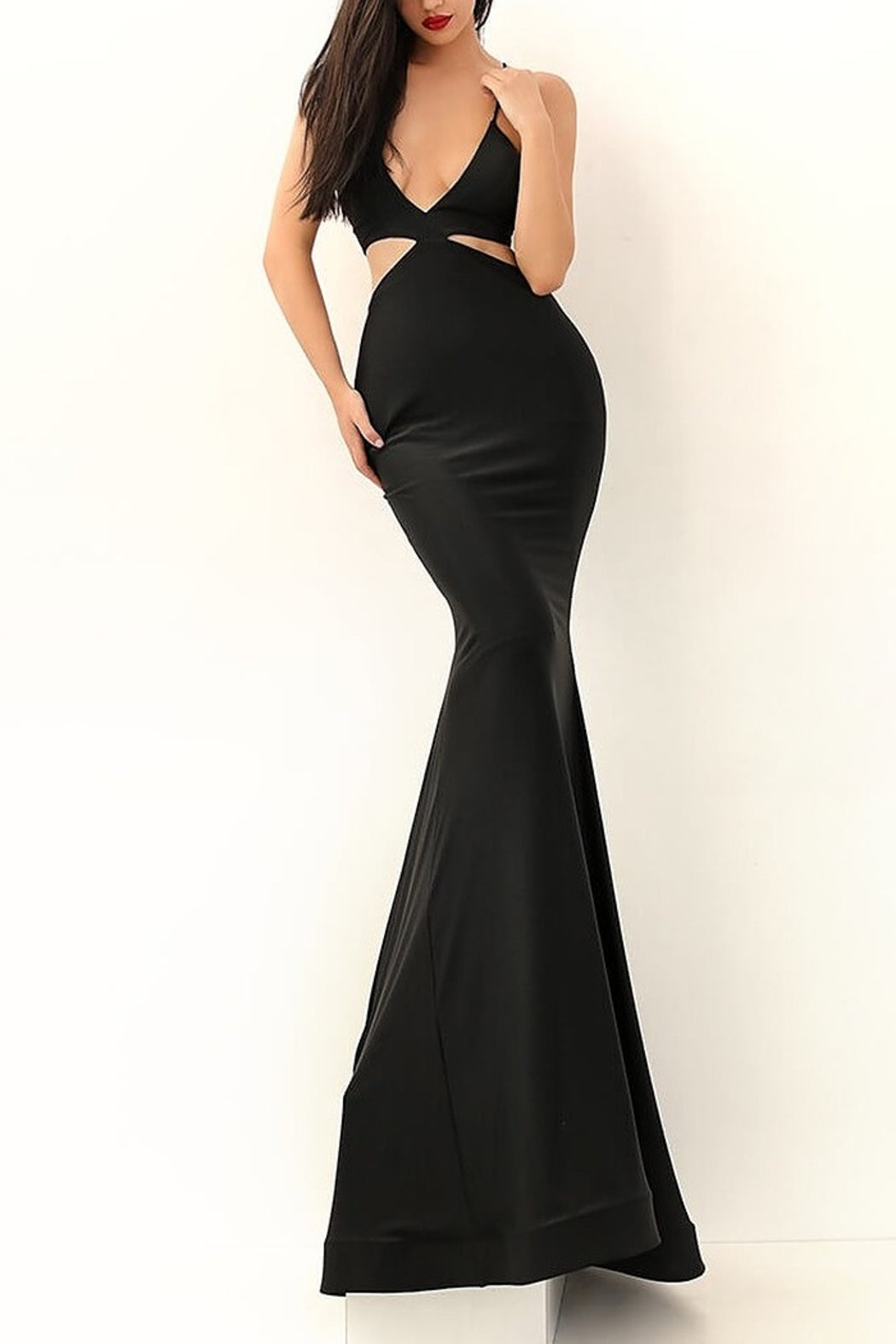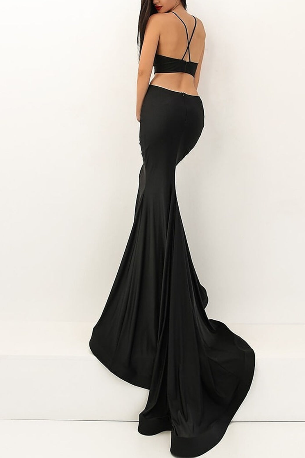This Tarik Ediz 50657 black prom dress features a plunging neckline and side-waist cutouts, held with spaghetti straps that crisscross at the exposed back. This form-fitting jersey gown finishes in a flared horsehair hem and semi-chapel train.