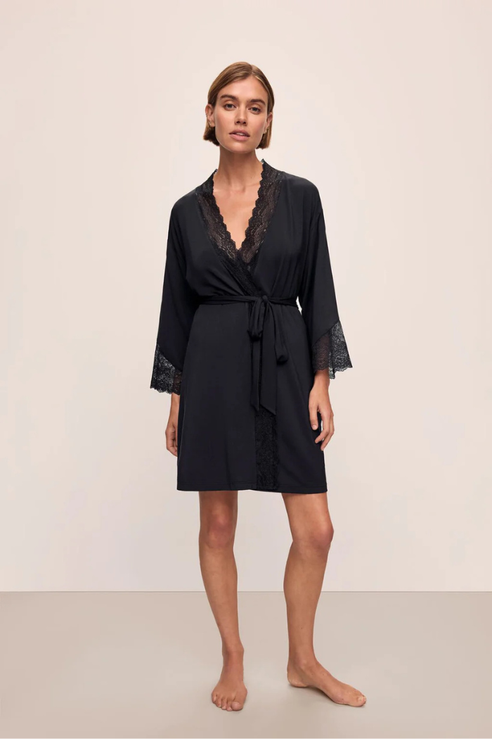 This relaxed, long-sleeve short robe features an adjustable belt, an interior tie for security, and delicate lace details along the neckband and sleeves. Pairs perfectly with the Lara Thong and Lara Bralette.