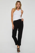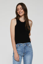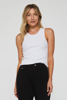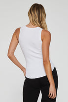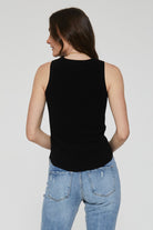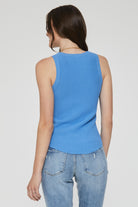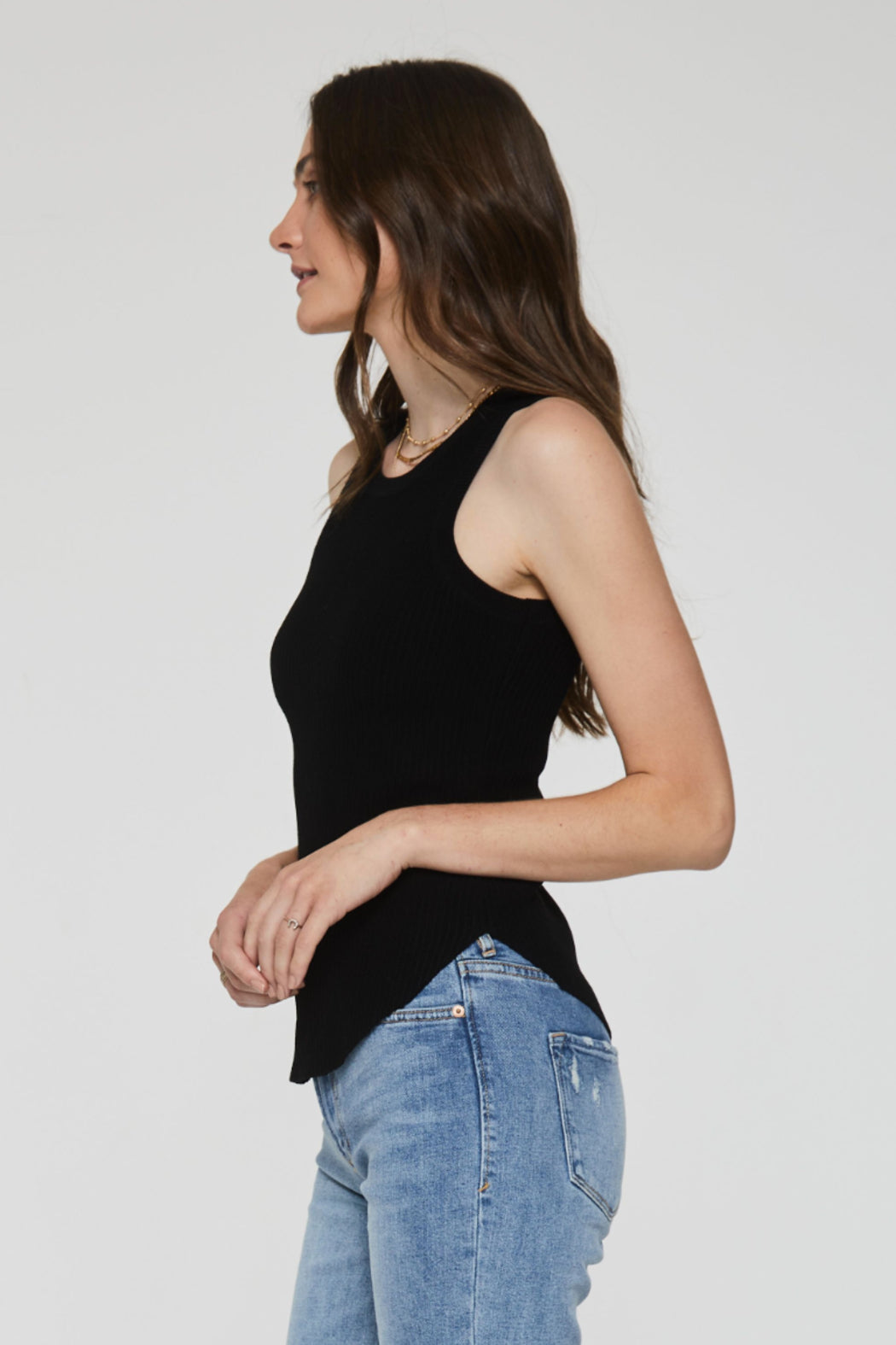 High neck, sleeveless rib top. Perfect to wear on its own or under other pieces for a layered look.