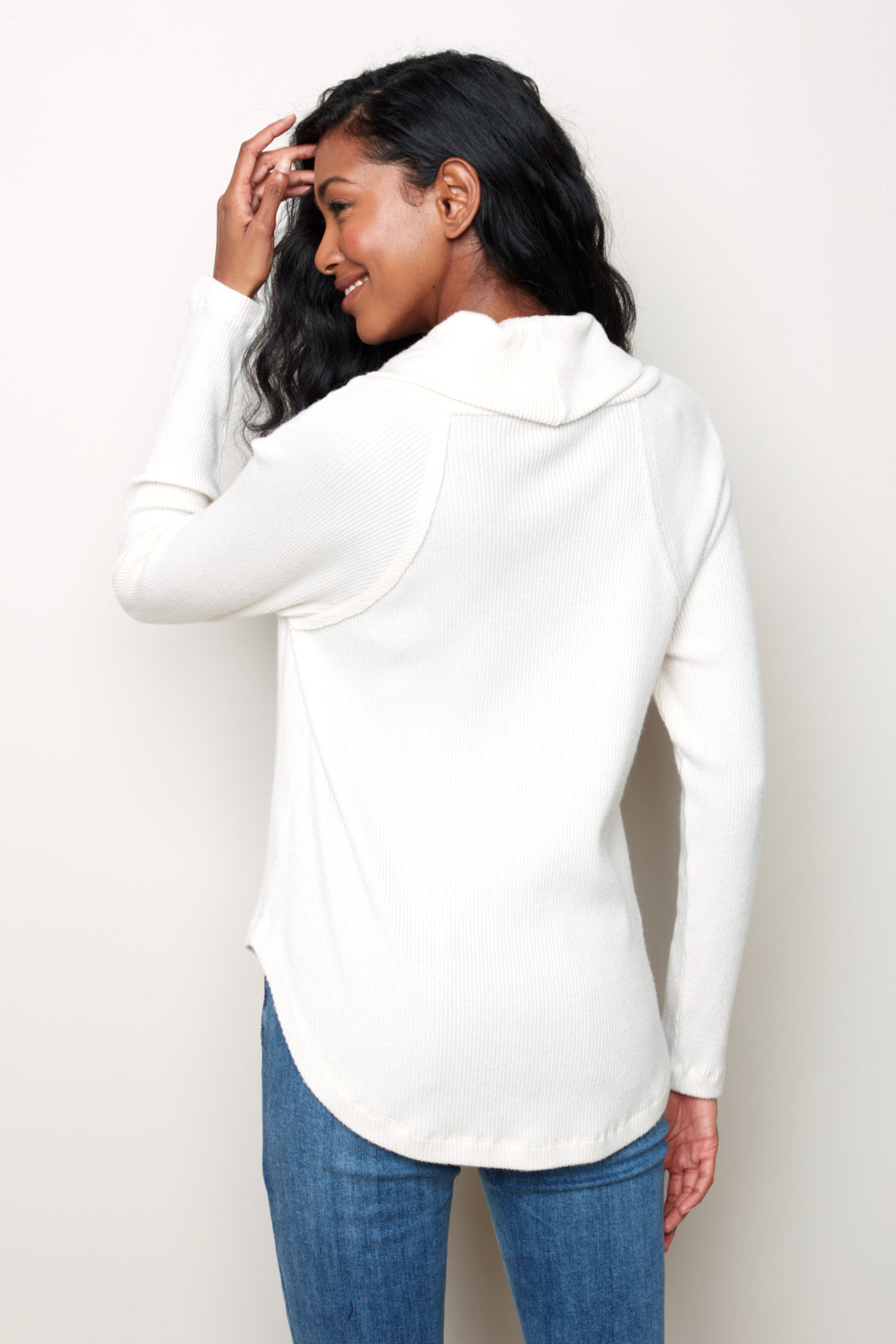 Feel the fall love in this soft ribbed women’s top with a cowl neck and long Raglan sleeves. Bonus: You can get it in a variety of colors.