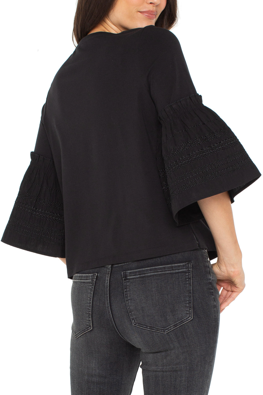 A study in contrasts, this black knit-to-woven top is elevated with flared sleeves traced in intricate embroidery. The 3/4 sleeve length and clean crew neckline balance its statement details, making it an easy yet artful choice for day or night.