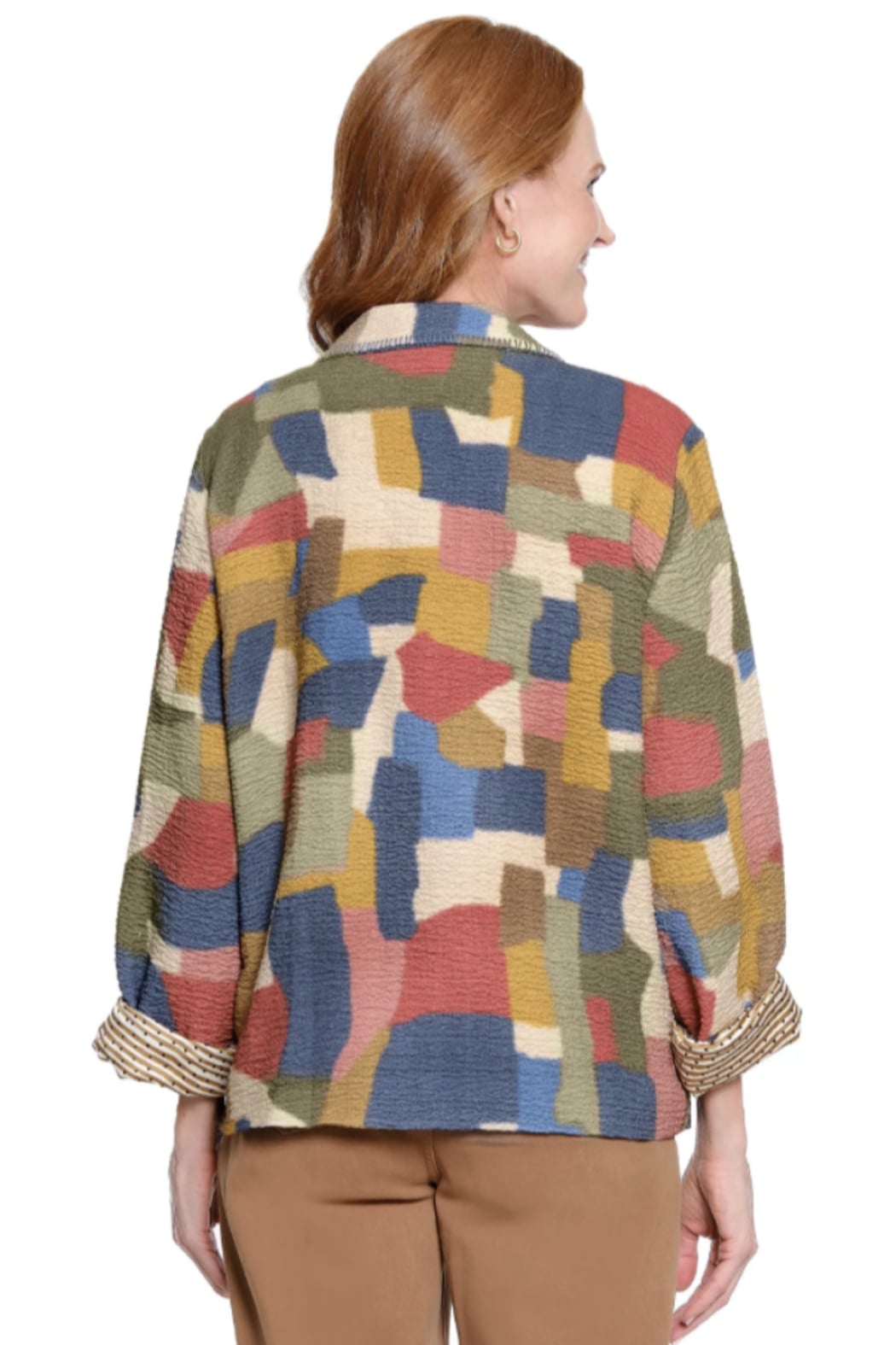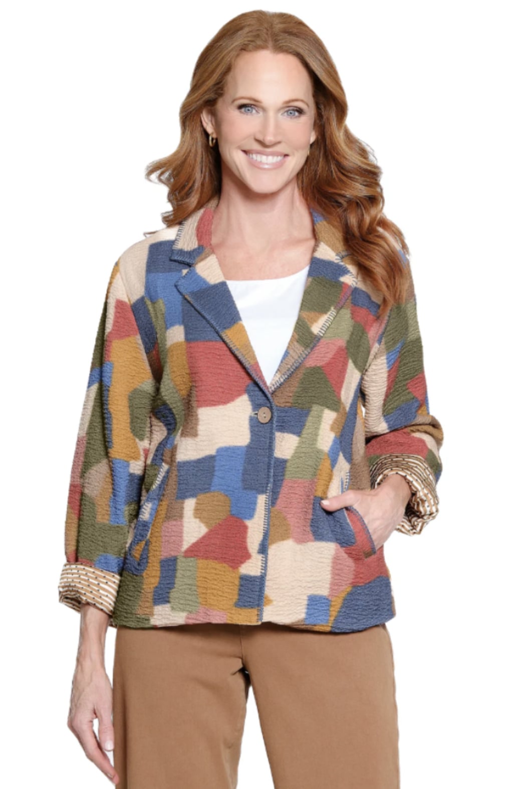 Make a statement with this abstract geo print jacket, featuring a fully lined interior for structure and comfort. The button-front design offers classic versatility, while the acrylic/wool blend provides warmth with a soft, wearable texture.