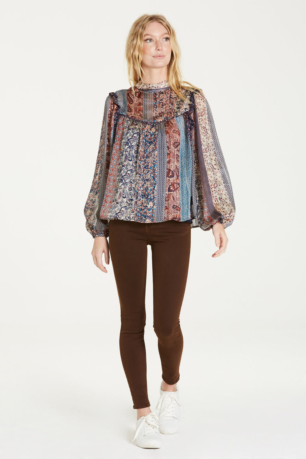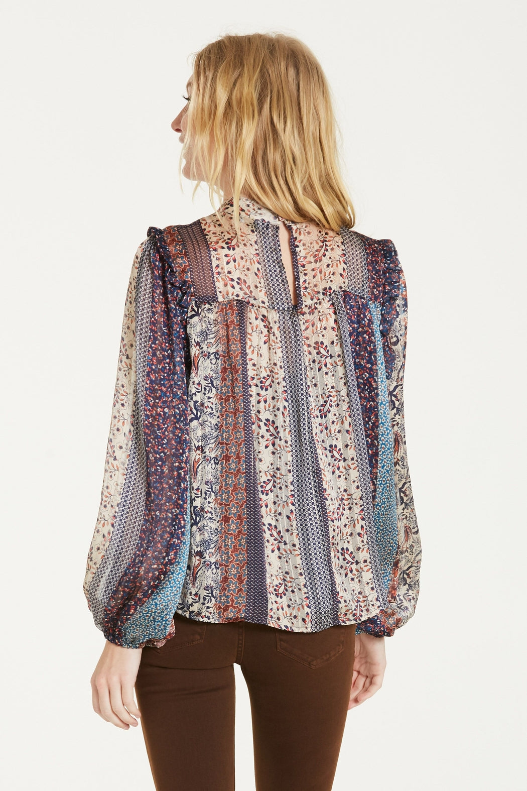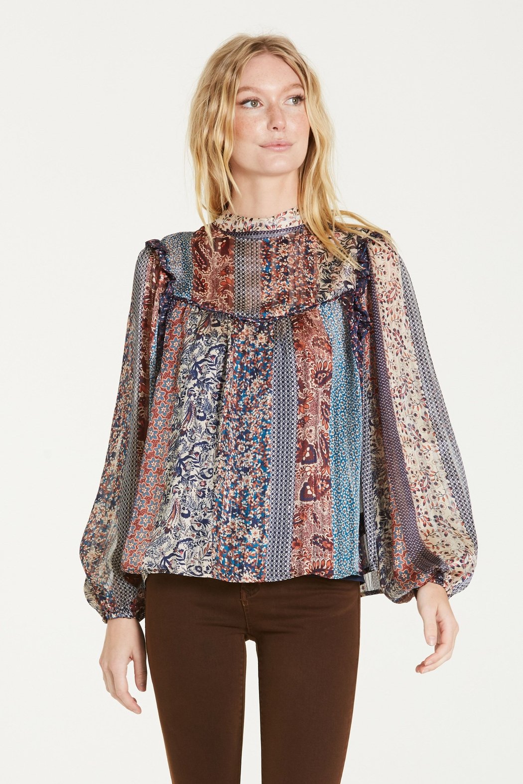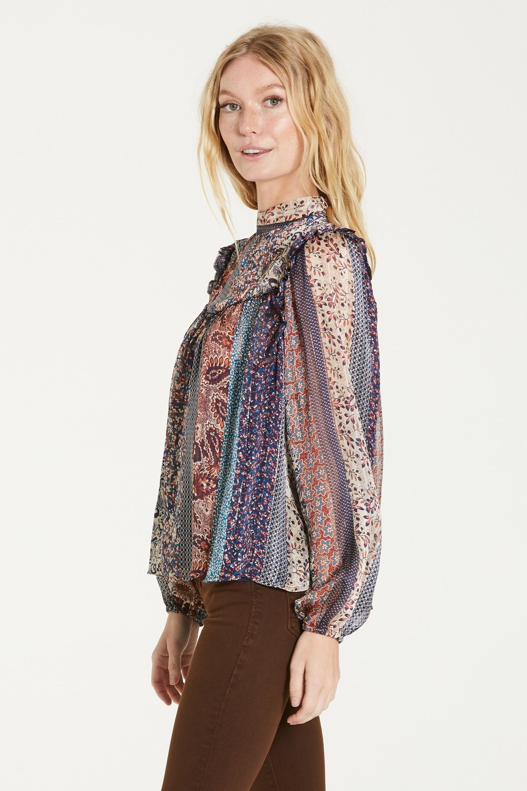 Ruffle shoulder puff long sleeve top finished with back neck keyhole. Multi print with lurex shine woven on relaxed fit, styled with contrast ruffle, elastic shirred cuff. Body length from HPS: 25", Sleeve length: 24 1/2", Bust: 52" 100% POLYESTER Hand wash cold, Dry flat Imported