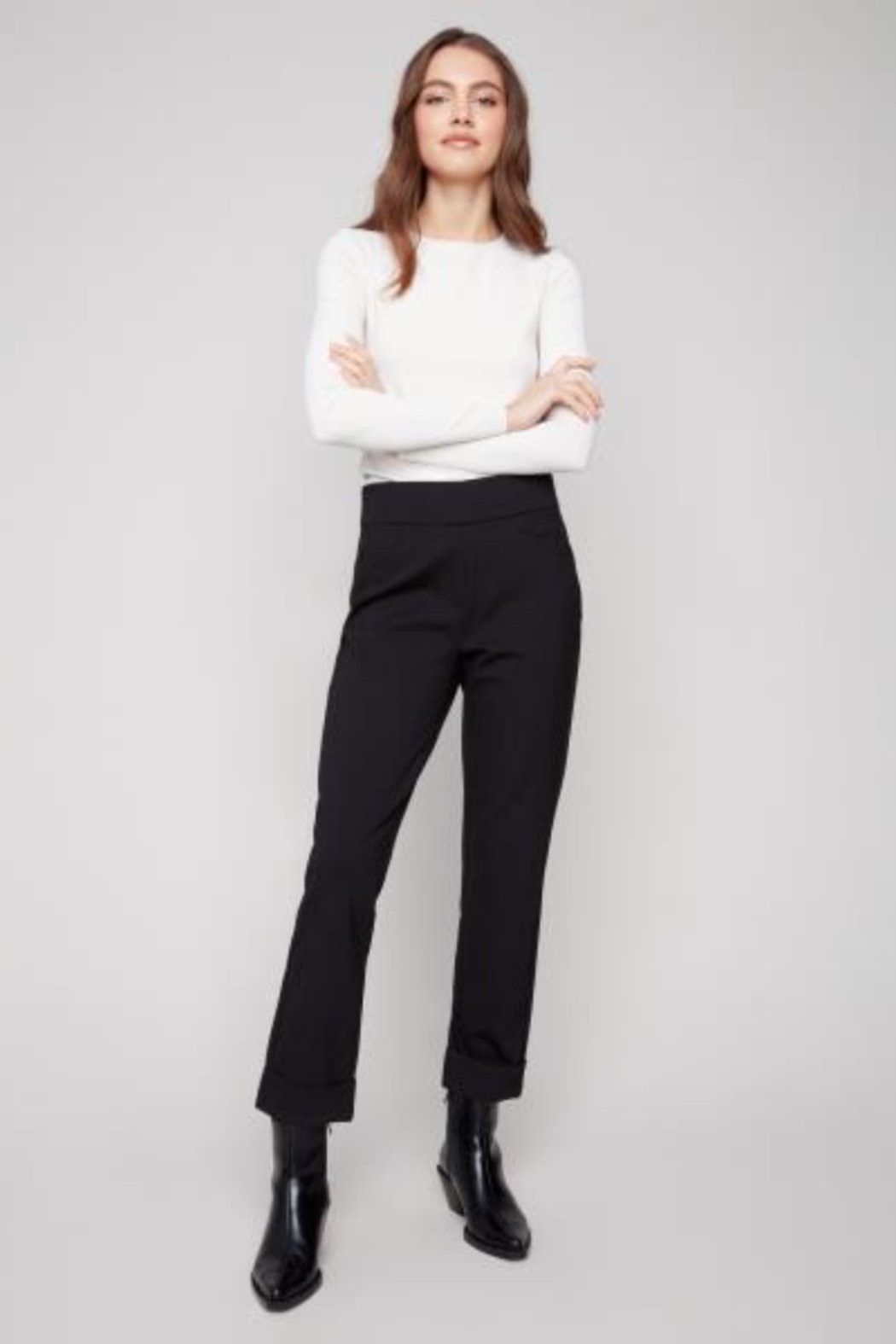 Add a touch of tailored sophistication to your wardrobe with Charlie B's Black Rolled Cuff Pants with Pockets. These versatile black pants feature a flattering high-waisted fit and a modern, straight-leg silhouette. The standout detail is the wide, cuffed hem, which gives them a polished and contemporary edge. Made from a smooth, structured fabric, they provide a clean and elegant line, perfect for both professional and casual settings.