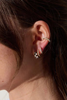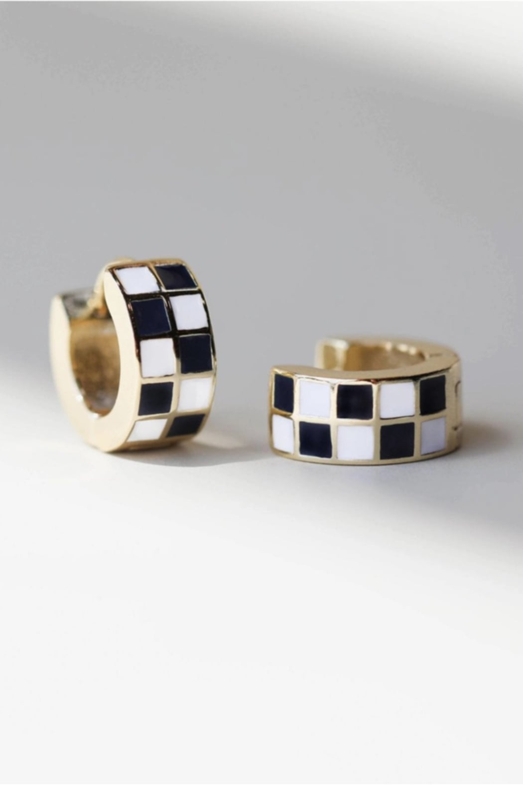 These Black & White Checkered Enamel Huggies are small gold-tone hoop earrings finished with glossy enamel in a classic checkerboard pattern. The curved huggie silhouette sits close to the lobe for a subtle, modern look that layers well with other piercings. Light in weight and polished for everyday wear, the enamel panels add a graphic, contemporary edge to any outfit.
