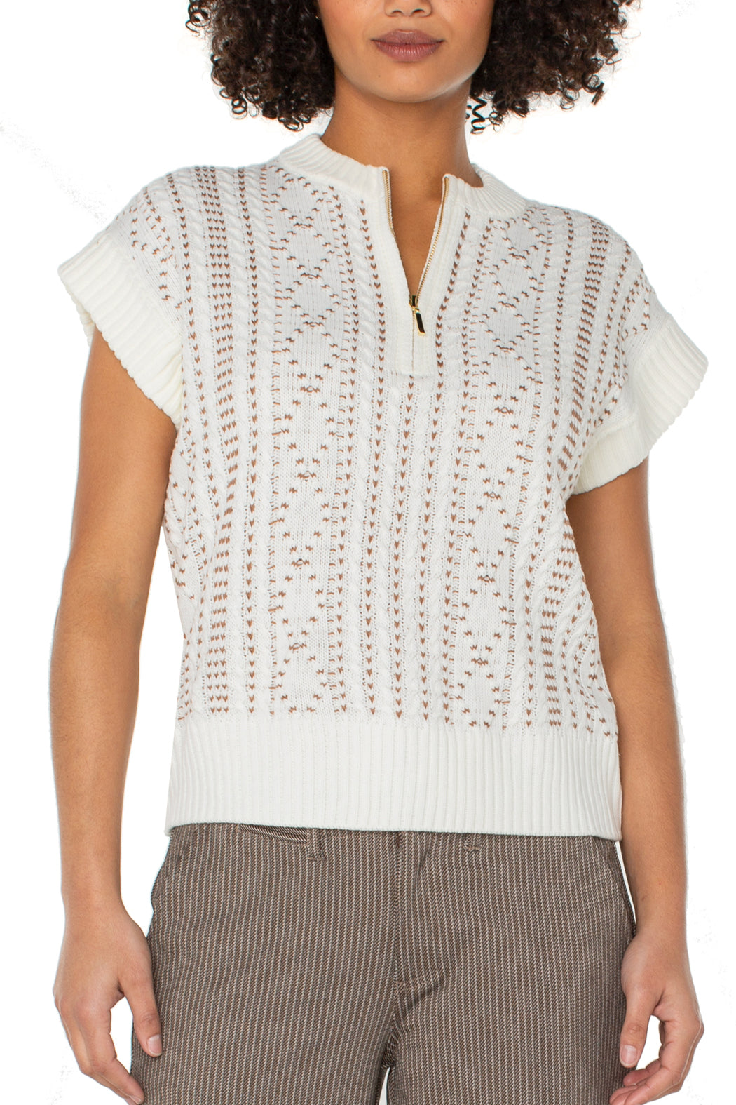 Experience timeless style with our Cable Knit Zip Sweater. This classic-fit sweater features intricate cable and diamond knit patterns in a delicate cream and brown design. The modern half-zip collar adds a versatile touch, letting you wear it open for a relaxed look or zipped for a polished finish. Made from a soft, high-quality knit, it’s the perfect piece for easy layering and a cozy yet chic feel.