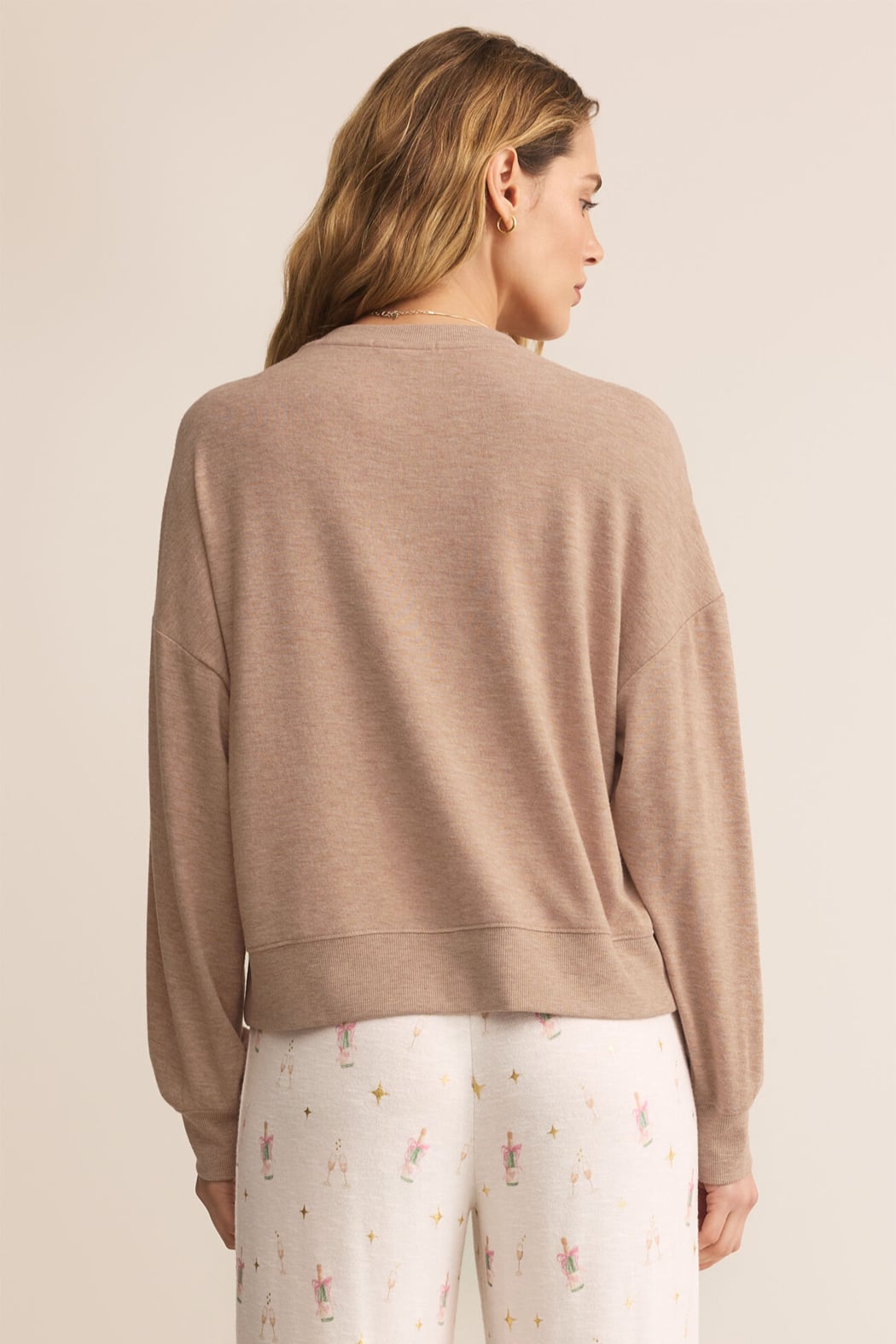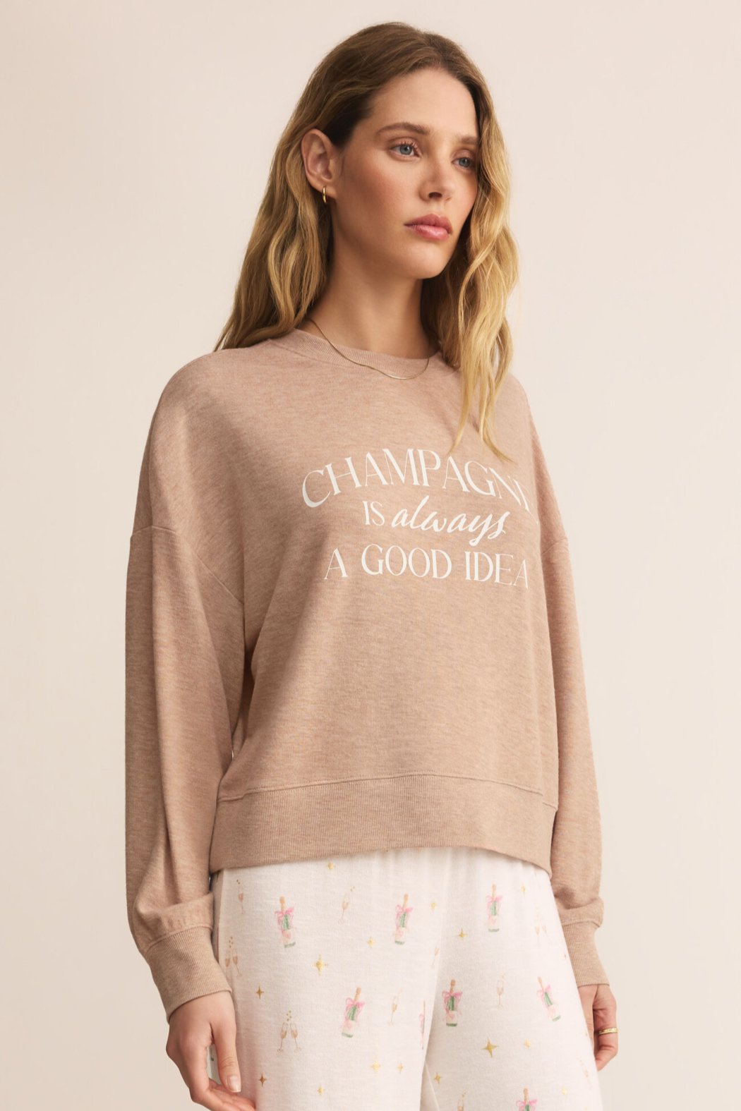 A relaxed graphic top printed with “Champagne is always a good idea,” the Champagne Long Sleeve Top offers easy everyday style. This long-sleeve pullover has a crew neckline and a slightly boxy, cropped silhouette for a cozy, lived-in look. The top is from Z Supply and pairs effortlessly with lounge pants or jeans for casual days at home or out and about.